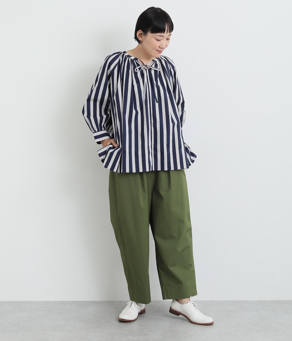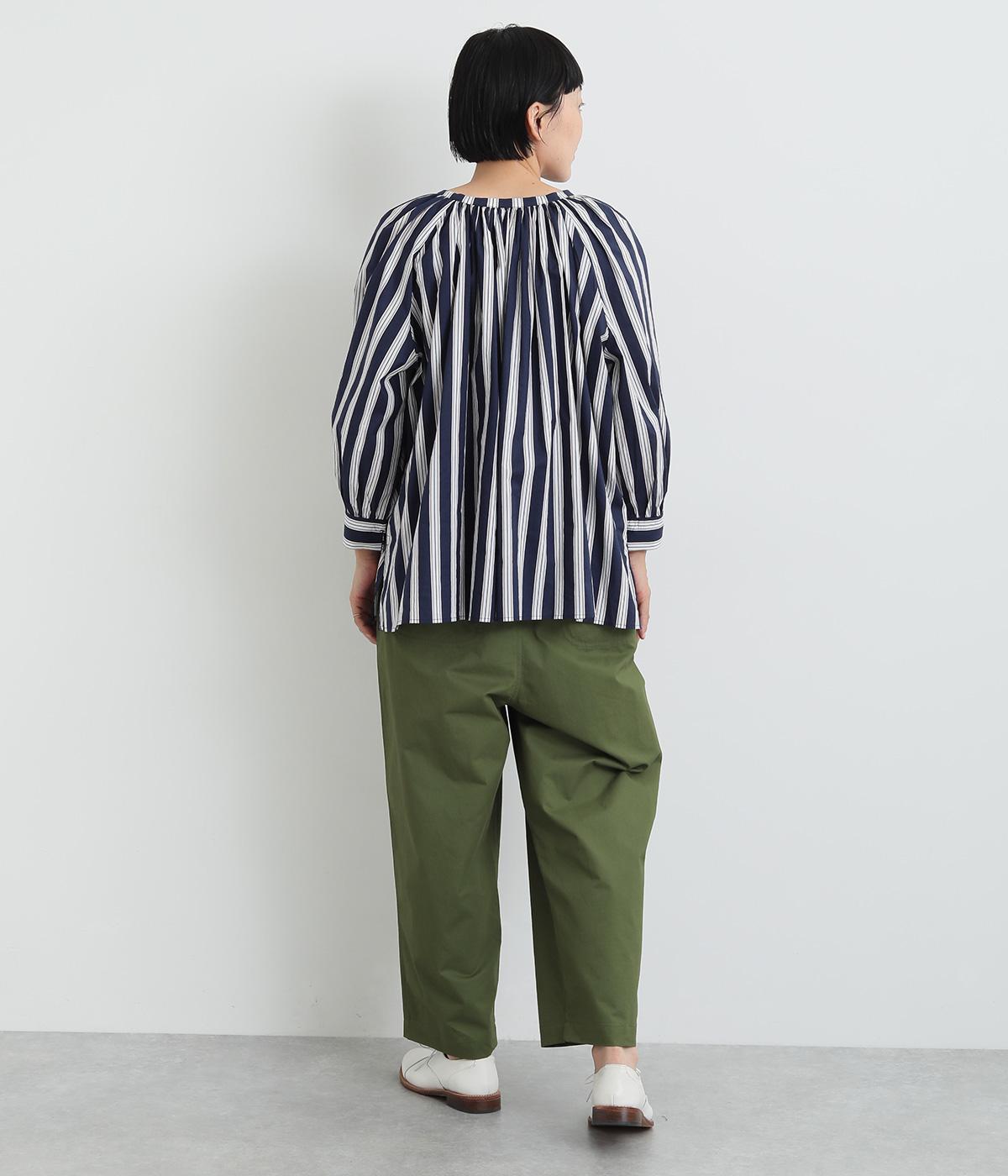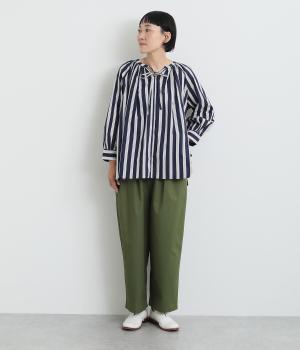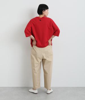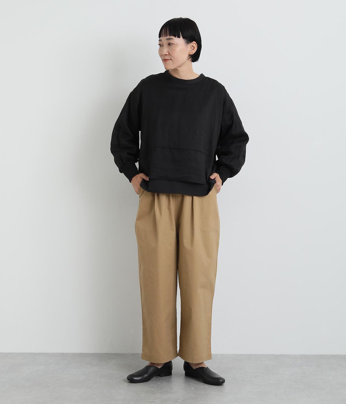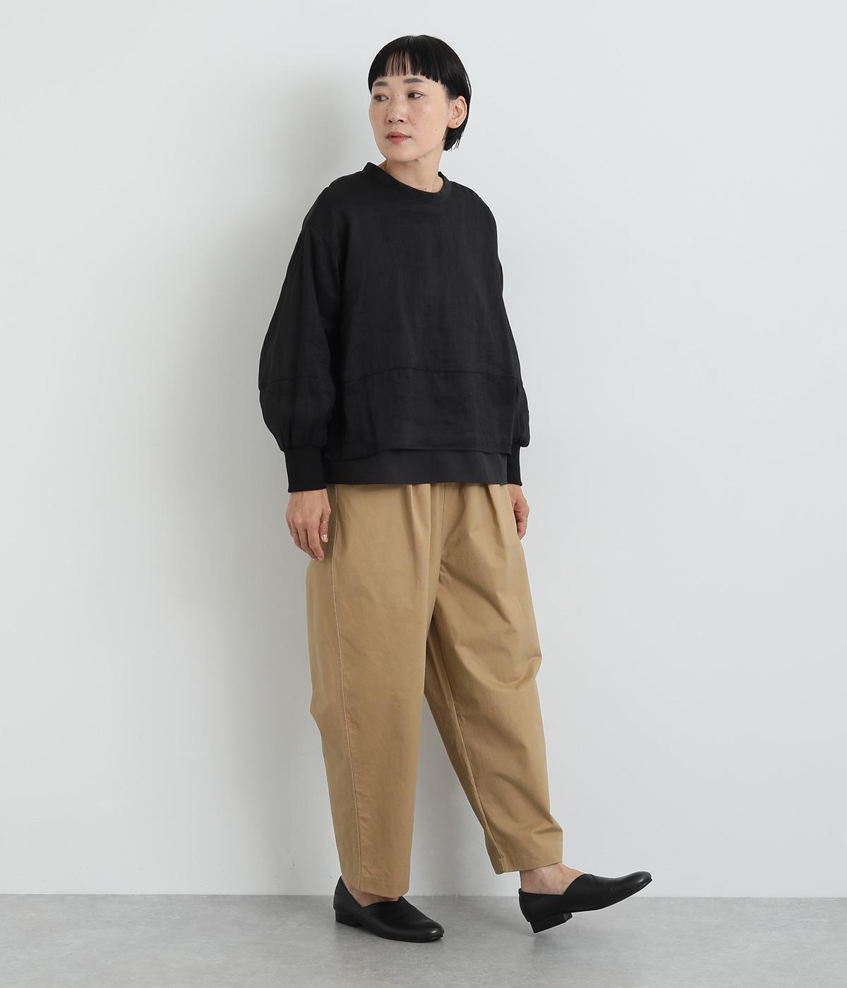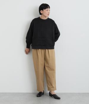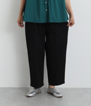 フロントにタックを入れて、腰まわりからヒップにかけてゆったりとさせたテーパードラインが特徴。はき心地のよさとすっきり見えを両方叶えてくれます。背面の切り替えラインに沿うカジュアルすぎないポケットもポイント。ウエストは総ゴム仕様、内側に紐を通しています。