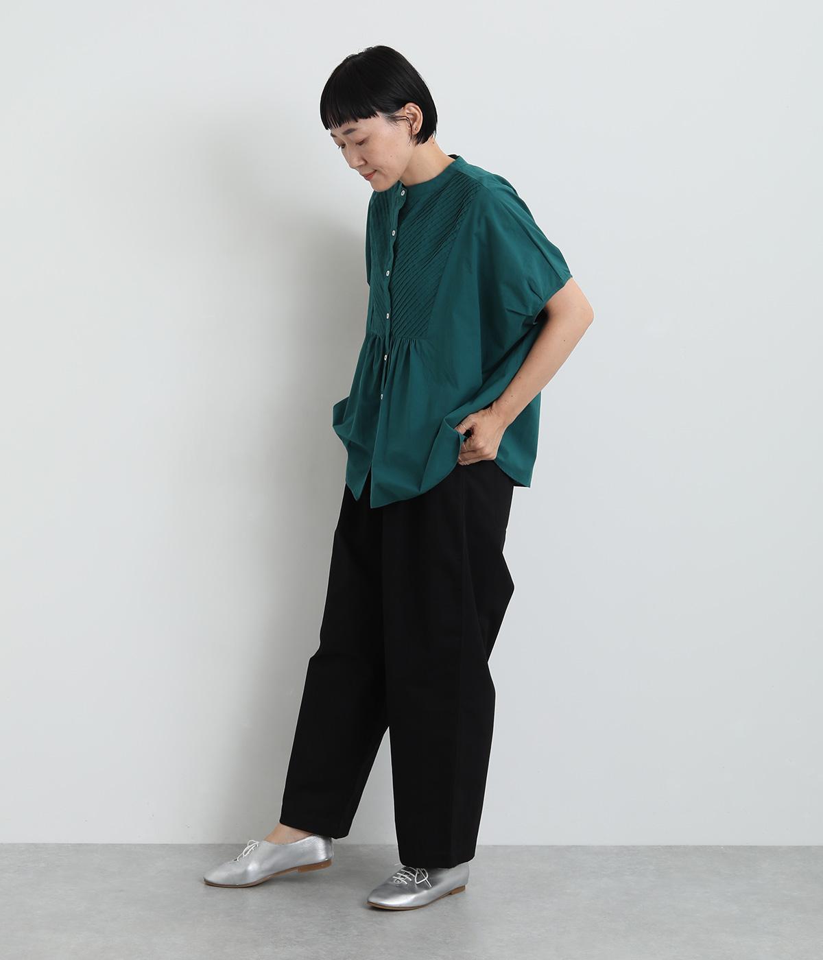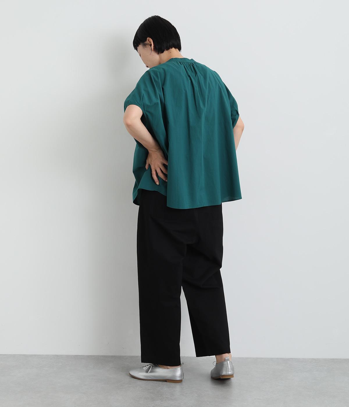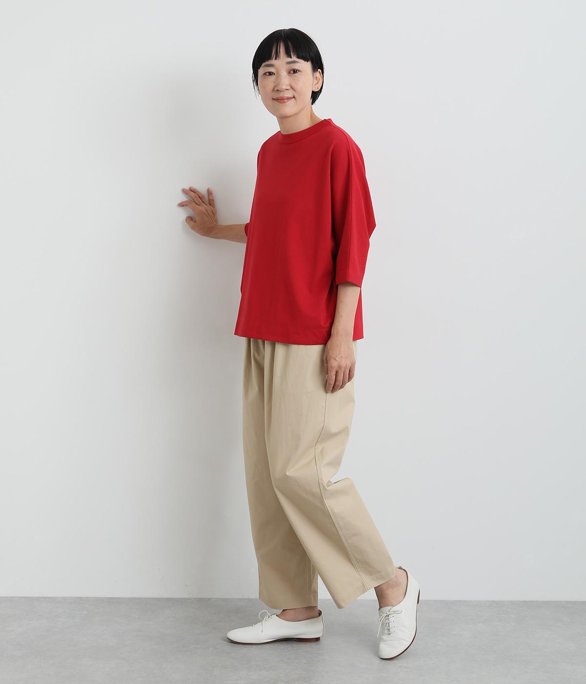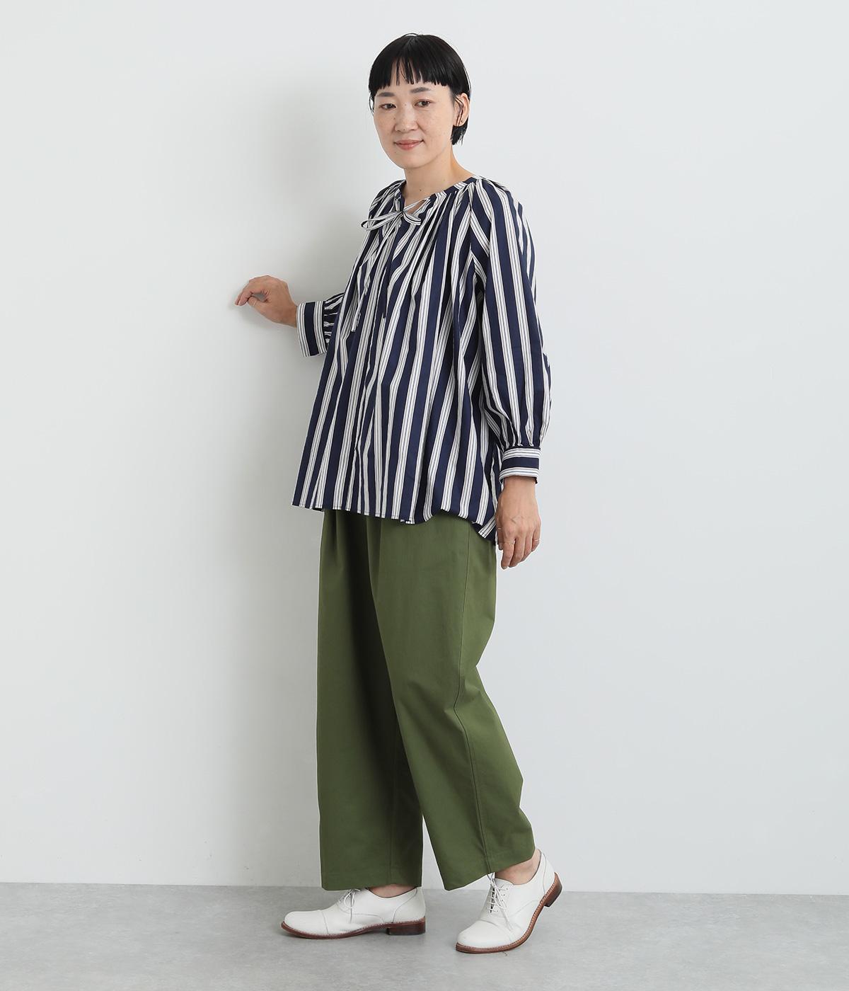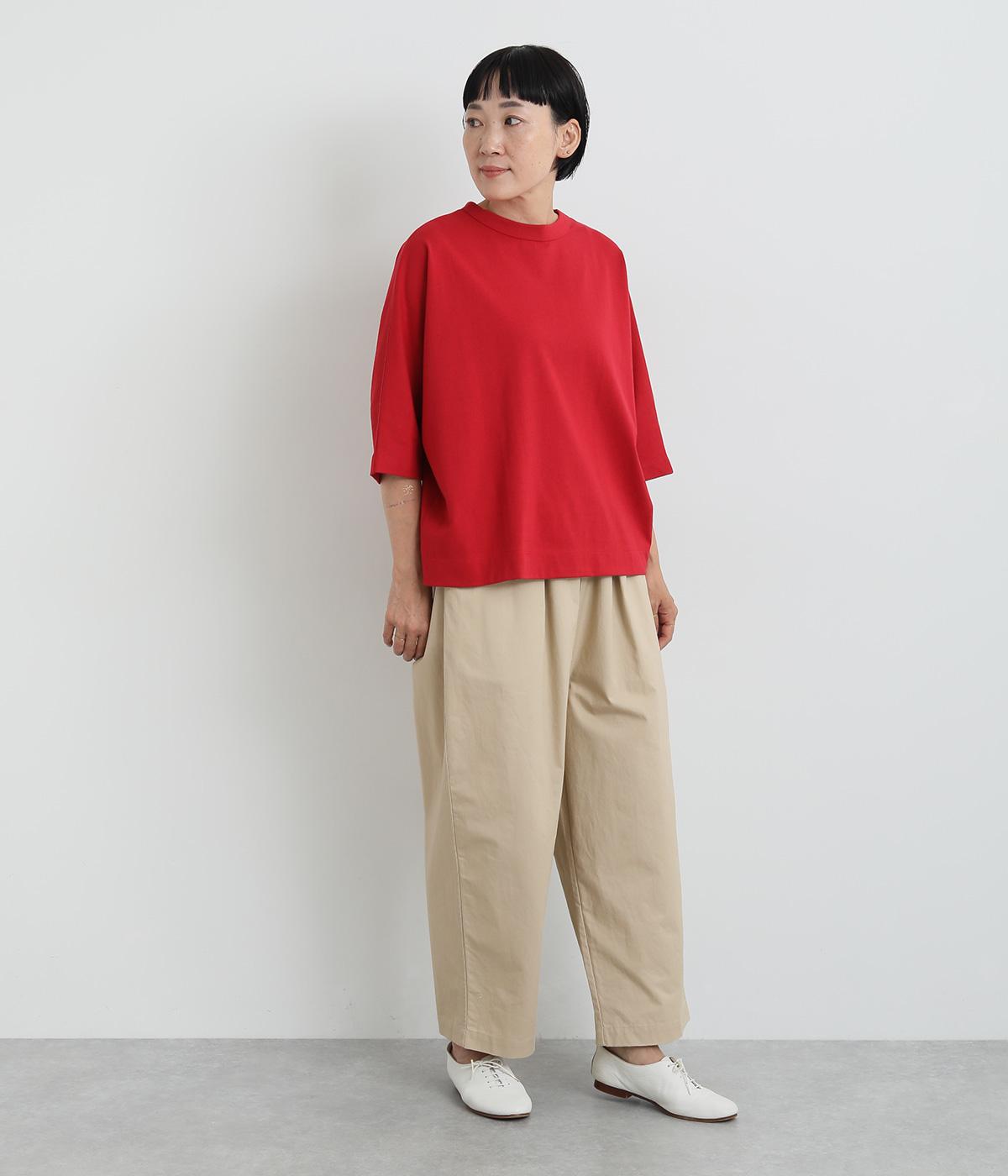 フロントにタックを入れて、腰まわりからヒップにかけてゆったりとさせたテーパードラインが特徴。はき心地のよさとすっきり見えを両方叶えてくれます。背面の切り替えラインに沿うカジュアルすぎないポケットもポイント。ウエストは総ゴム仕様、内側に紐を通しています。