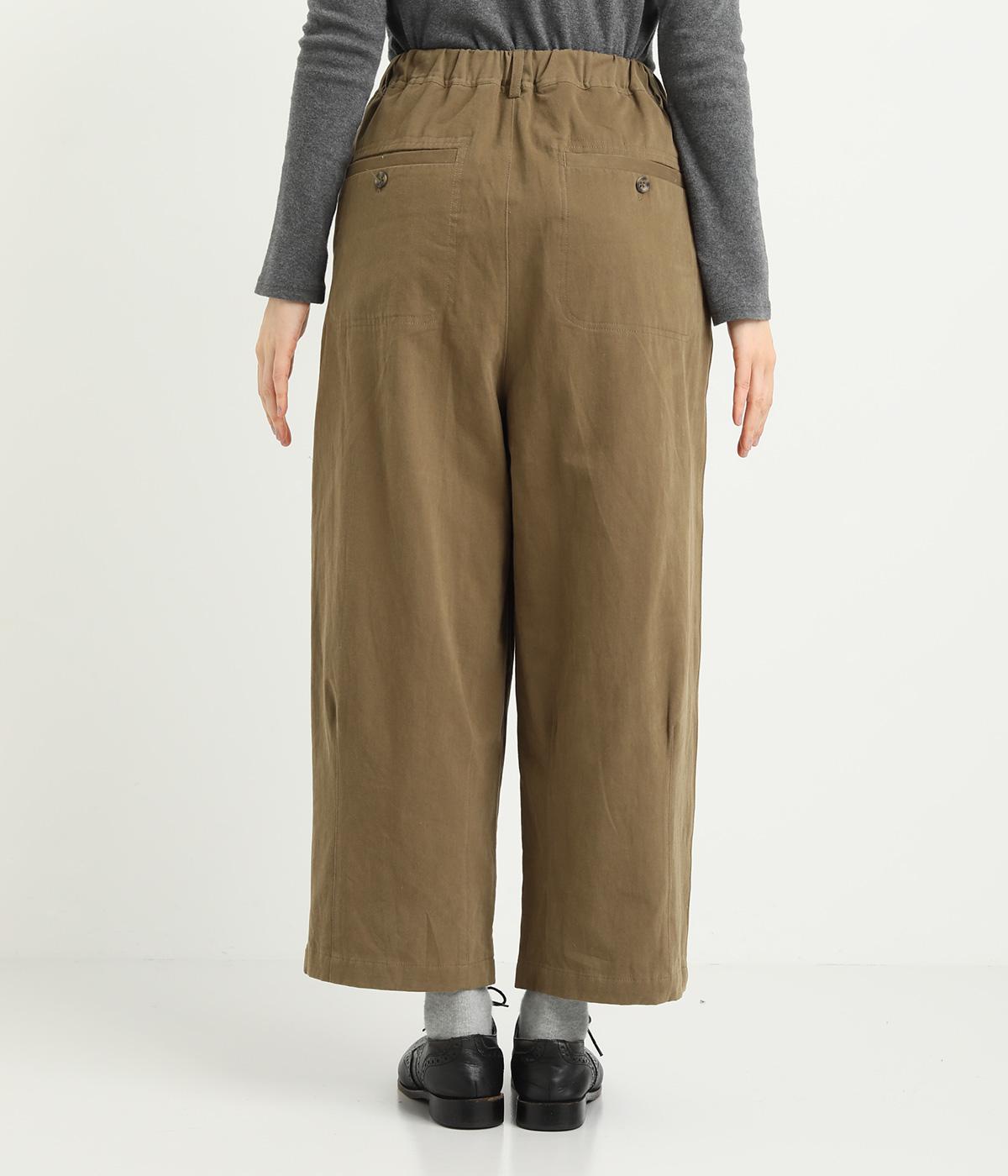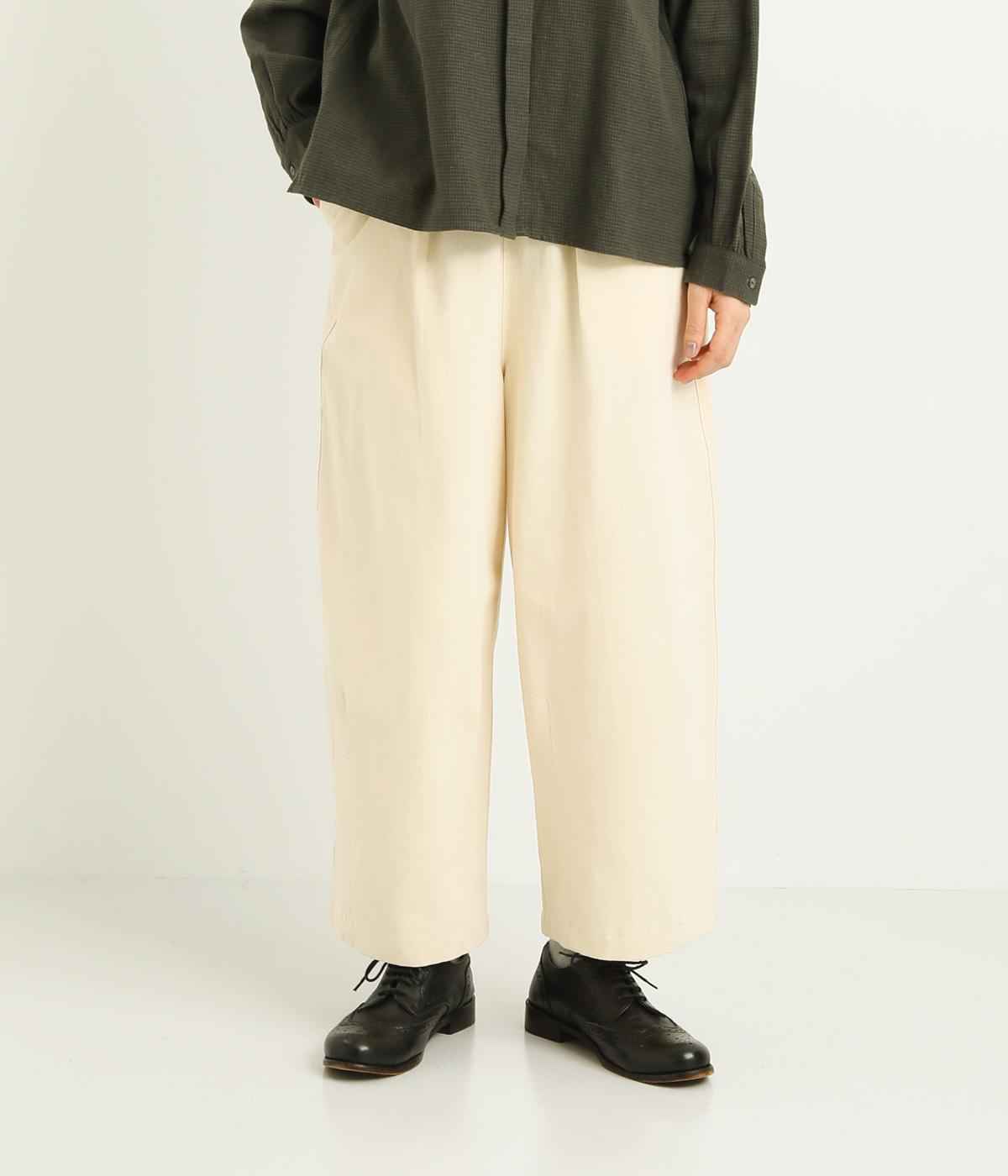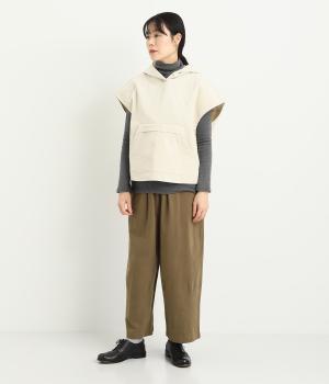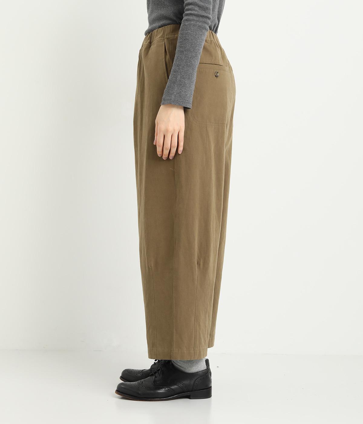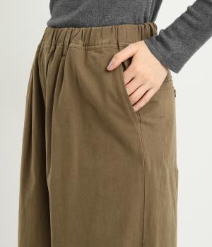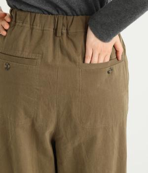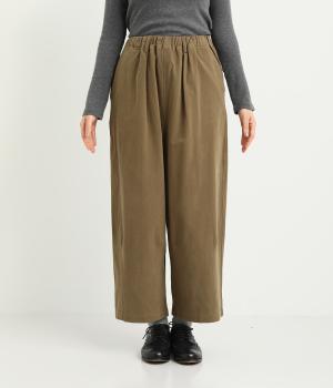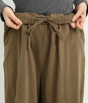 腰まわりは適度にゆったりと、裾はダーツを入れてすっきりバランスよくまとめたパンツ。素材の持つ風合いを活かしたシンプルな作りで、レイヤードスタイルや柄アイテムとの合わせにも活躍。ウエストは総ゴム&内紐つきです。