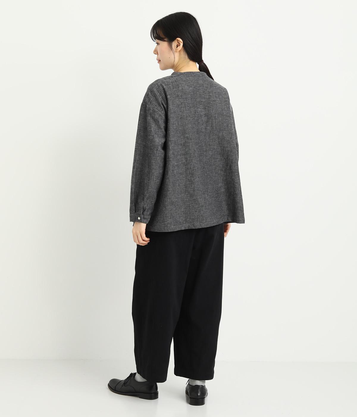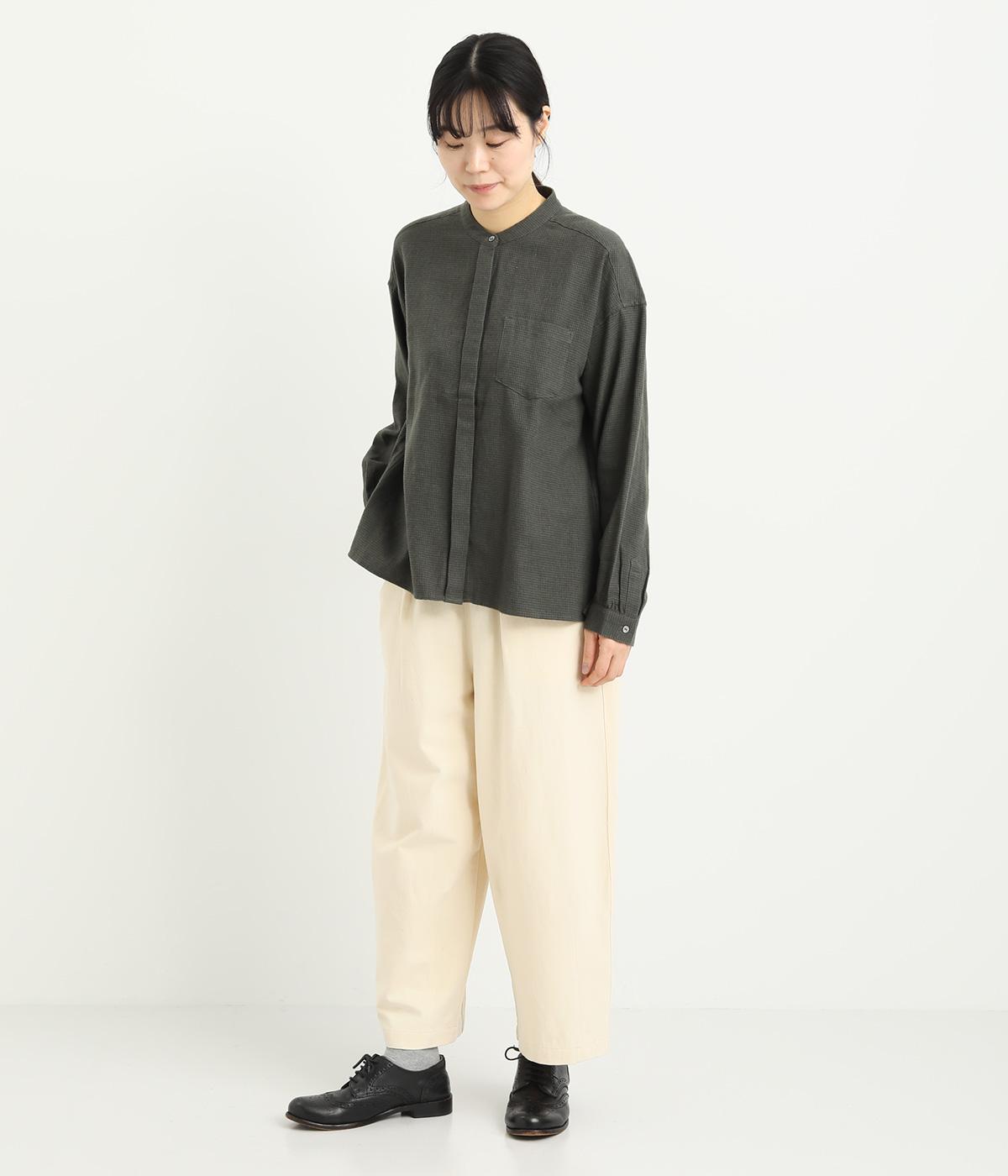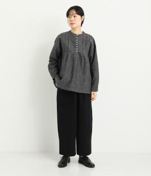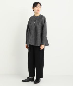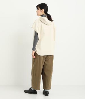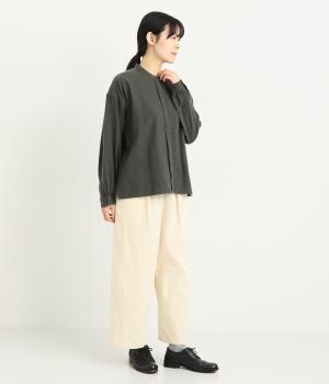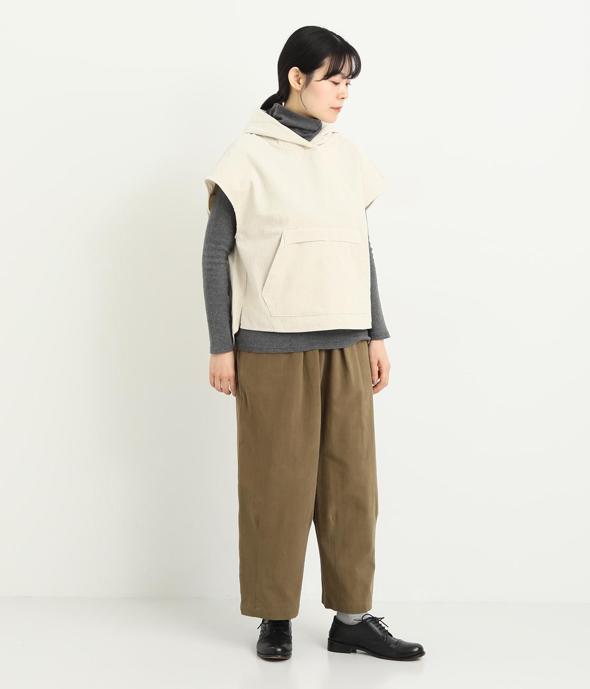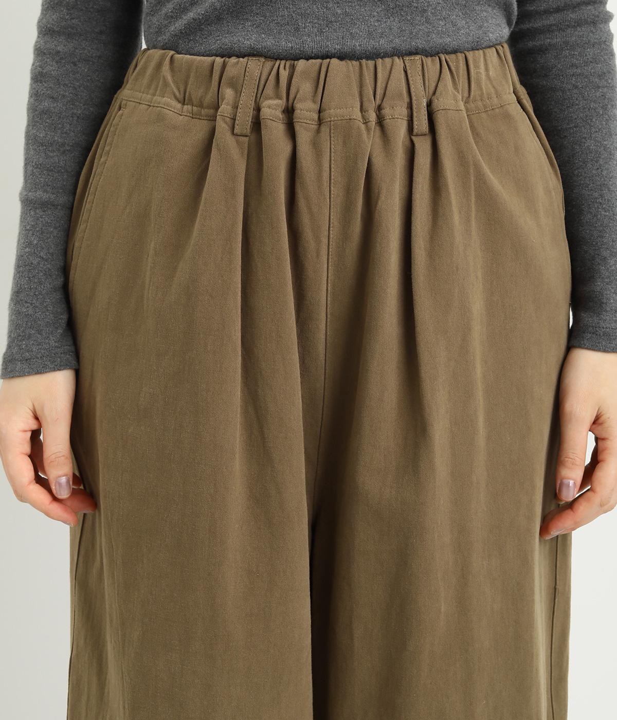 腰まわりは適度にゆったりと、裾はダーツを入れてすっきりバランスよくまとめたパンツ。素材の持つ風合いを活かしたシンプルな作りで、レイヤードスタイルや柄アイテムとの合わせにも活躍。ウエストは総ゴム&内紐つきです。