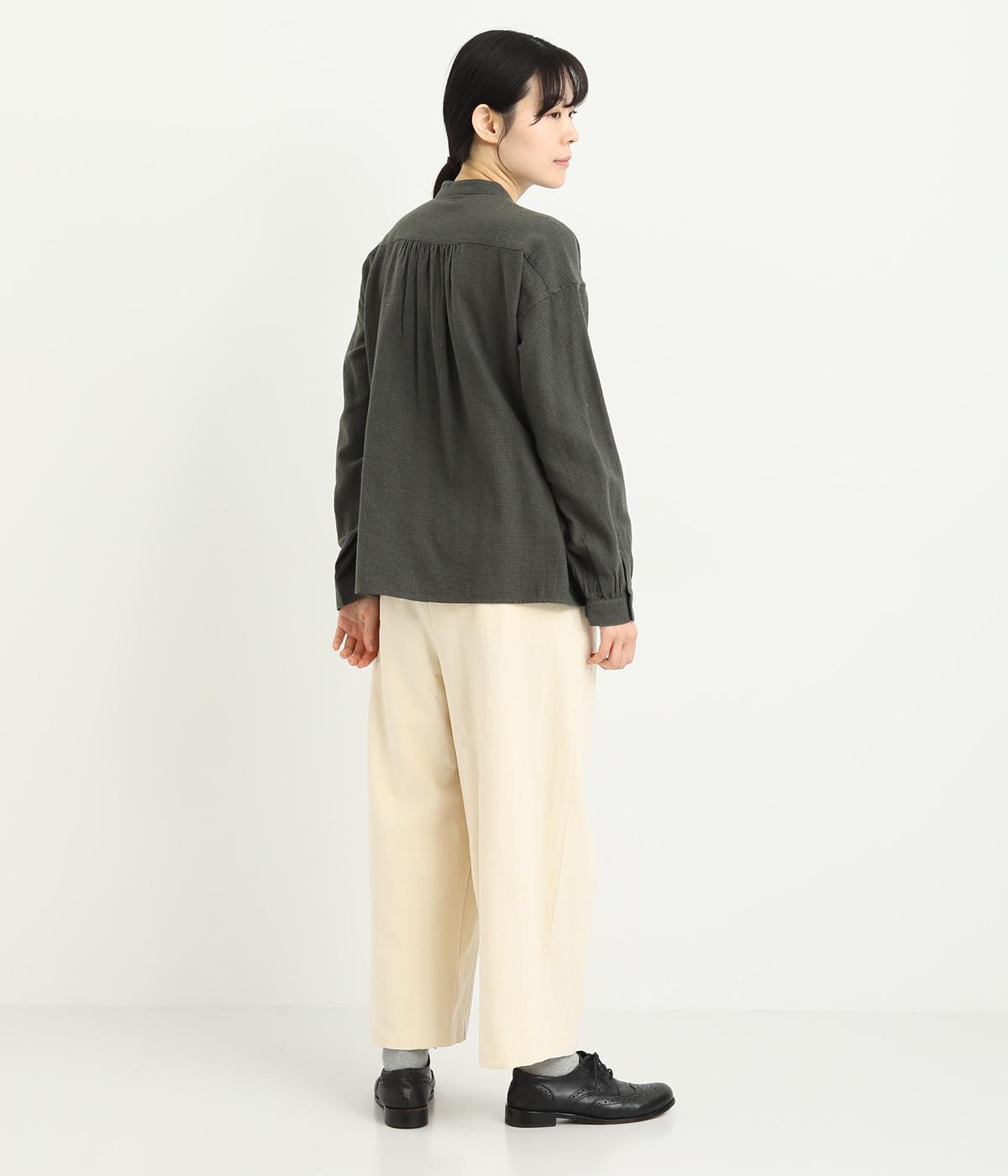 デイリー使いしやすいタフなコットン生地にピーチ起毛をかけて、ほんのりとしたあたたかみと優しい風合いをプラス。厚手すぎずはきやすい仕上がりです。