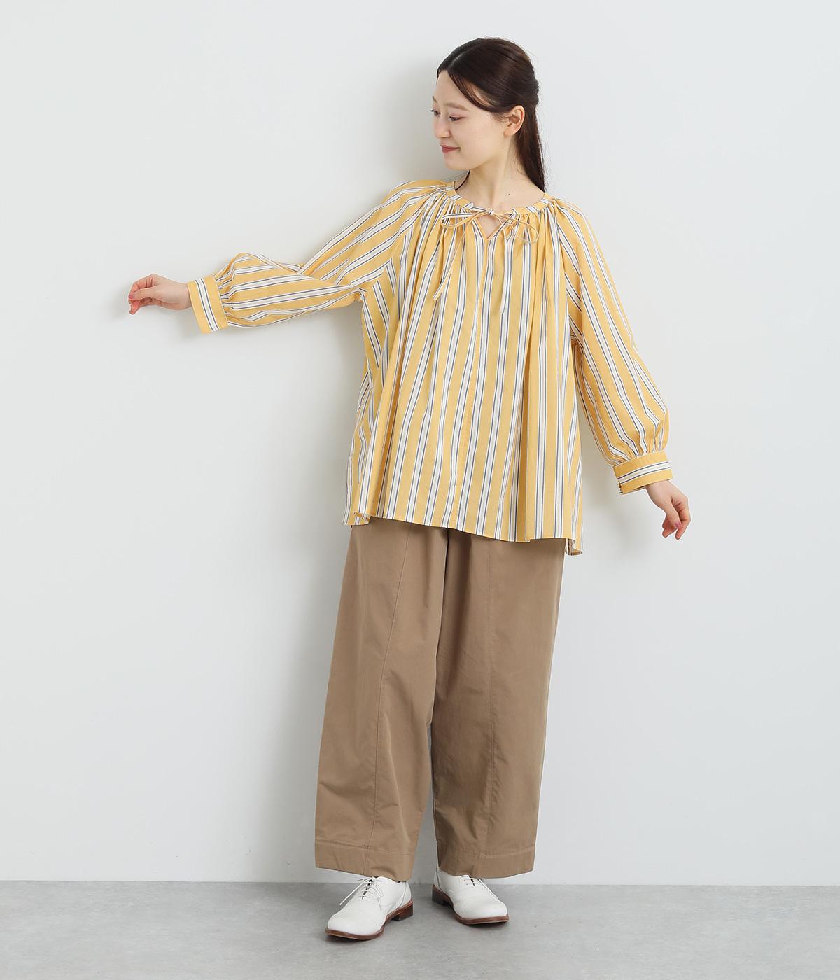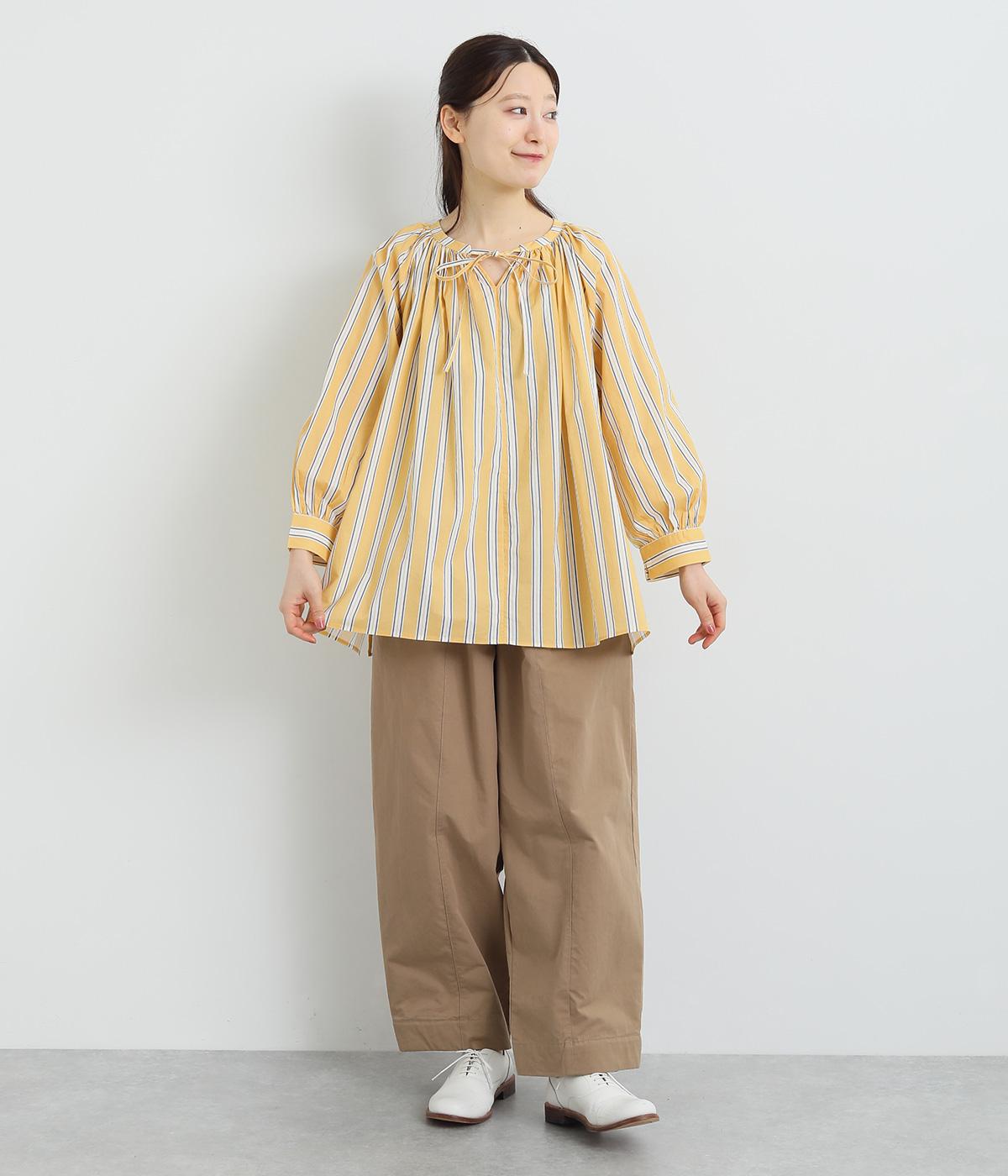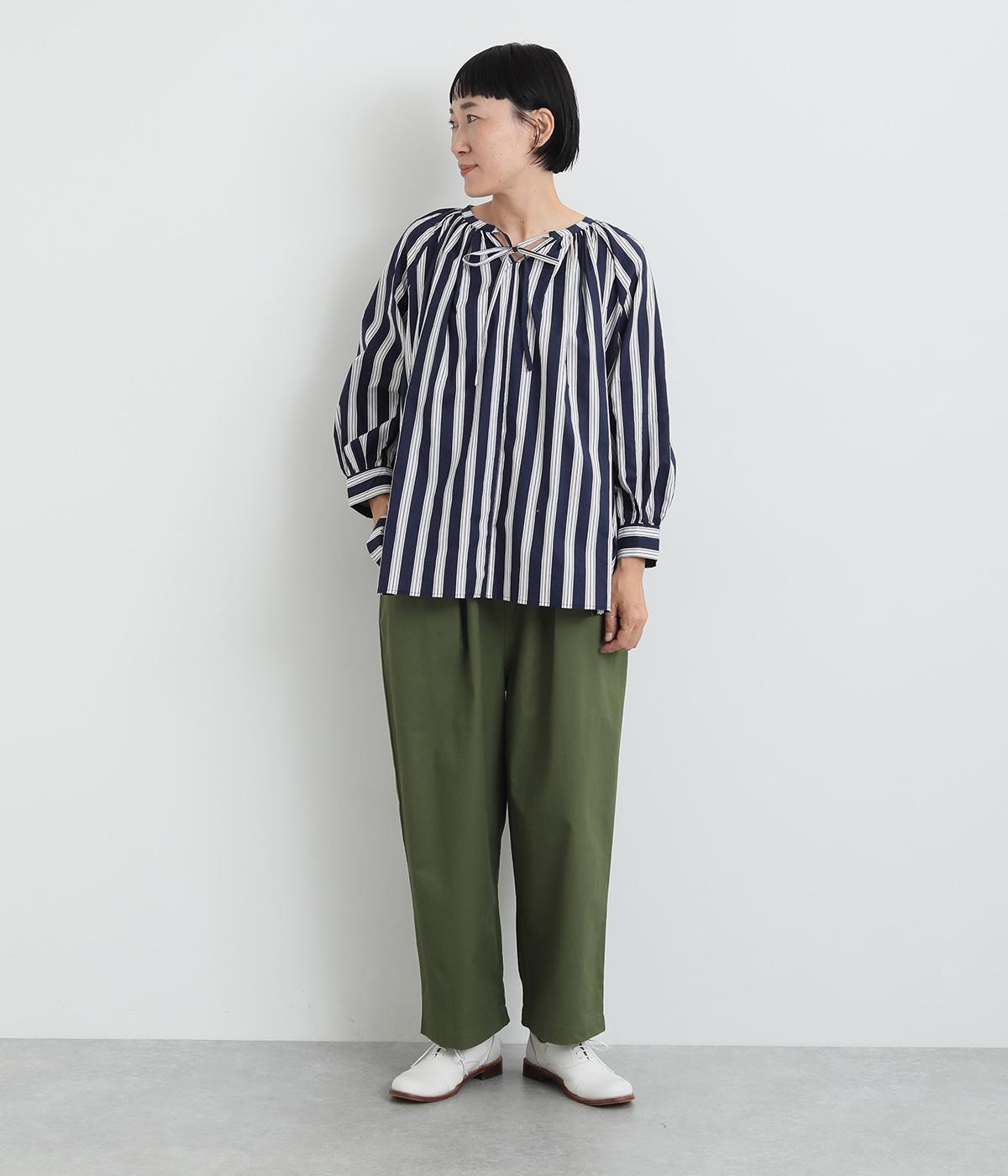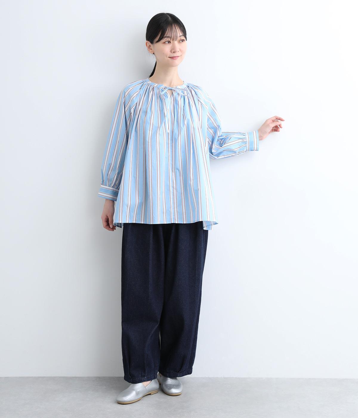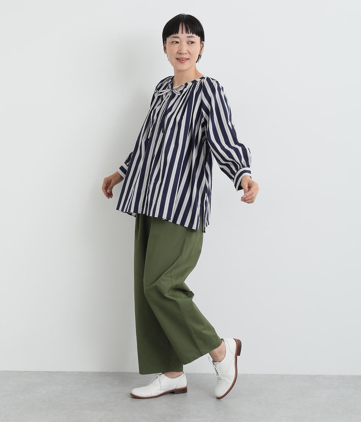 コーディネートを軽やかな印象に仕上げるストライプ柄のブラウス。ネックまわりにたっぷりとギャザーを入れてリボンを通し、愛らしいムードを加えています。体のラインを拾いにくいゆったりとしたシルエットがグッド。裾両サイドの深めのスリットを入れた横姿も素敵です。