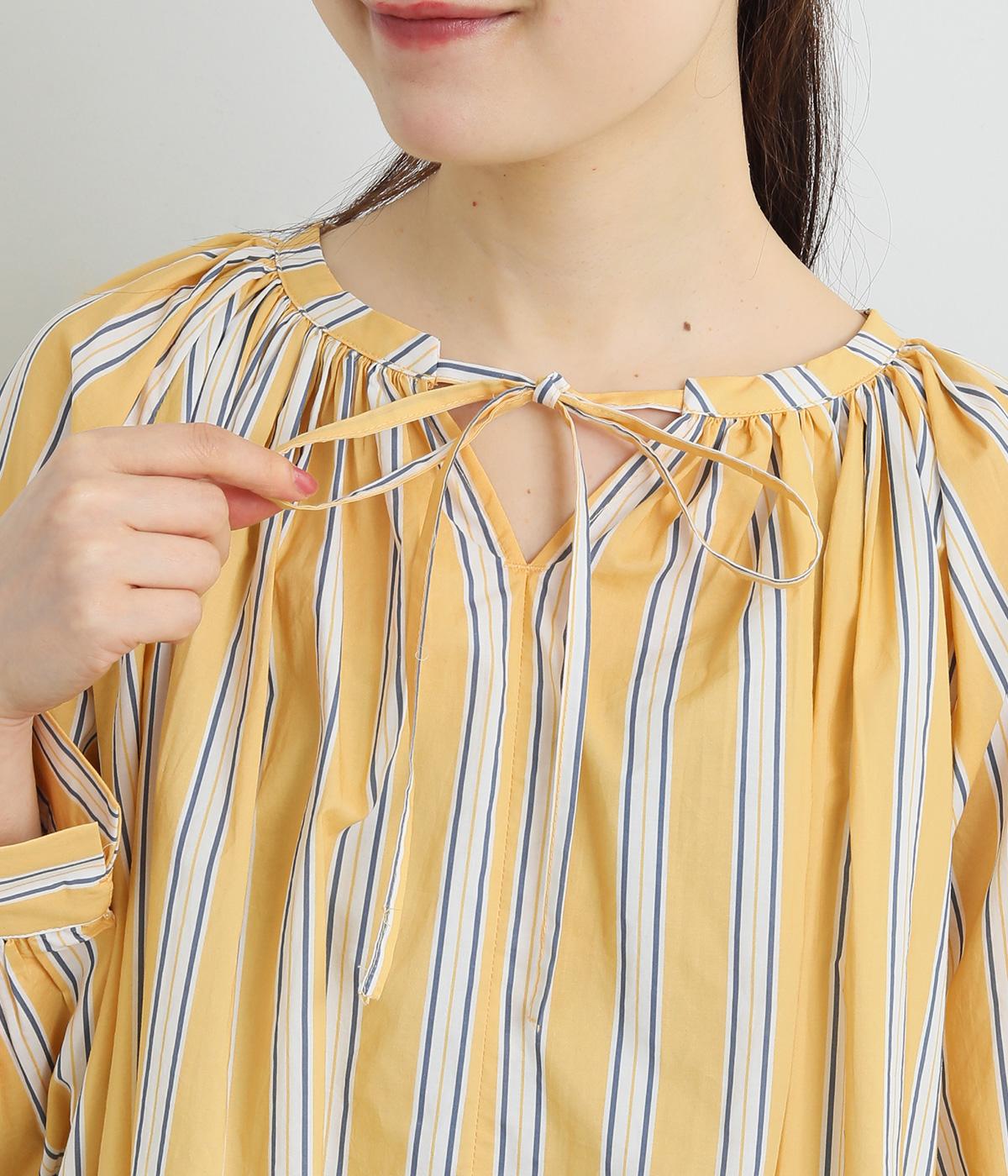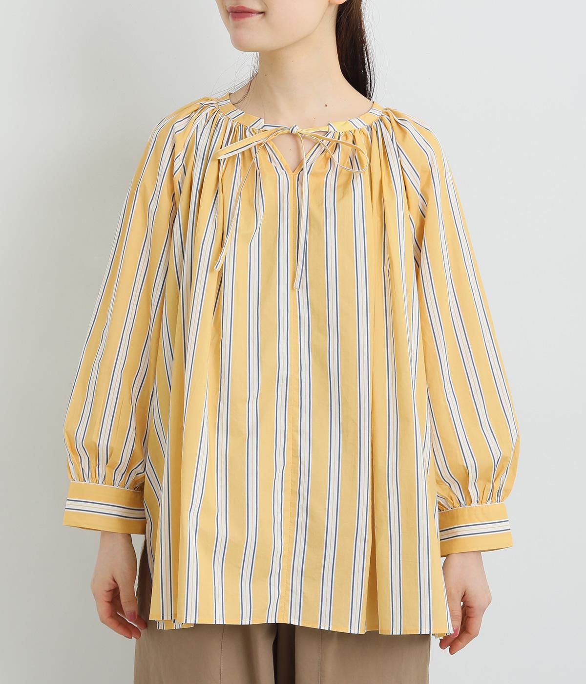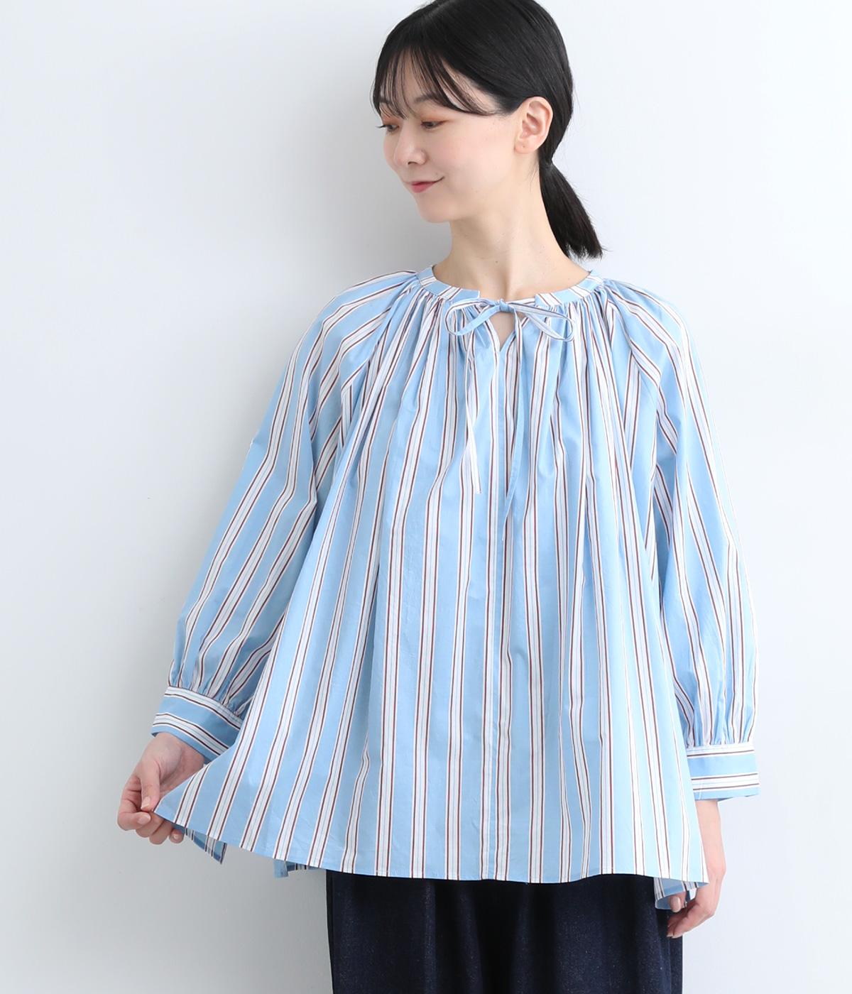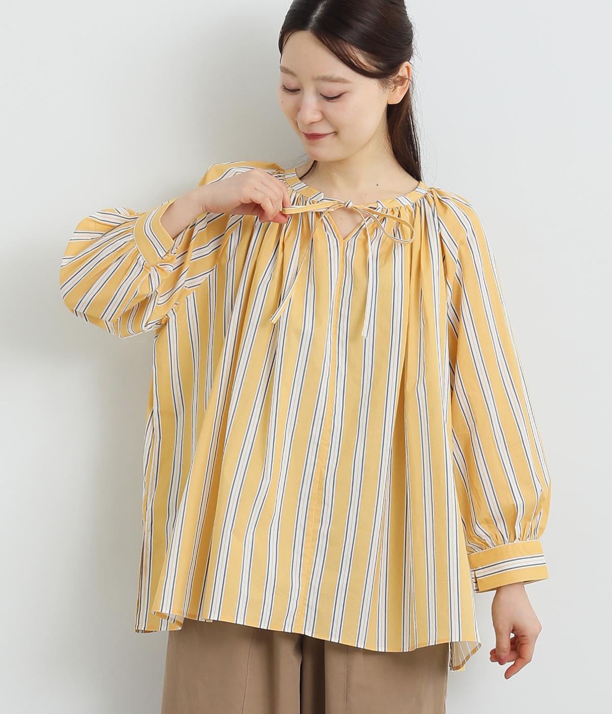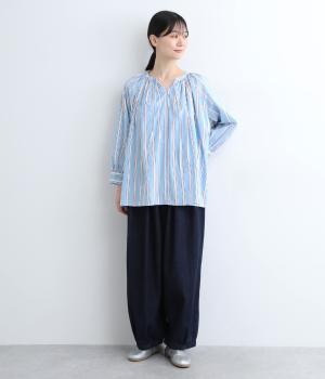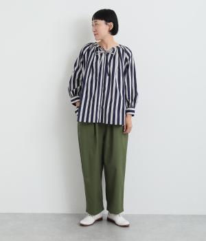 コーディネートを軽やかな印象に仕上げるストライプ柄のブラウス。ネックまわりにたっぷりとギャザーを入れてリボンを通し、愛らしいムードを加えています。体のラインを拾いにくいゆったりとしたシルエットがグッド。裾両サイドの深めのスリットを入れた横姿も素敵です。