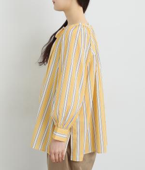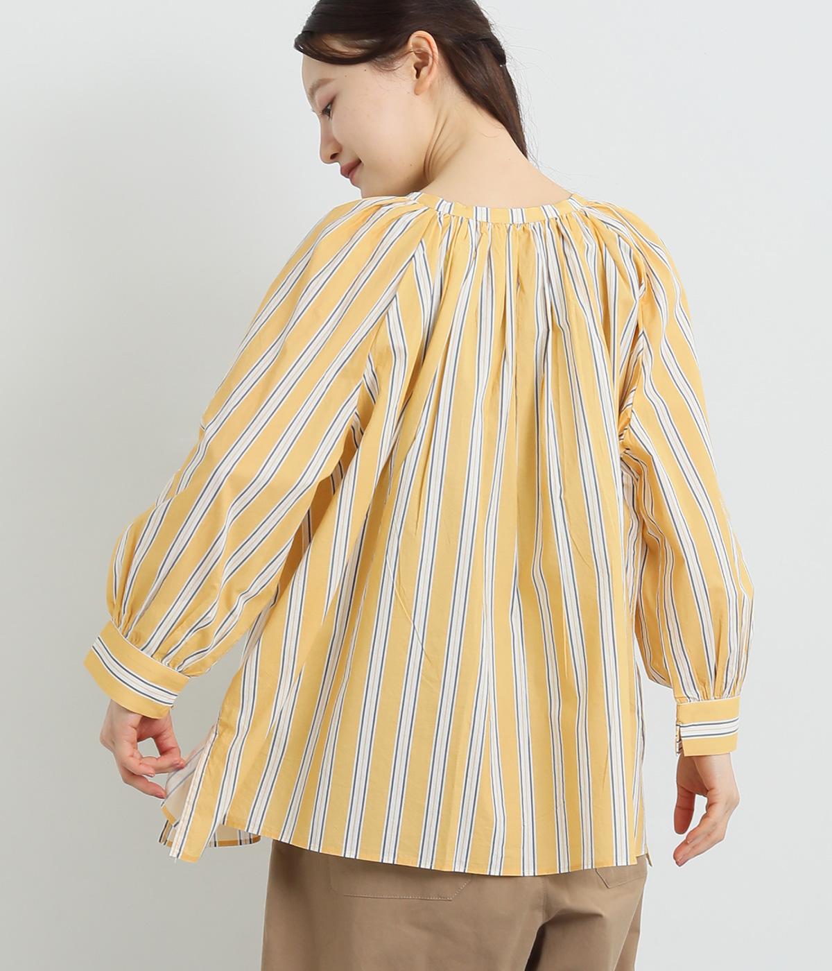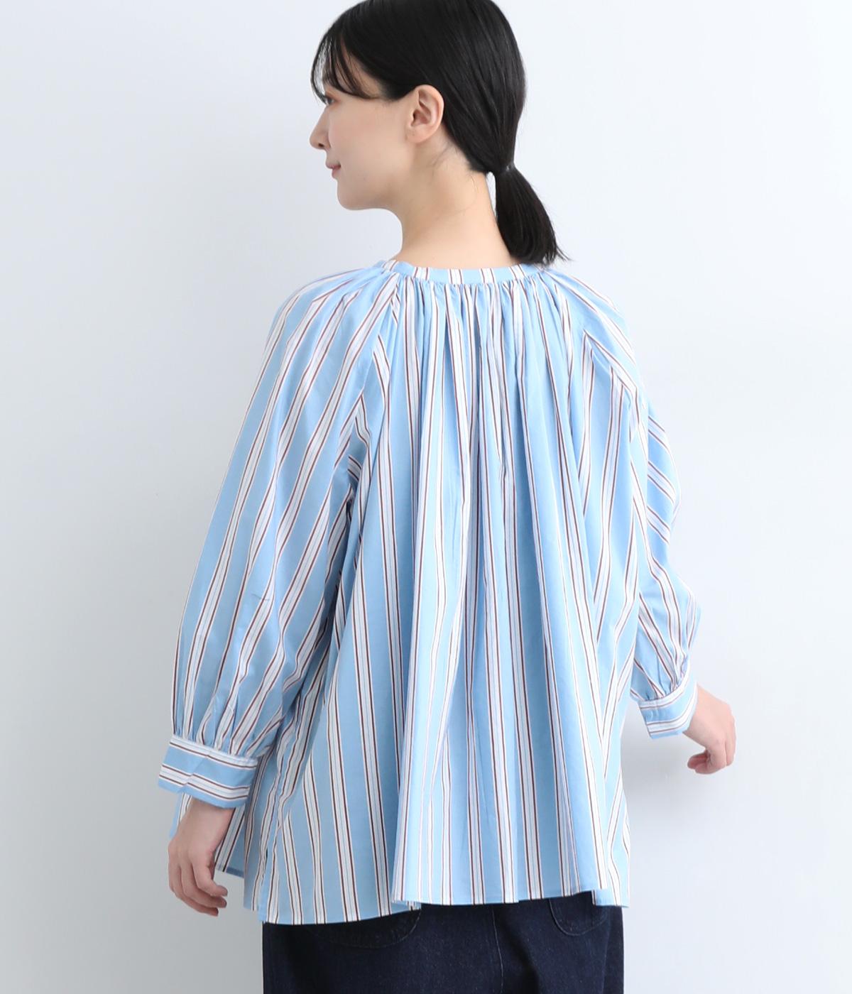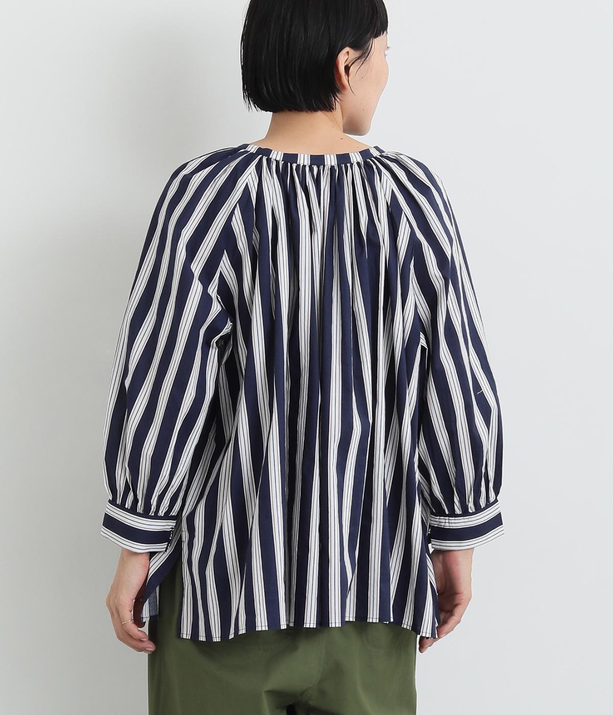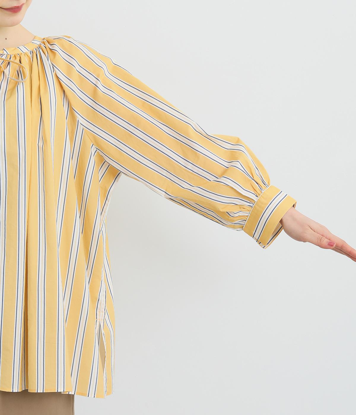 コーディネートを軽やかな印象に仕上げるストライプ柄のブラウス。ネックまわりにたっぷりとギャザーを入れてリボンを通し、愛らしいムードを加えています。体のラインを拾いにくいゆったりとしたシルエットがグッド。裾両サイドの深めのスリットを入れた横姿も素敵です。