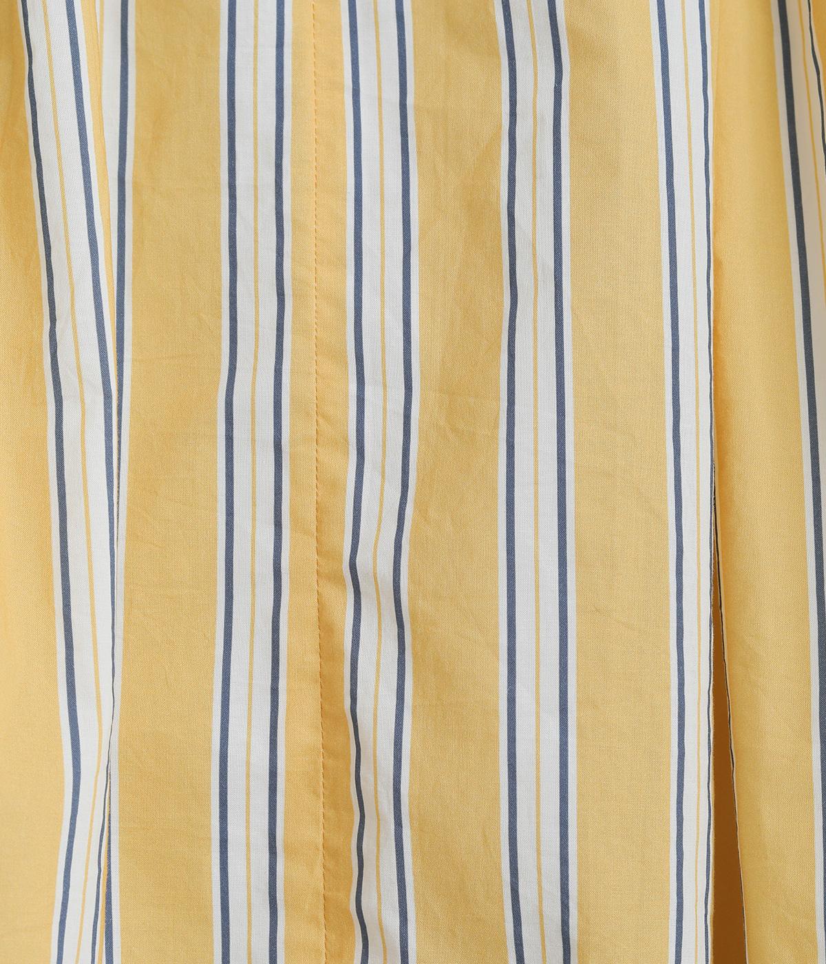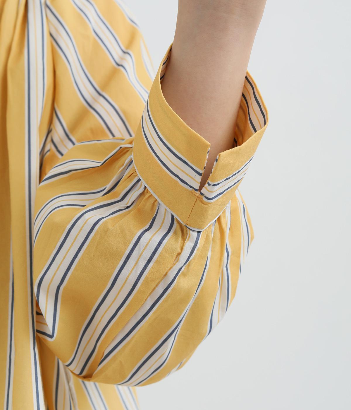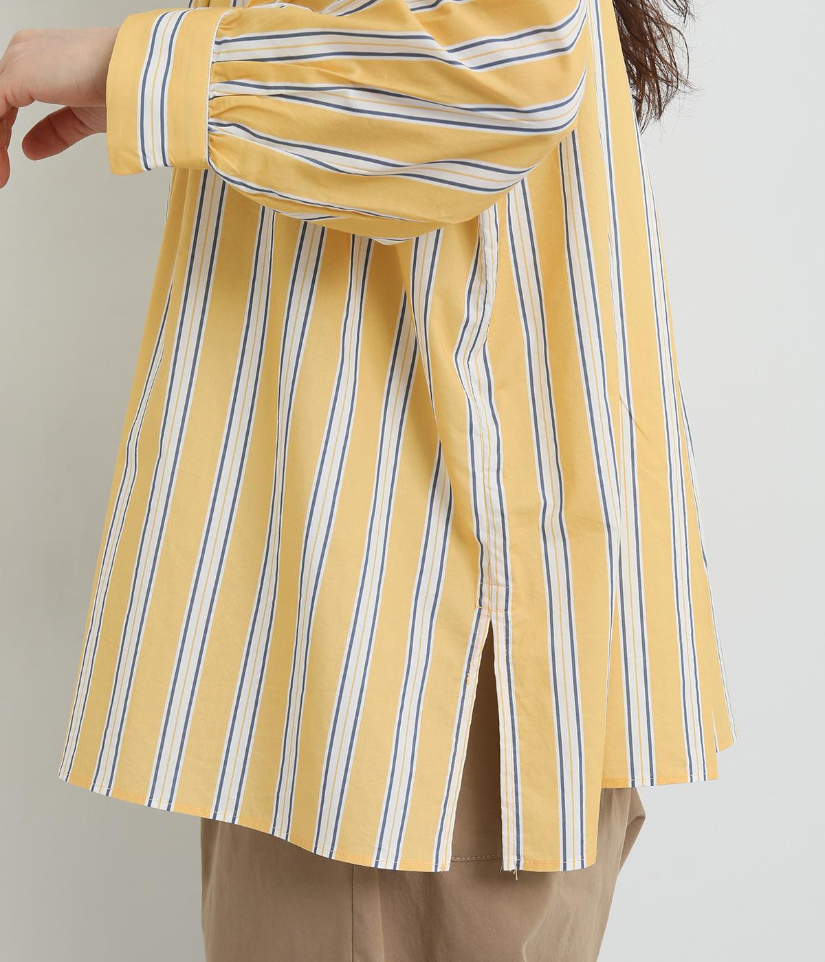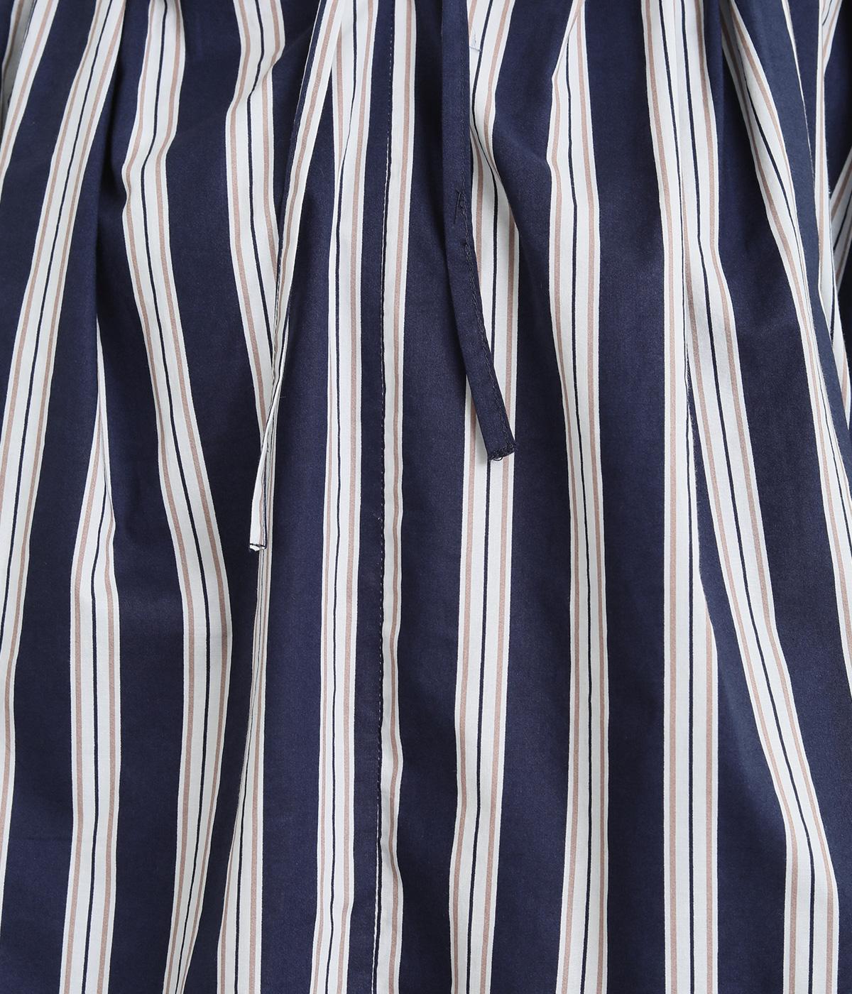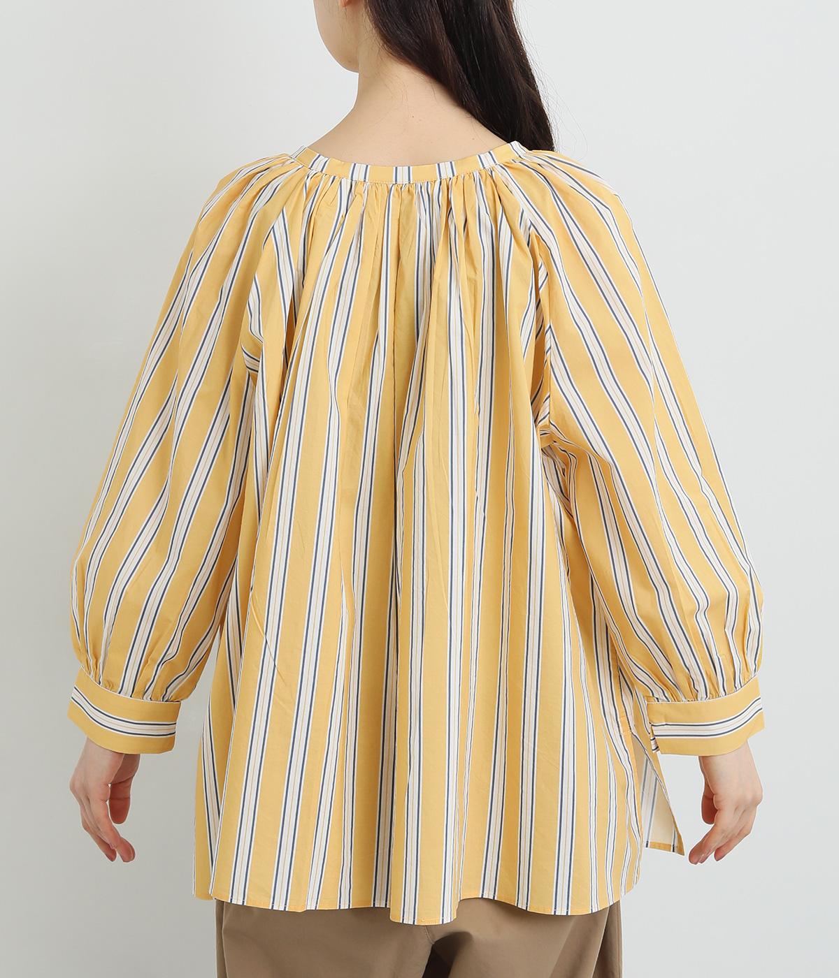 コーディネートを軽やかな印象に仕上げるストライプ柄のブラウス。ネックまわりにたっぷりとギャザーを入れてリボンを通し、愛らしいムードを加えています。体のラインを拾いにくいゆったりとしたシルエットがグッド。裾両サイドの深めのスリットを入れた横姿も素敵です。