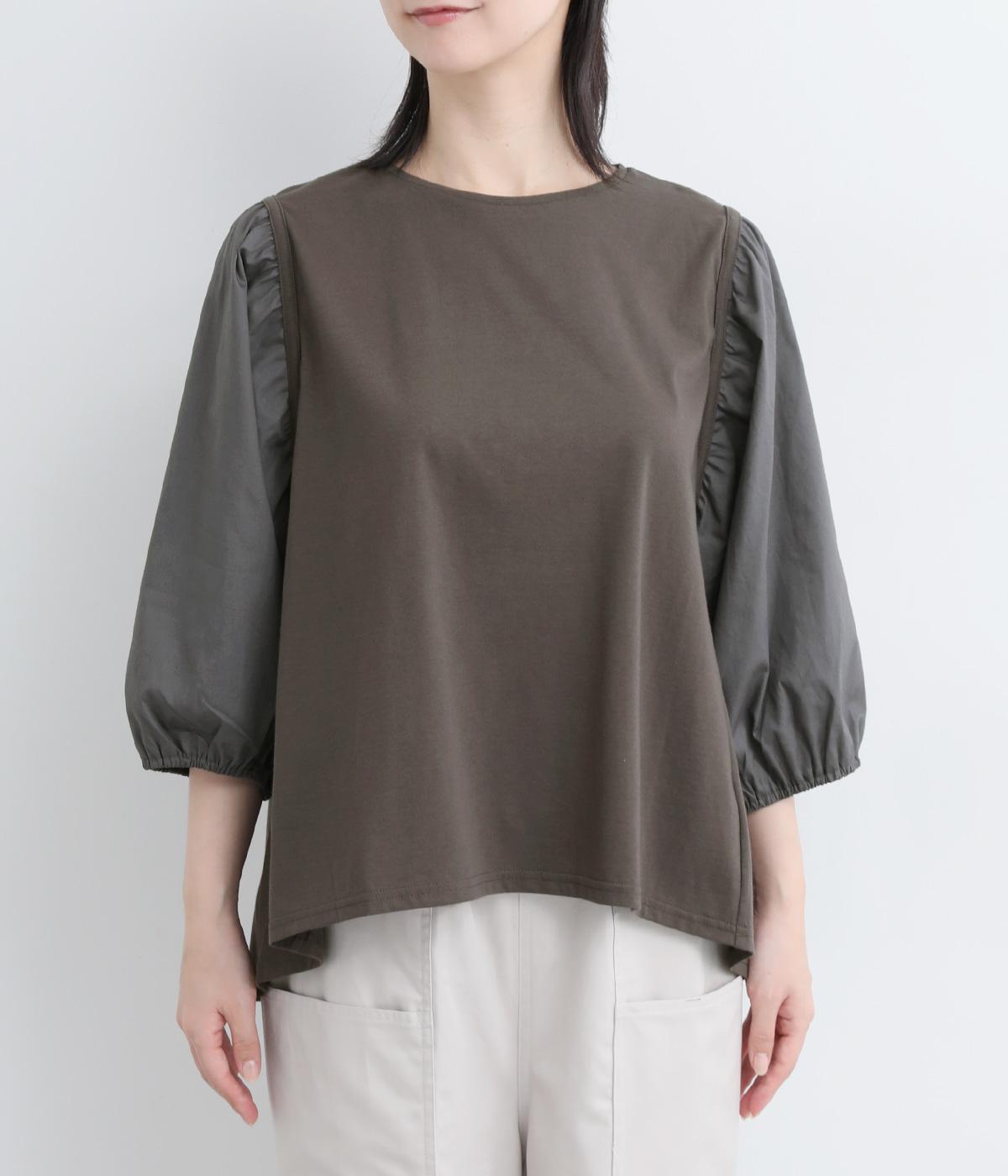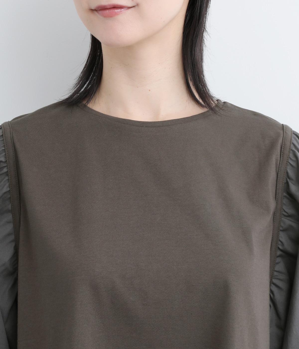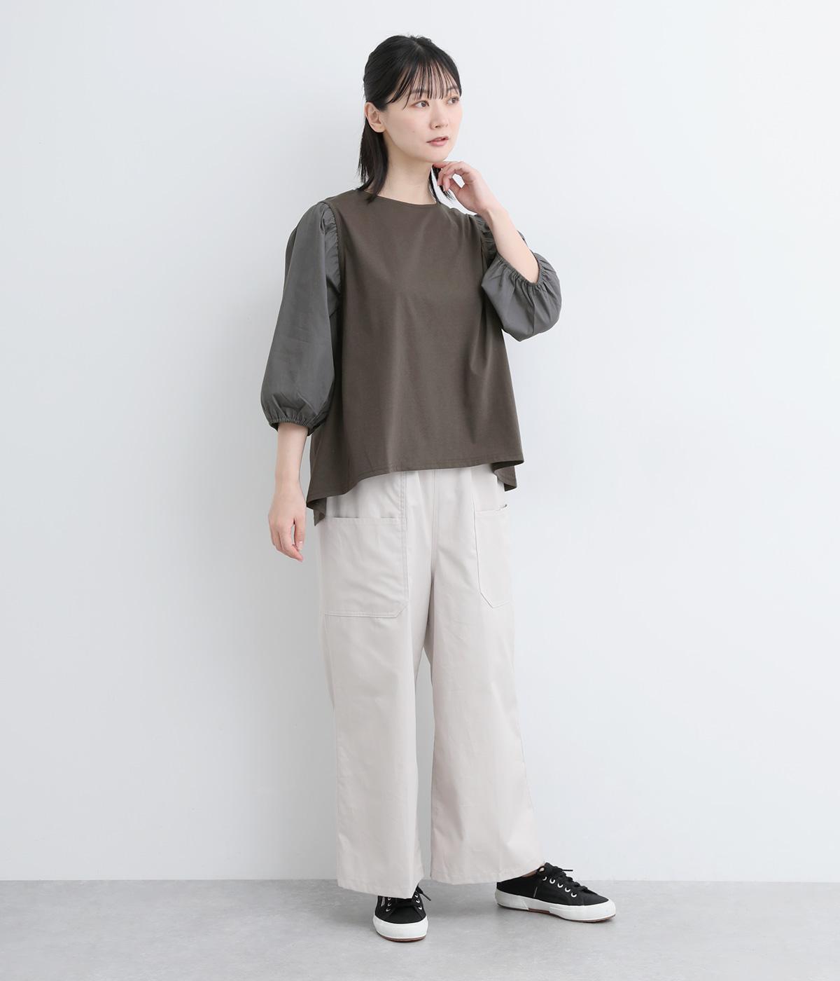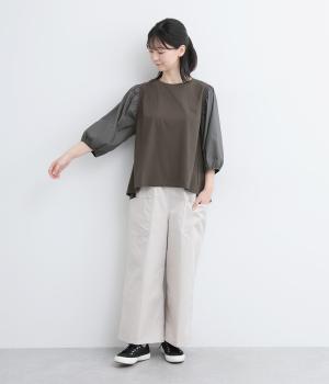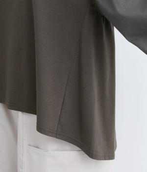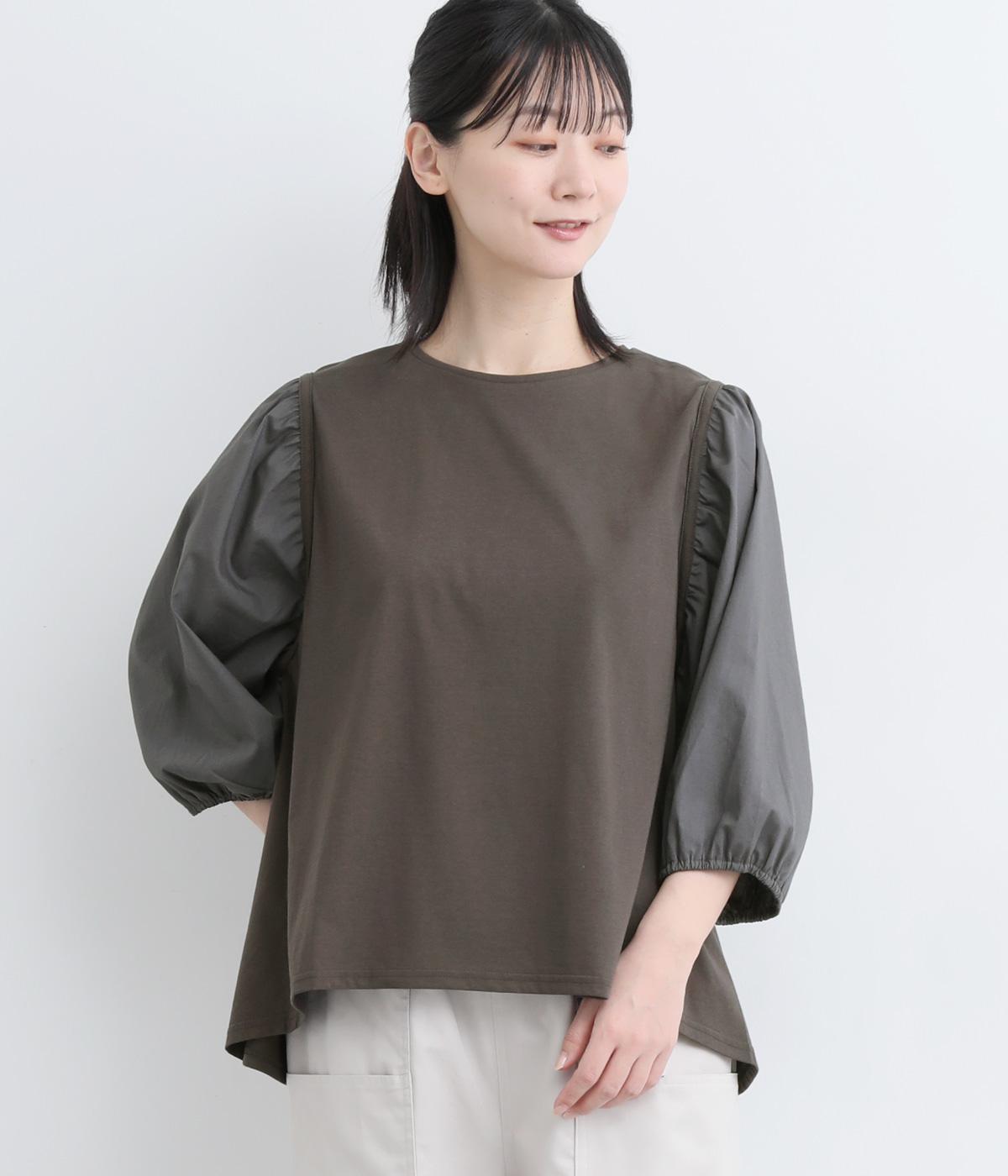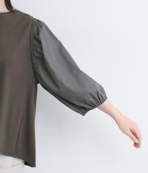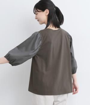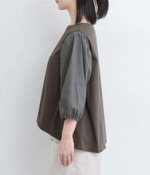 前後の身生地はやわらかく着心地のいいカットソーを、袖にはさらさらとした風合いの布帛を使用した異素材ミックス。着心地のよさと着映えを兼ね備えた一枚です。