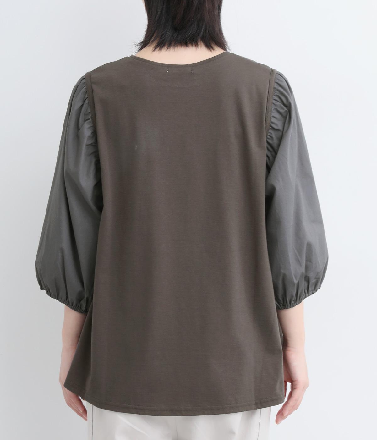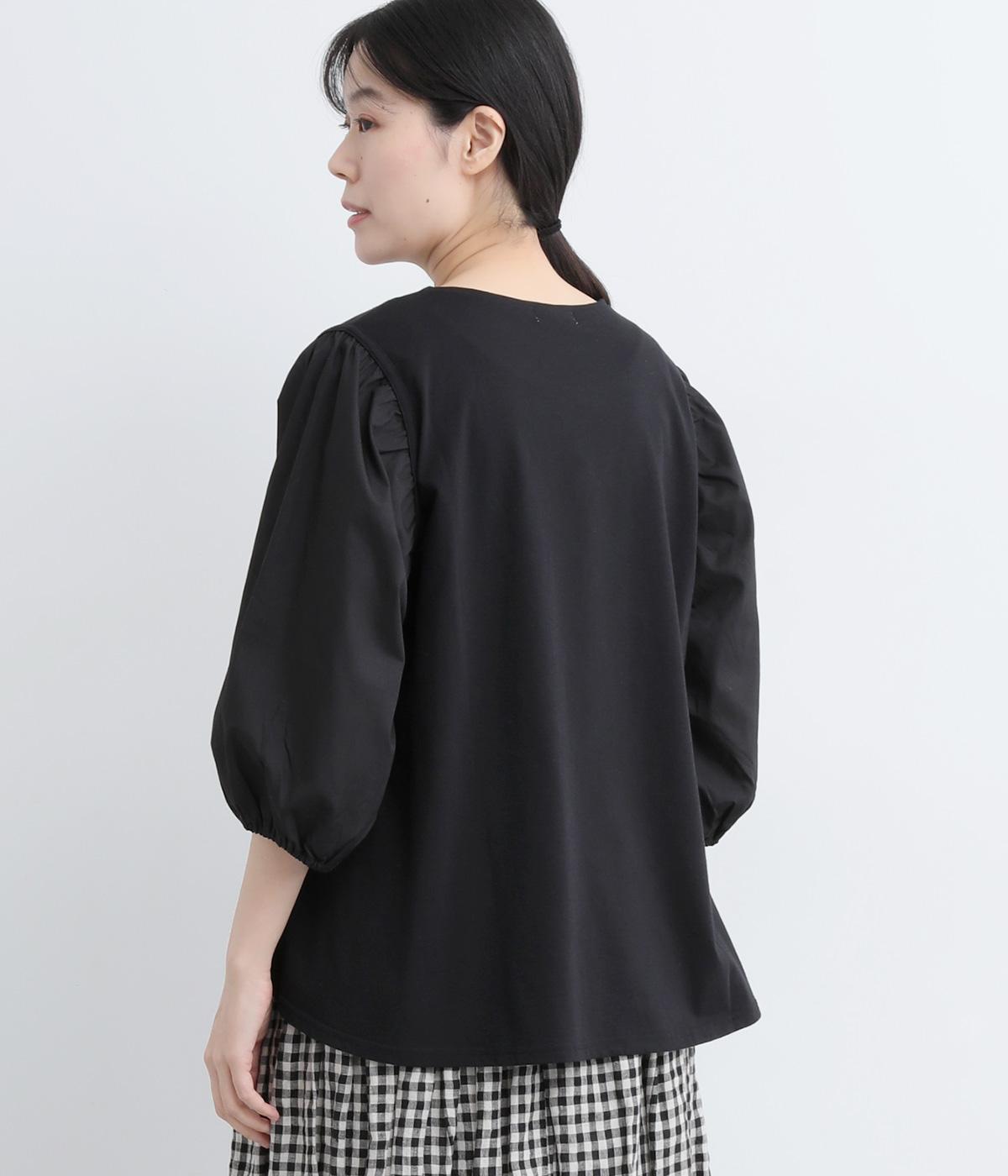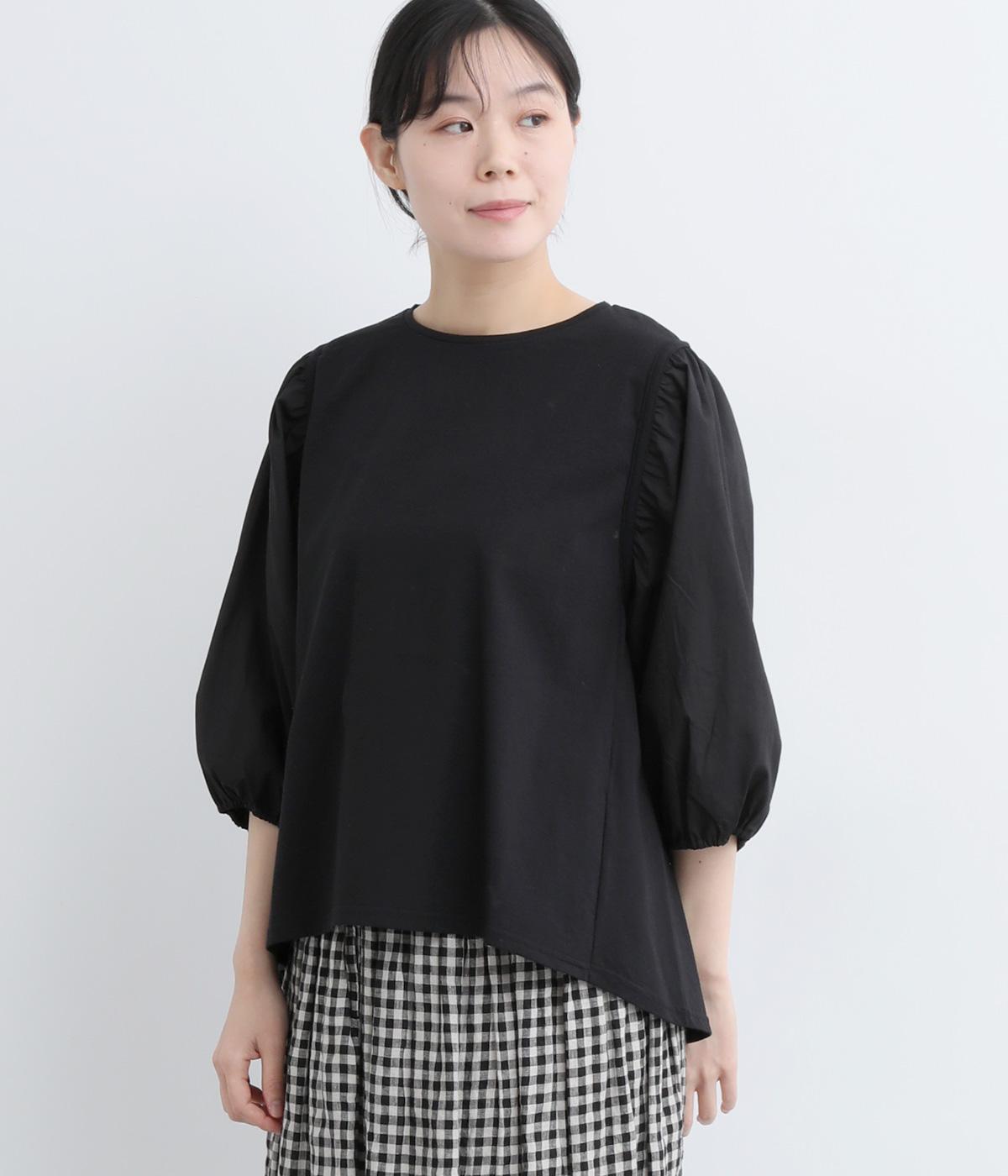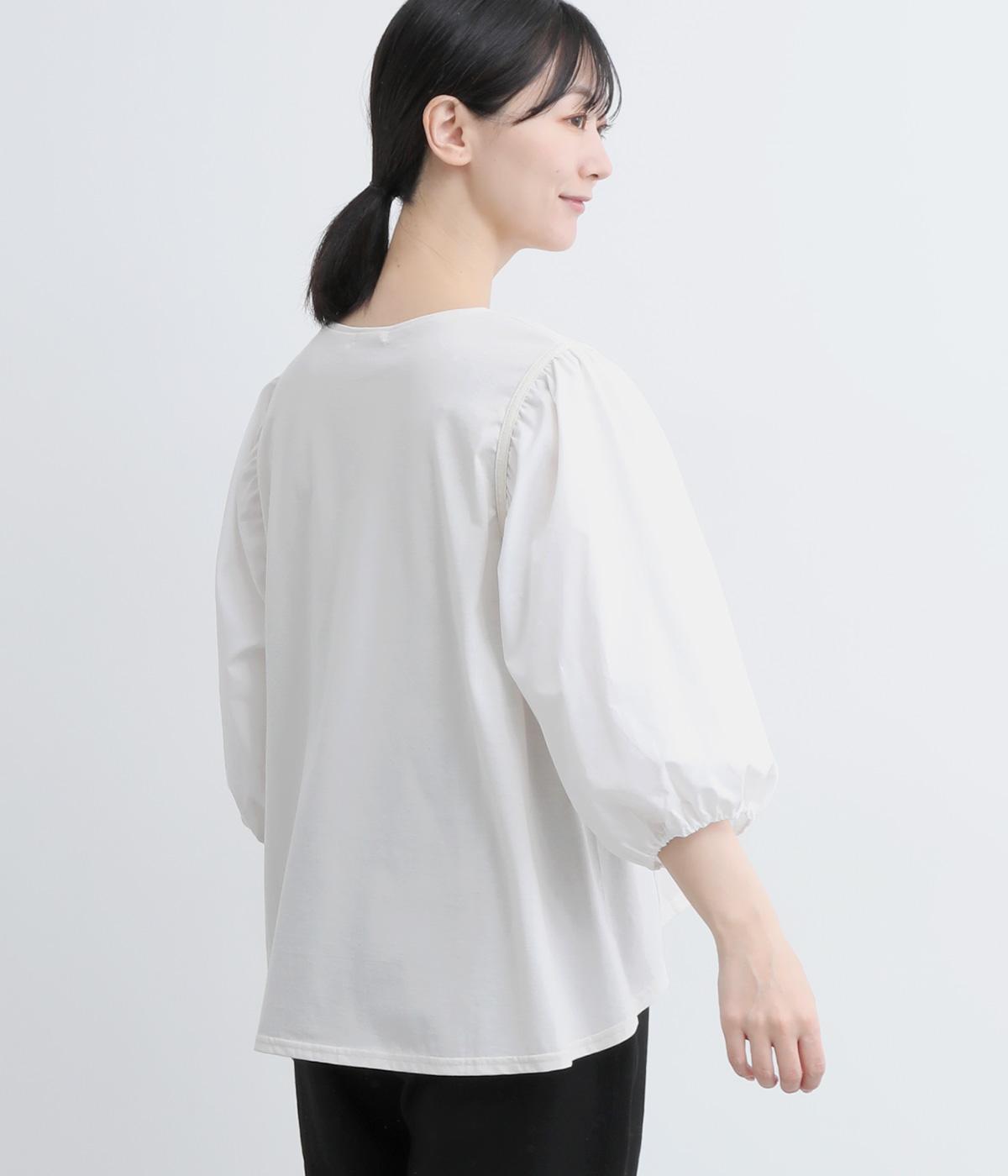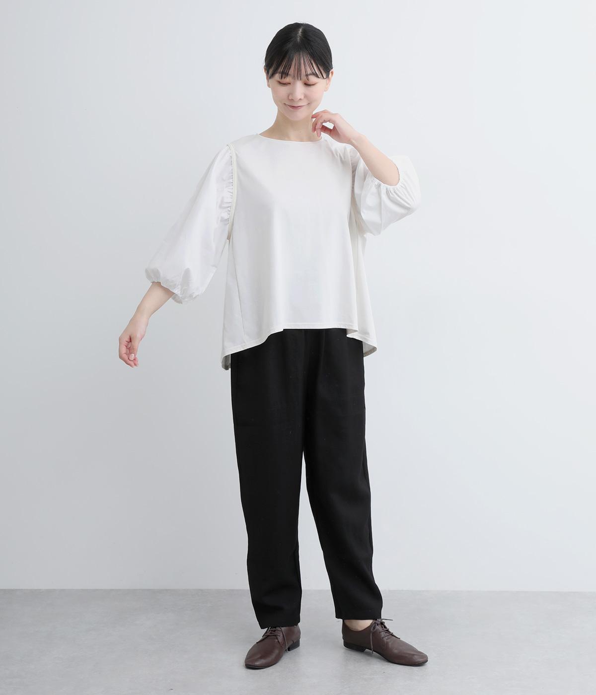 前後の身生地はやわらかく着心地のいいカットソーを、袖にはさらさらとした風合いの布帛を使用した異素材ミックス。着心地のよさと着映えを兼ね備えた一枚です。