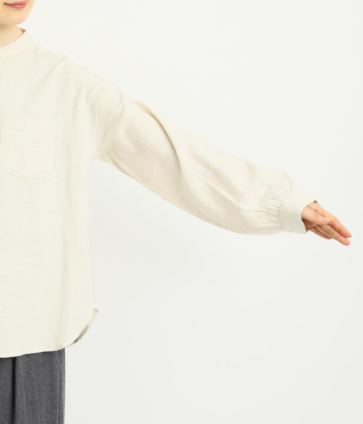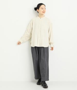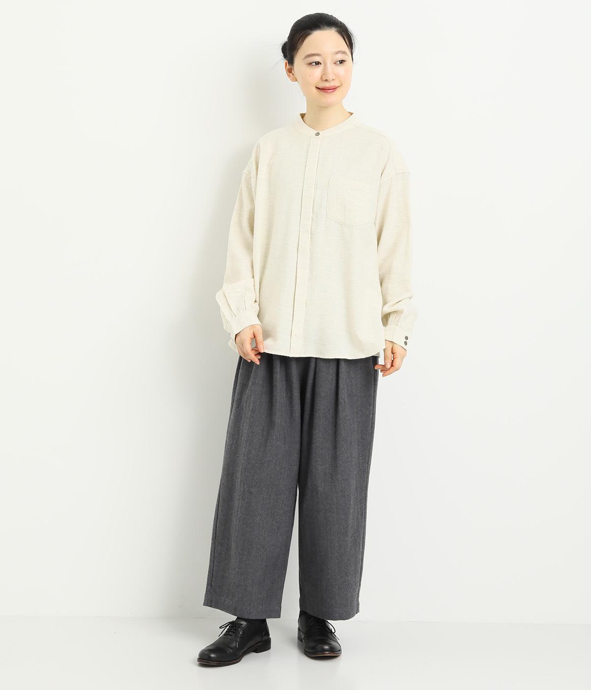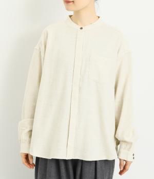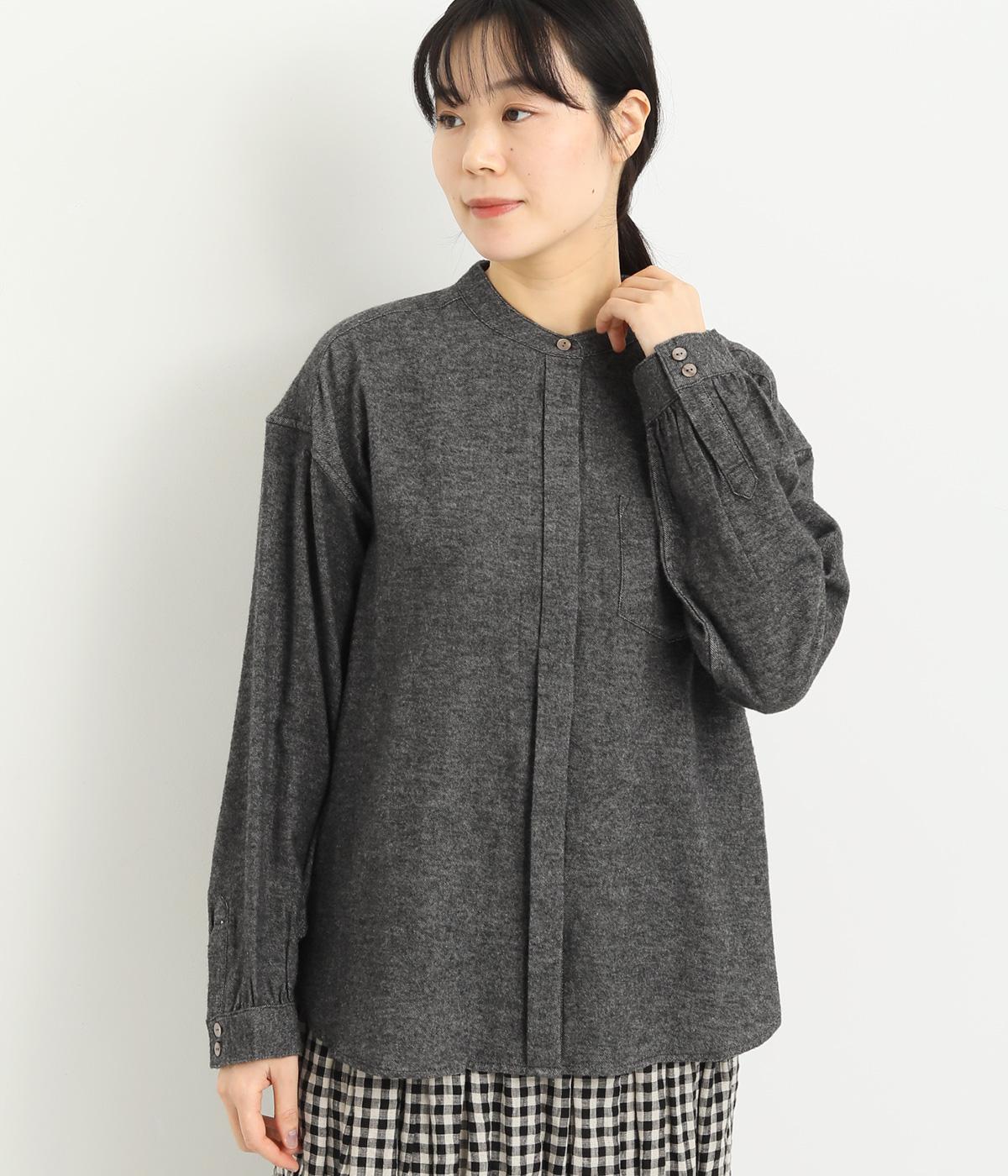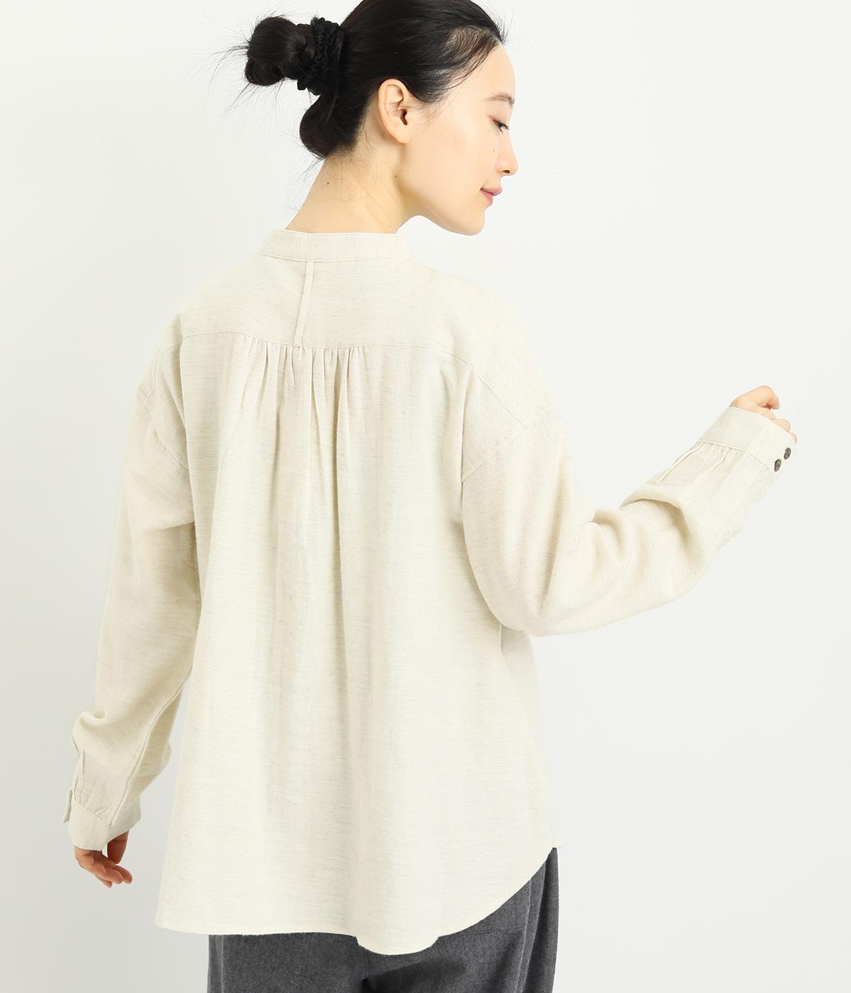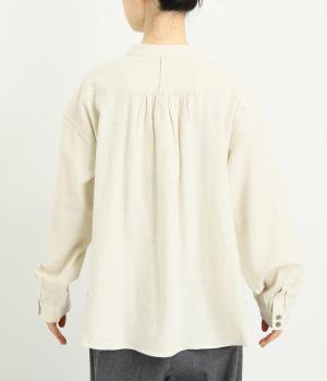 ベーシックなバンドカラーシャツは、杢調のナチュラルさやあたたかみのある表情で個性をプラス。ギャザーを寄せた袖も生地のもつやさしい雰囲気にマッチしています。すっきりとした比翼仕立てで羽織りとしても活躍。