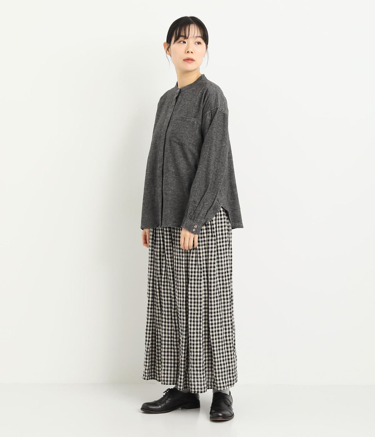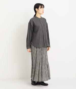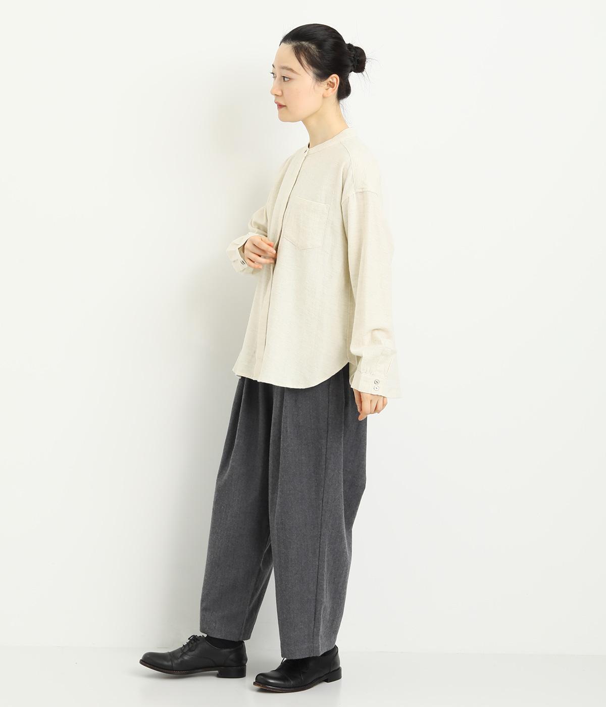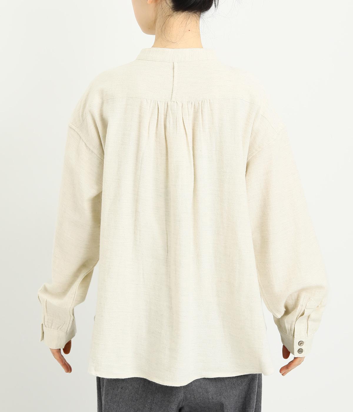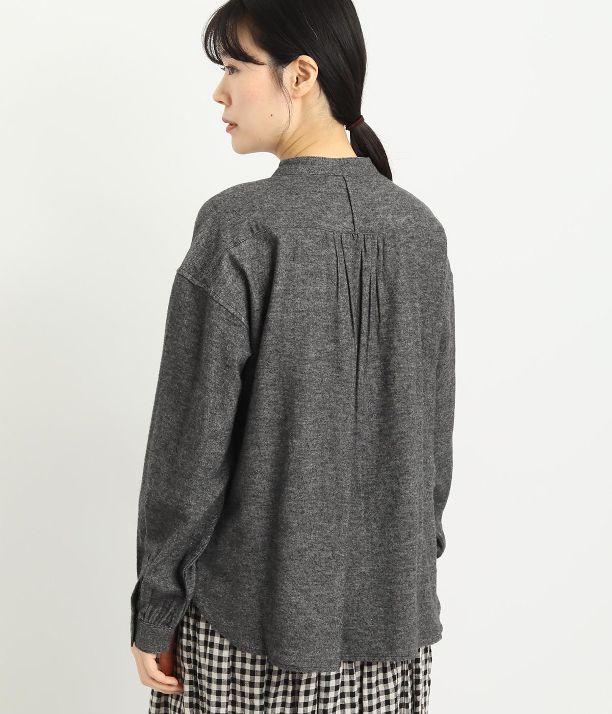 ベーシックなバンドカラーシャツは、杢調のナチュラルさやあたたかみのある表情で個性をプラス。ギャザーを寄せた袖も生地のもつやさしい雰囲気にマッチしています。すっきりとした比翼仕立てで羽織りとしても活躍。