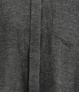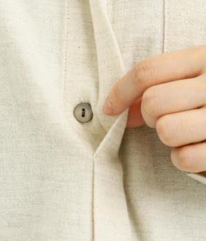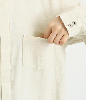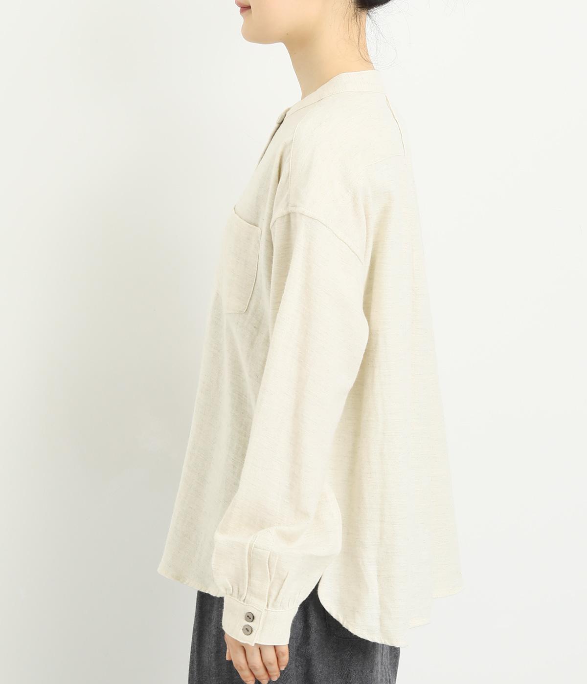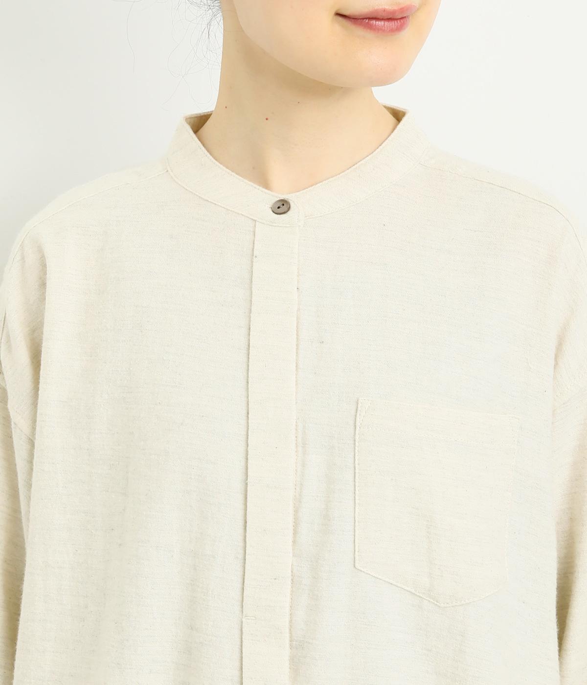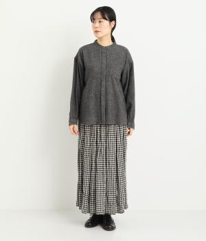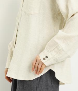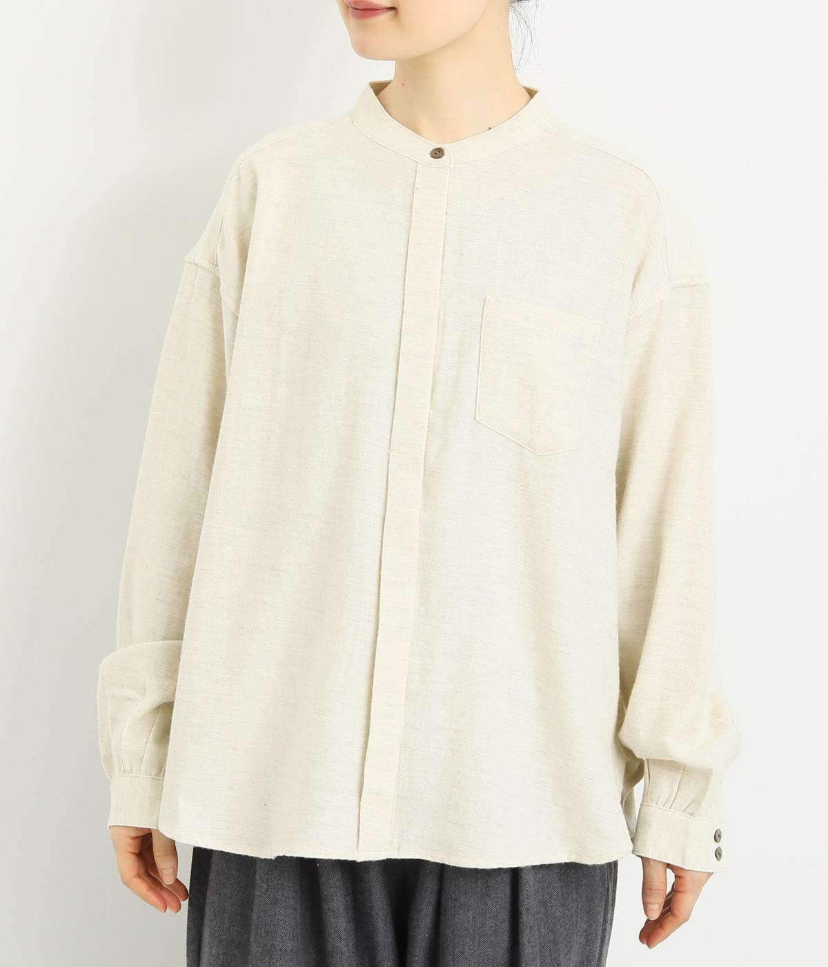 ベーシックなバンドカラーシャツは、杢調のナチュラルさやあたたかみのある表情で個性をプラス。ギャザーを寄せた袖も生地のもつやさしい雰囲気にマッチしています。すっきりとした比翼仕立てで羽織りとしても活躍。