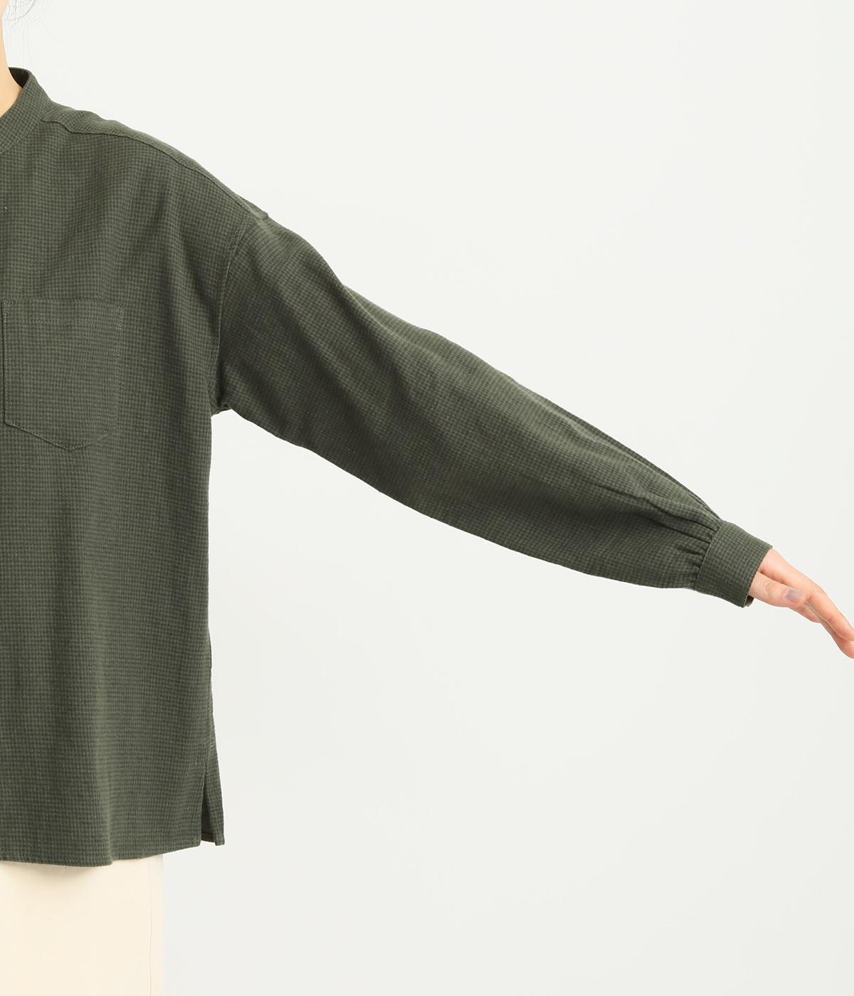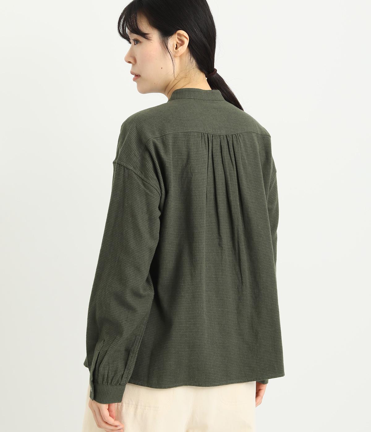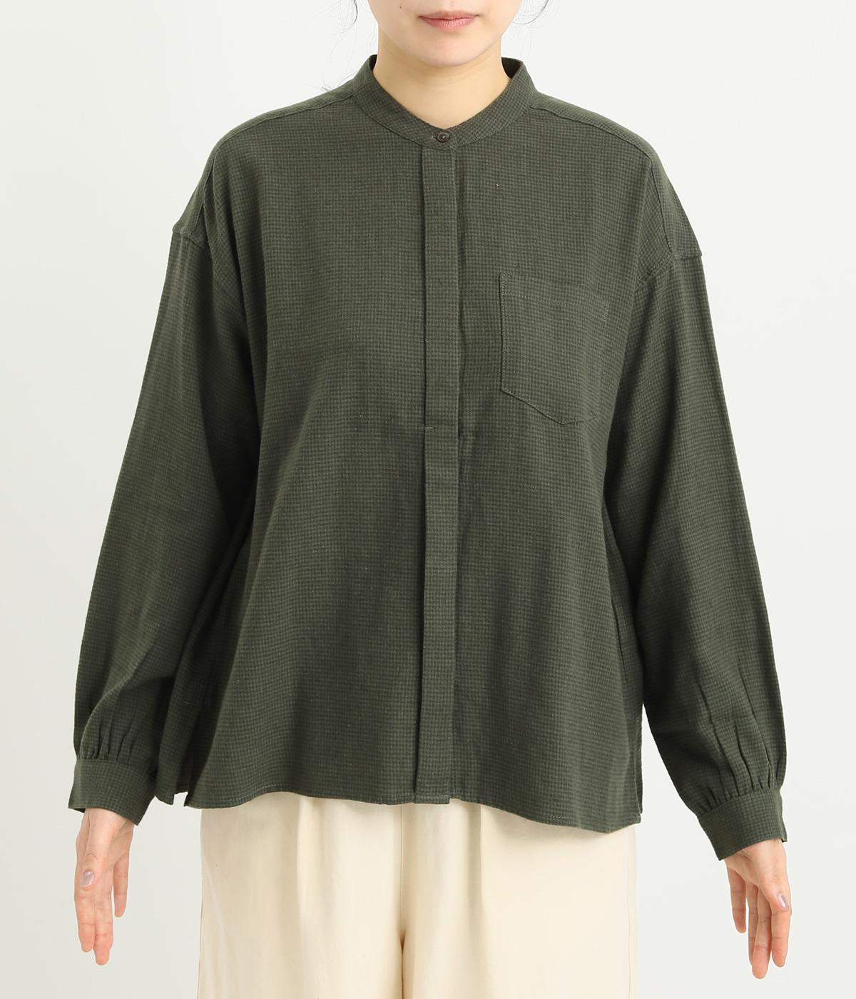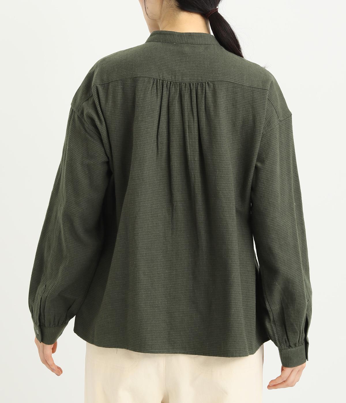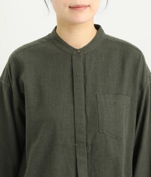 メンズライクなスタイリングや、すこしきちんと見せたい装いにぴったりな細かな千鳥格子柄ブラウス。バンドカラーや比翼ボタンがすっきりと凛とした表情に。袖や後ろはギャザーを寄せてゆとりを持たせ、着こなしやすく仕立てました。