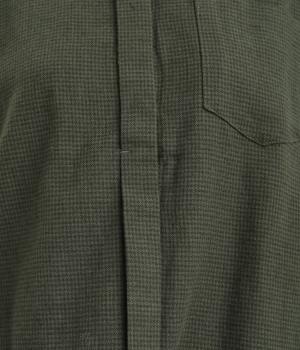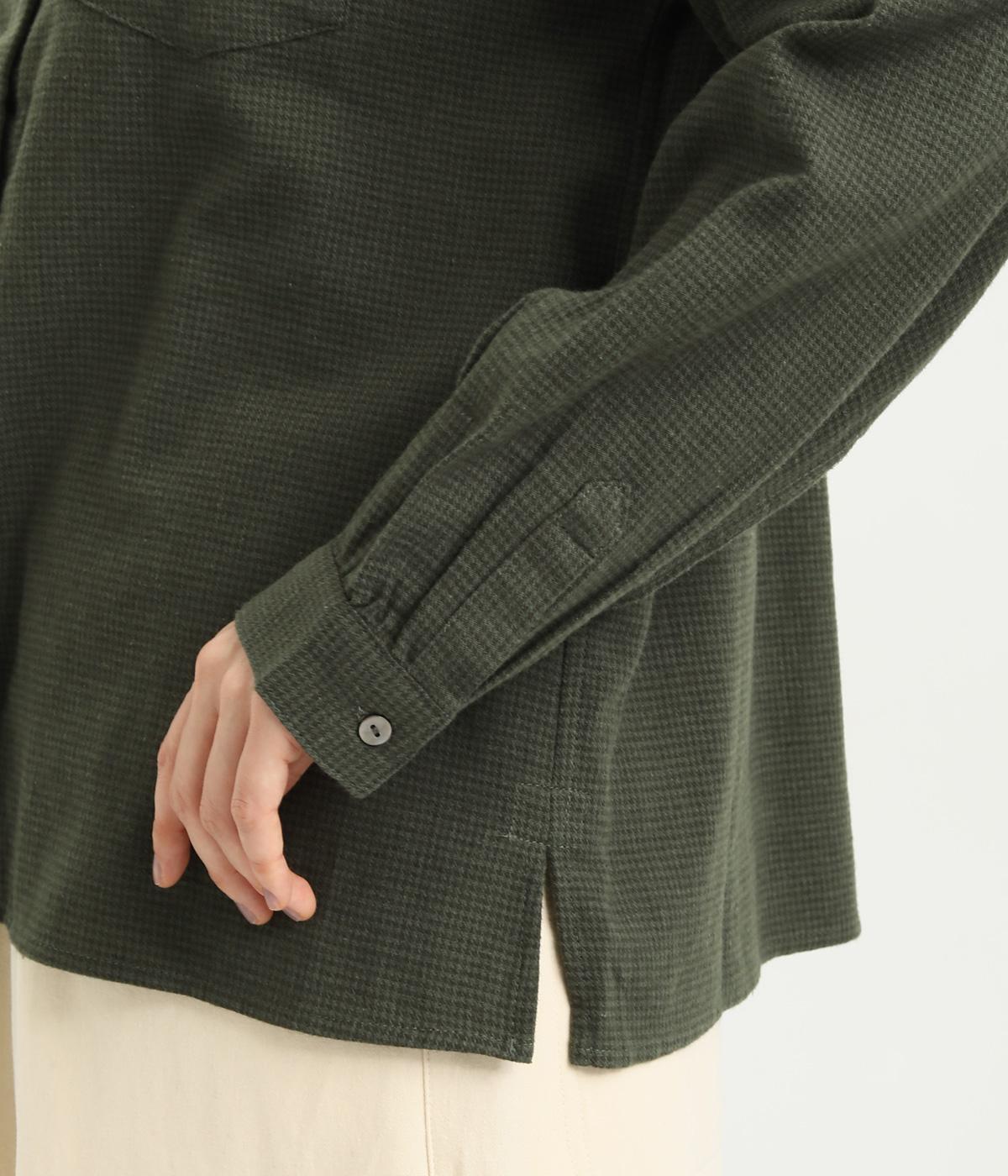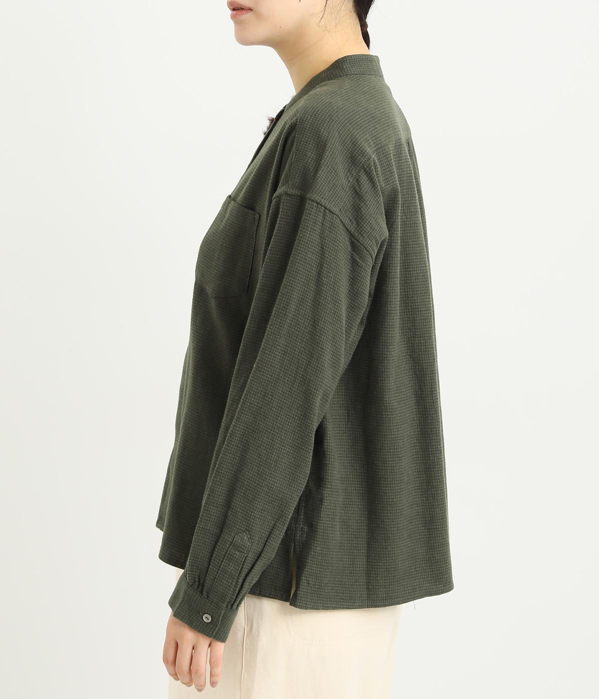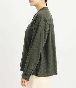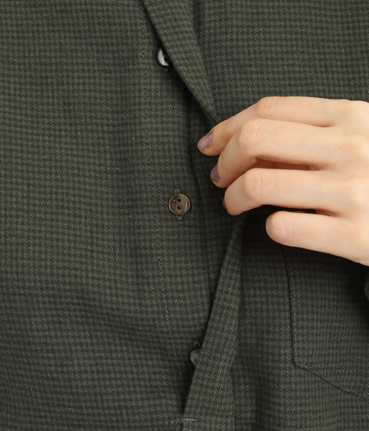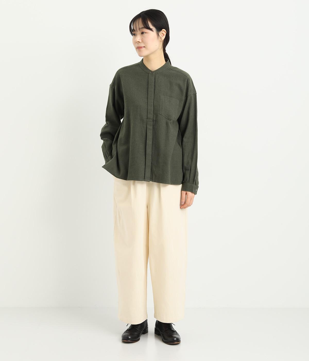 メンズライクなスタイリングや、すこしきちんと見せたい装いにぴったりな細かな千鳥格子柄ブラウス。バンドカラーや比翼ボタンがすっきりと凛とした表情に。袖や後ろはギャザーを寄せてゆとりを持たせ、着こなしやすく仕立てました。
