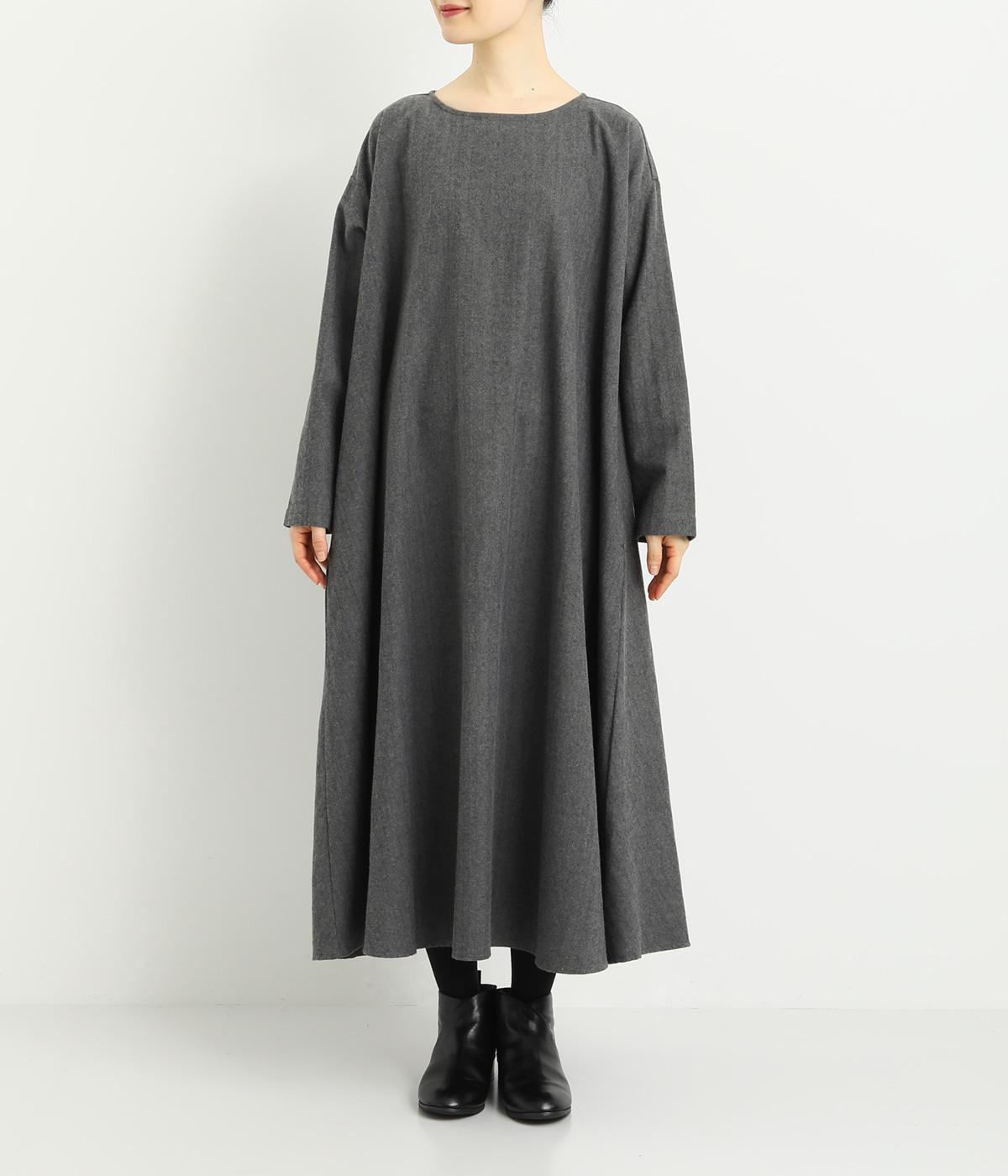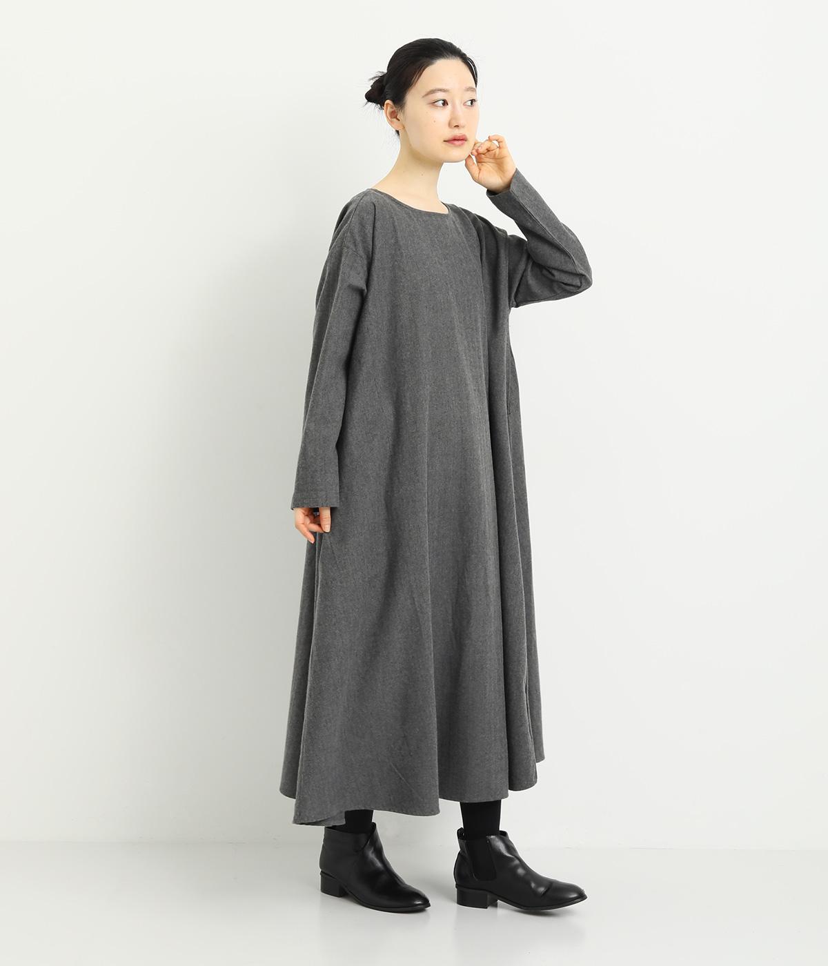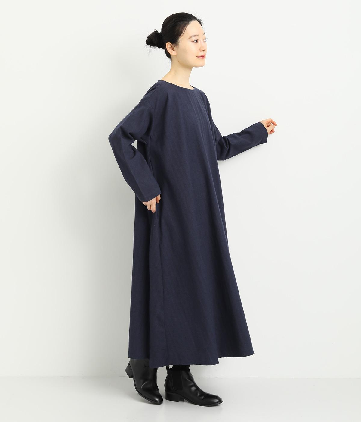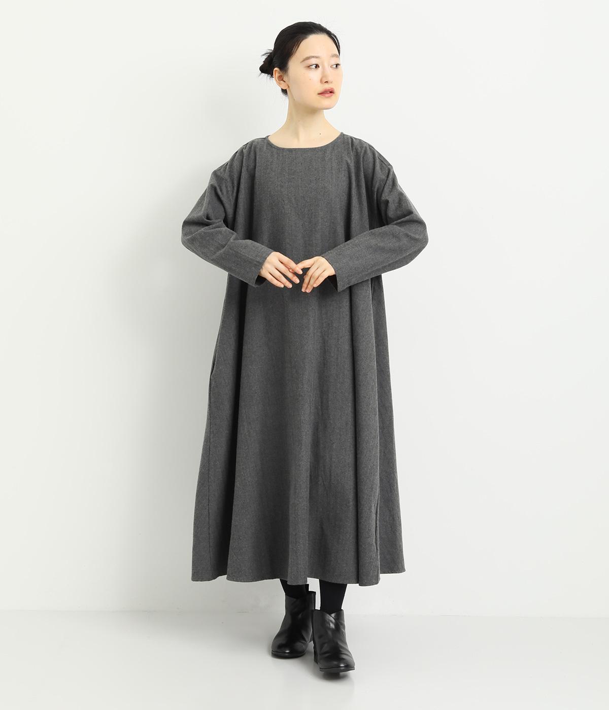 シンプルながらも自然なドレープや立体感が存在感を放つAラインワンピース。生地感も相まってクラシカルな印象を与え、パールなど品のいいアクセサリーとも相性抜群。襟ぐりはすっきりとしているのでシャツ合わせも◎。