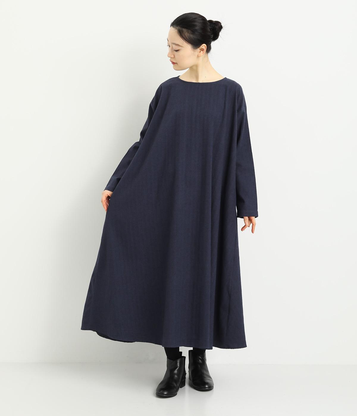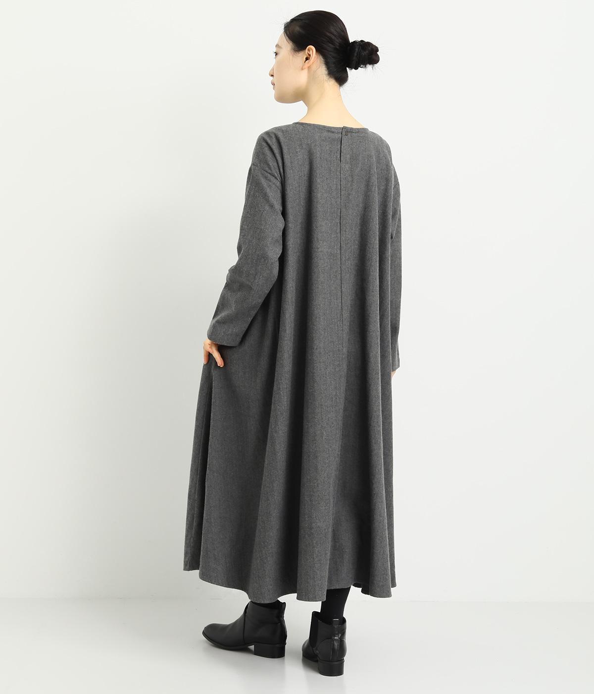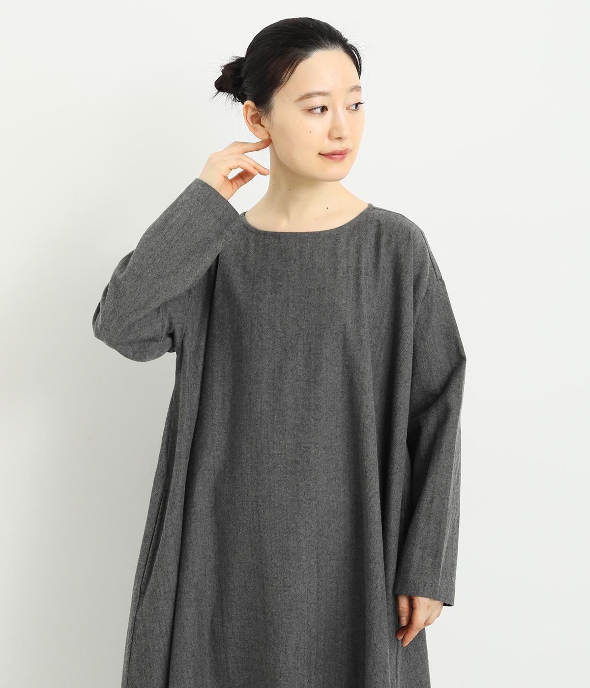 シンプルながらも自然なドレープや立体感が存在感を放つAラインワンピース。生地感も相まってクラシカルな印象を与え、パールなど品のいいアクセサリーとも相性抜群。襟ぐりはすっきりとしているのでシャツ合わせも◎。