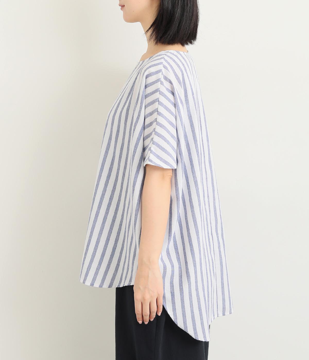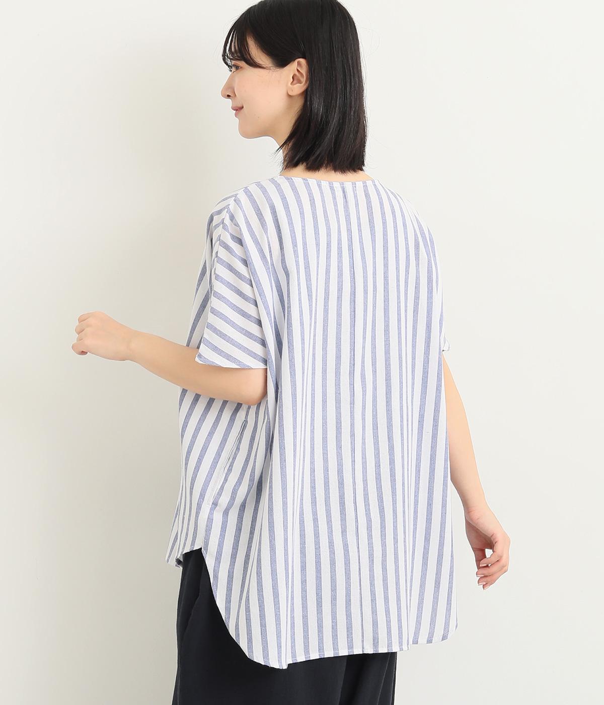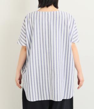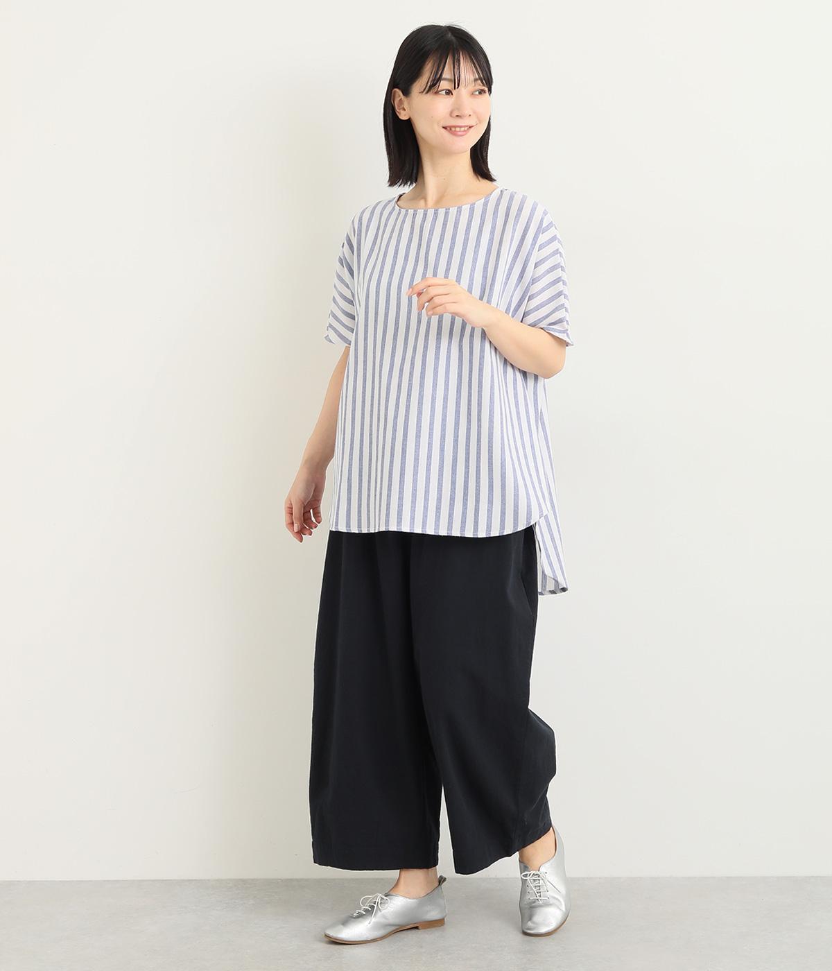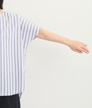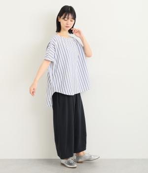 ゆったりとしたプルオーバーは、前後差をつけたラウンドヘムでシルエットに動きをつけました。サイドから後ろにかけたラインも特徴的で、トップスアウトもさまになります。ちょこんとついたフレンチスリーブは、着用すると二の腕がかくれるほどの袖丈に。