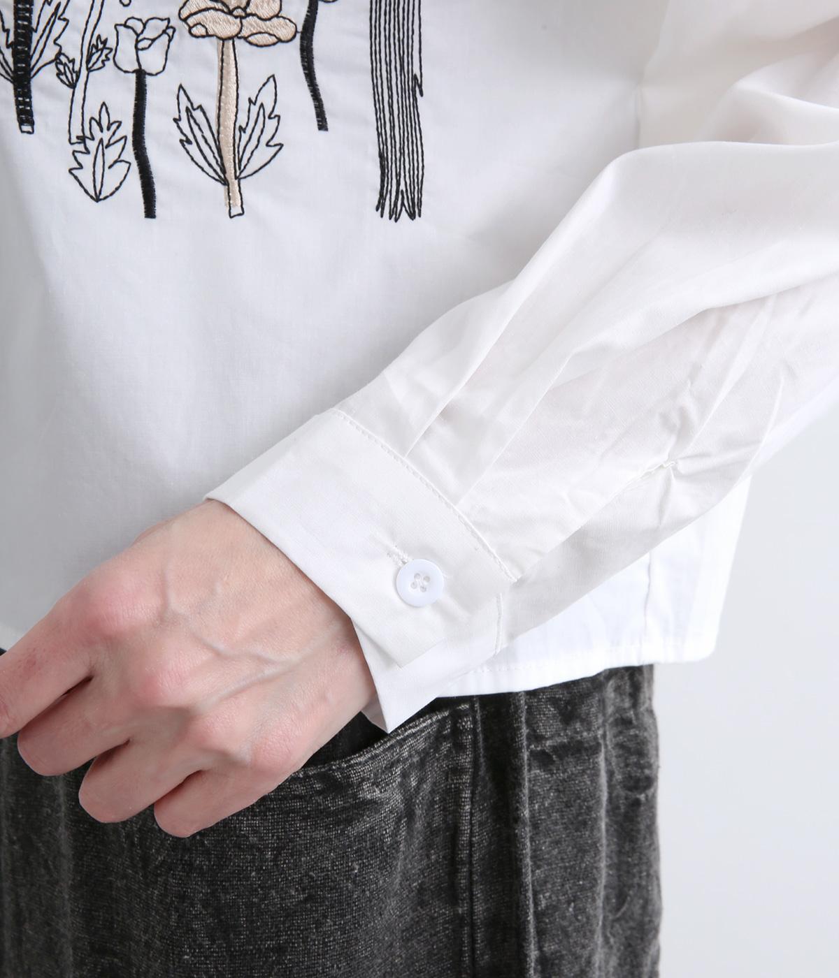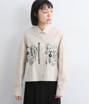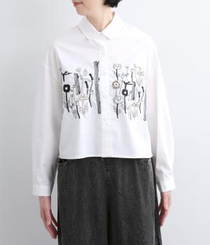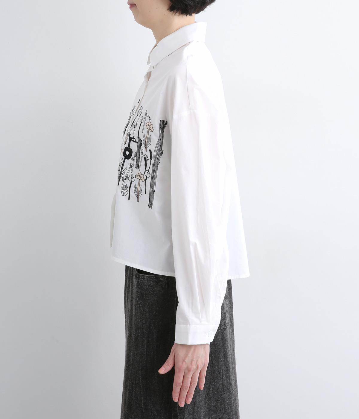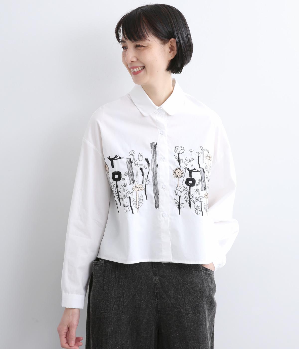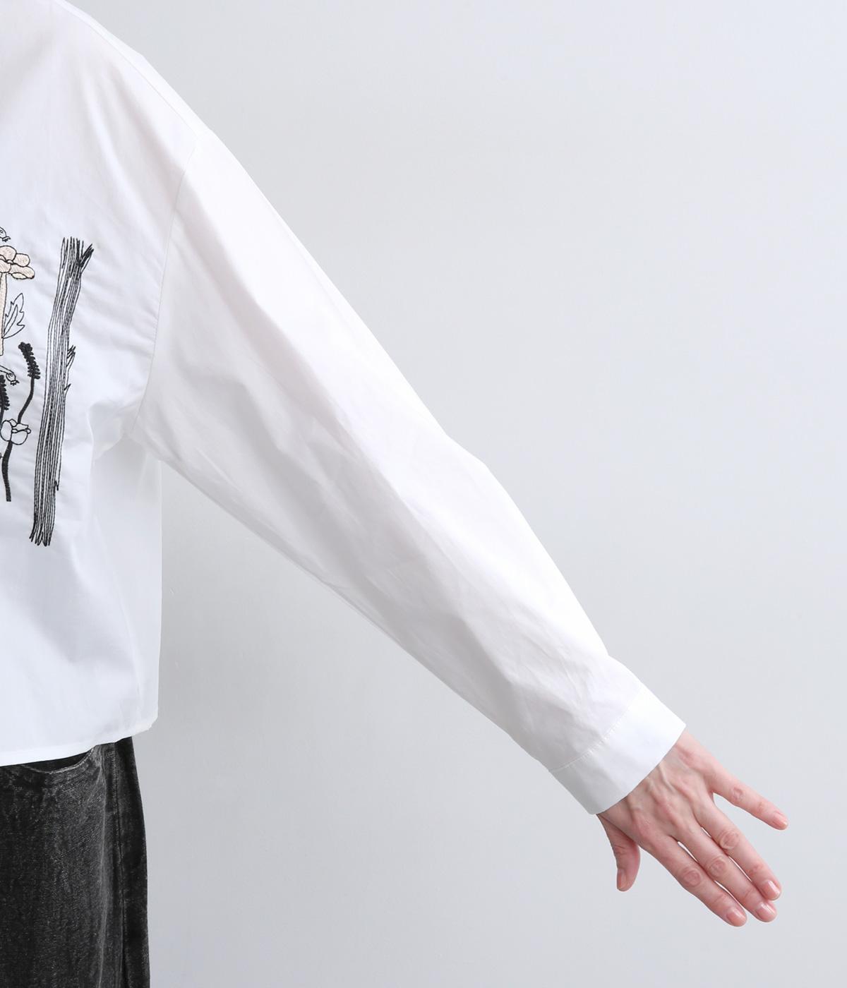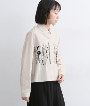 フロントのボタニカル刺しゅうが目をひくシャツです。ラウンドカラーが柔らかな印象を添えます。身幅ゆったりのオーバーサイズをショート丈に仕立てて、こなれ感のある佇まいに。リラックスした着心地ときちんと感を両立した一枚です。