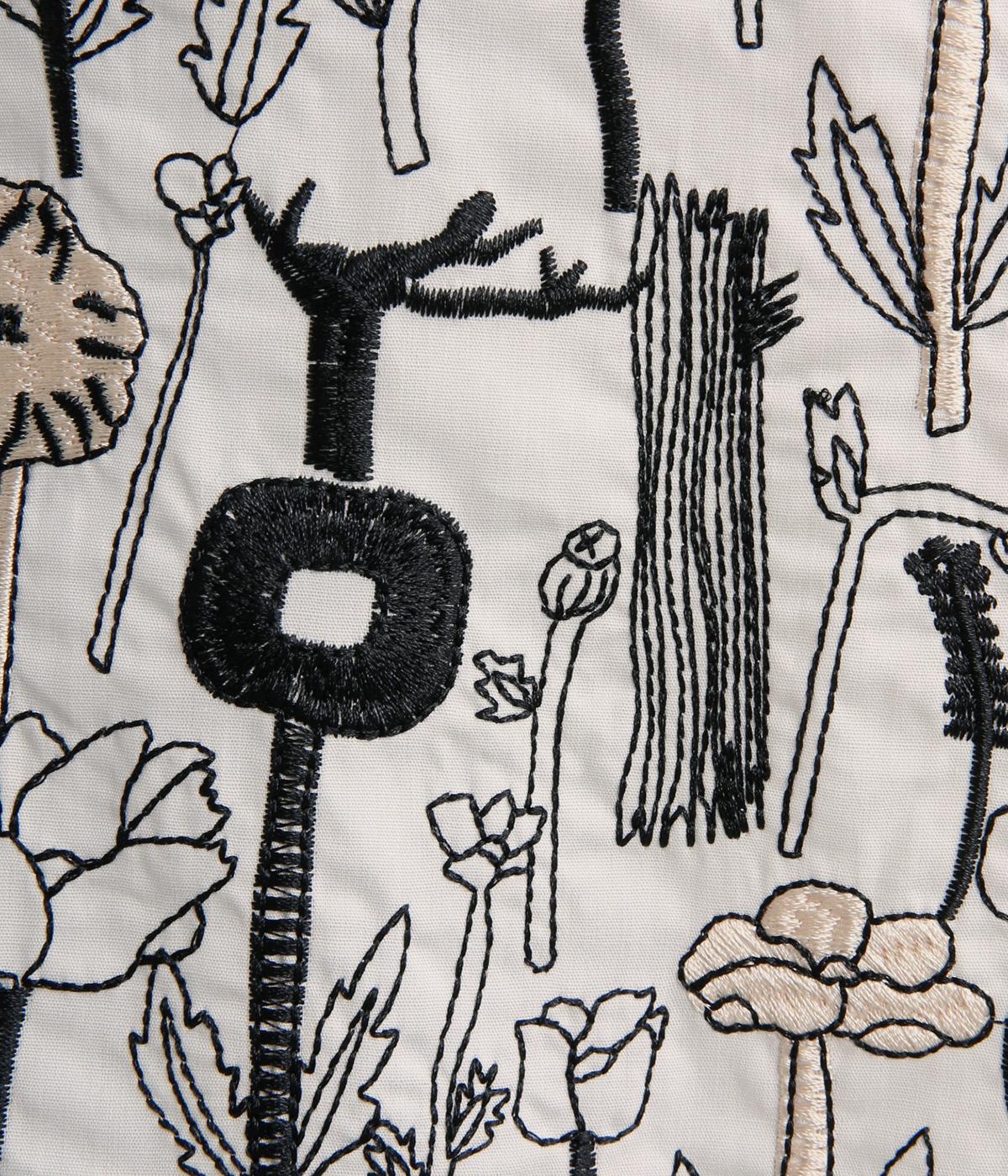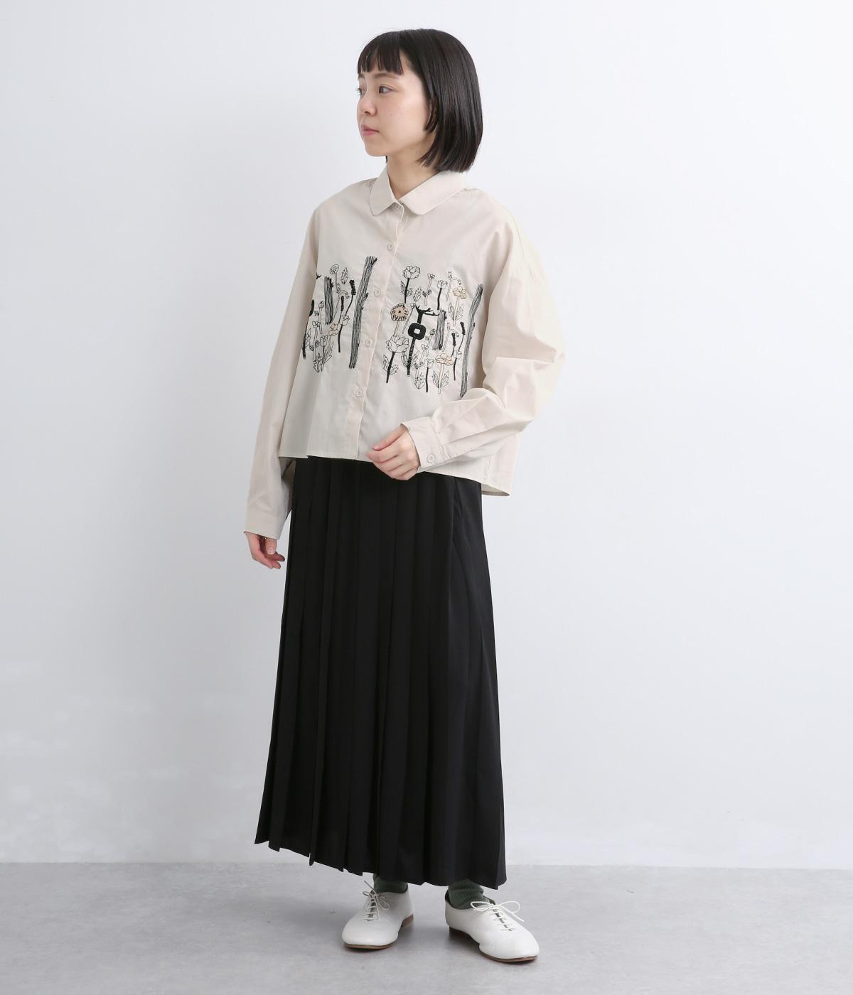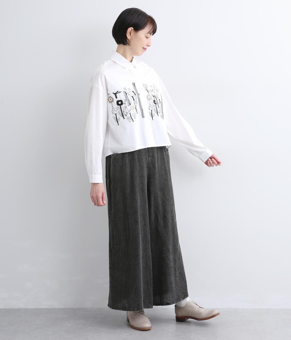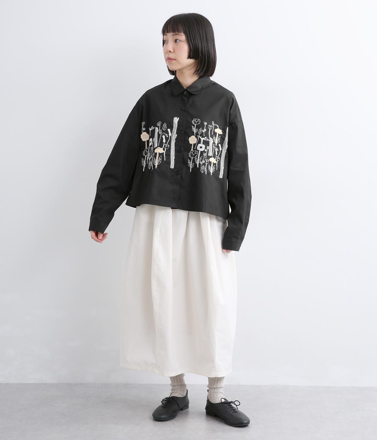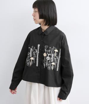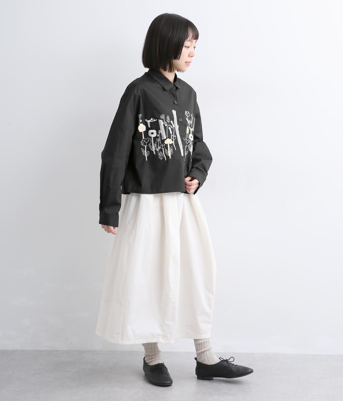 フロントのボタニカル刺しゅうが目をひくシャツです。ラウンドカラーが柔らかな印象を添えます。身幅ゆったりのオーバーサイズをショート丈に仕立てて、こなれ感のある佇まいに。リラックスした着心地ときちんと感を両立した一枚です。