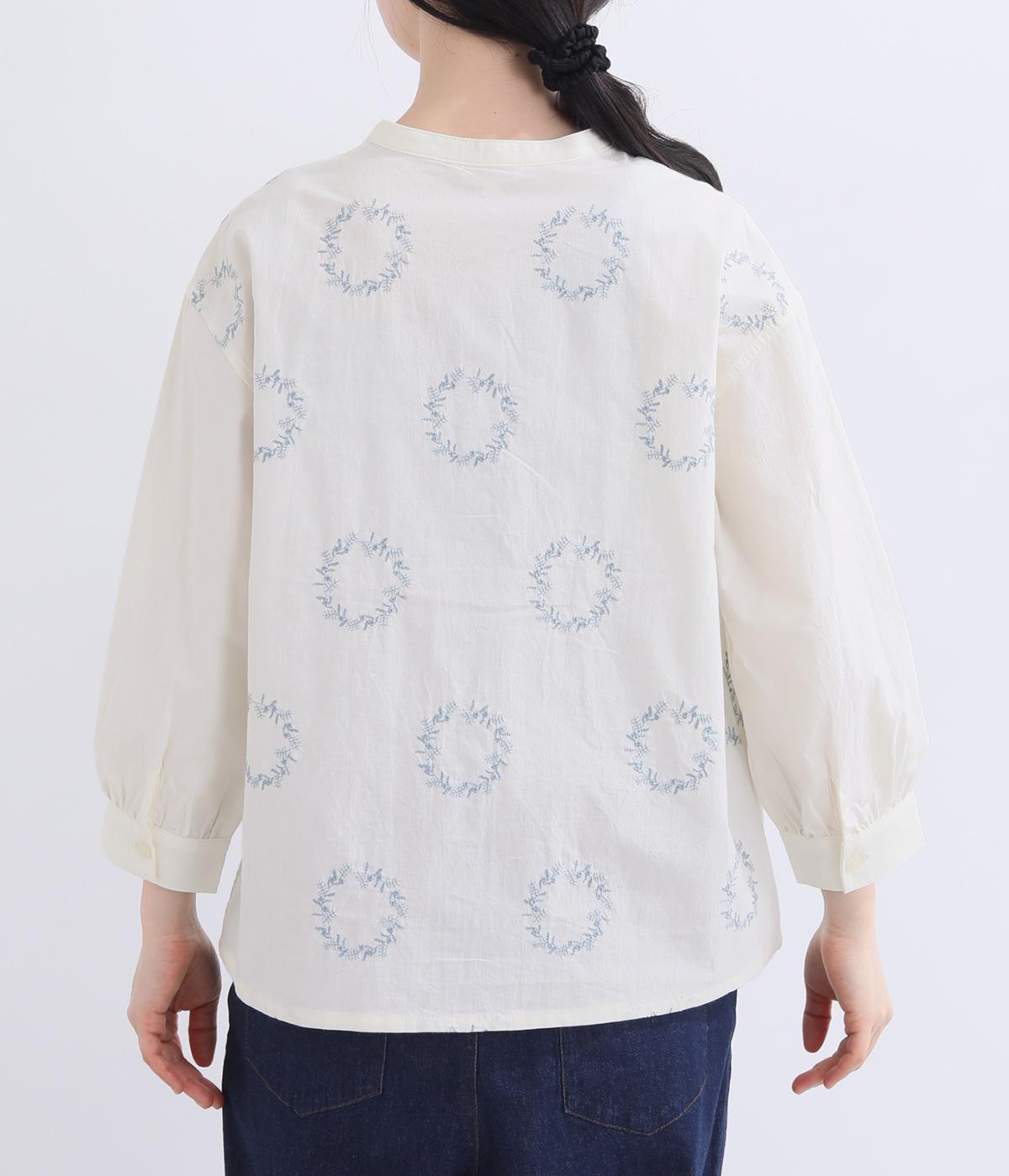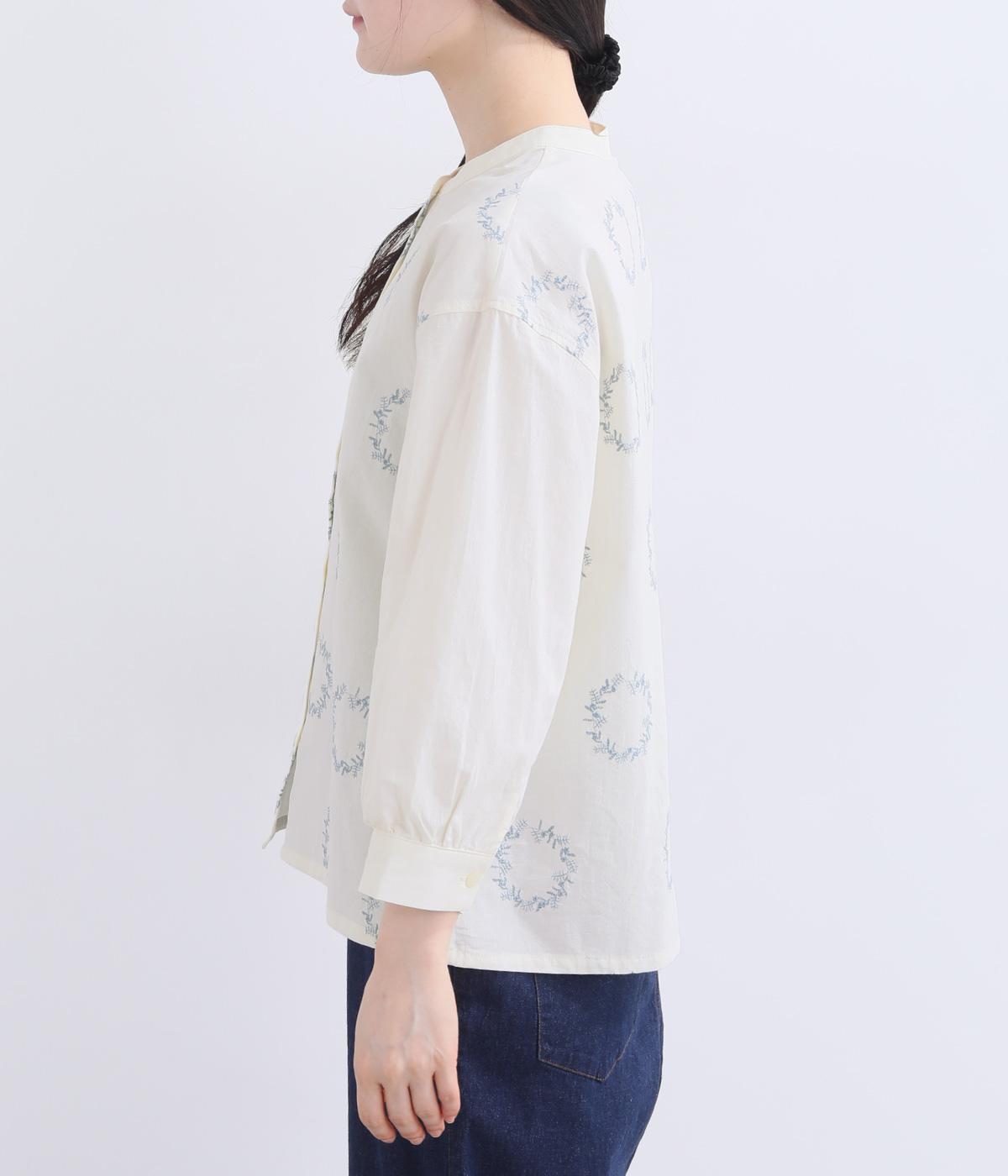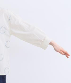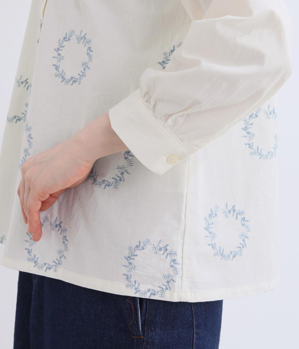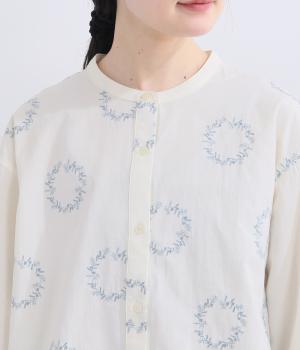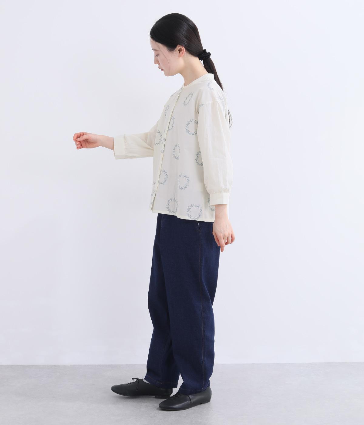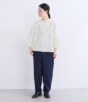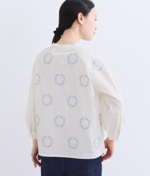 庭に植えたローズマリーをモチーフにした刺しゅうがやさしい表情を添えるブラウス。植木鉢をかたどった彫り柄ボタンが、さりげないアクセントになっています。装いに自然なやわらかさを添える、穏やかな印象の一枚です。
