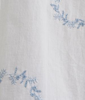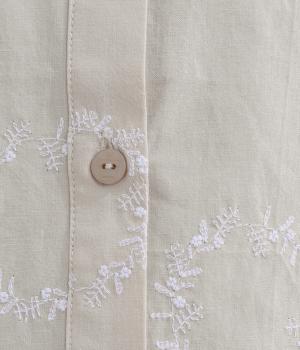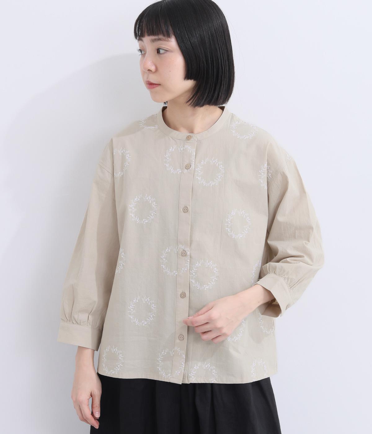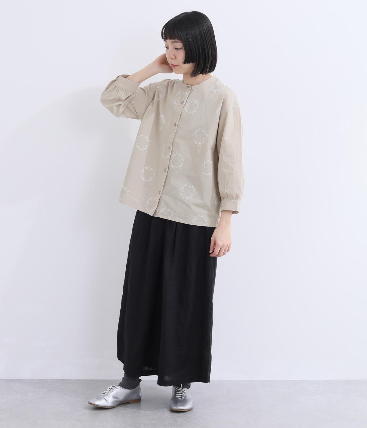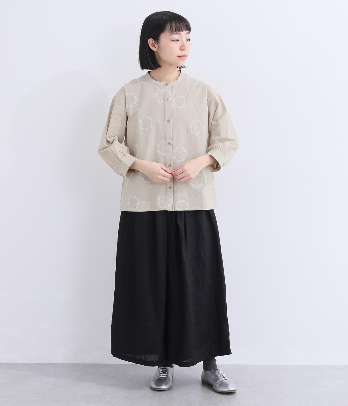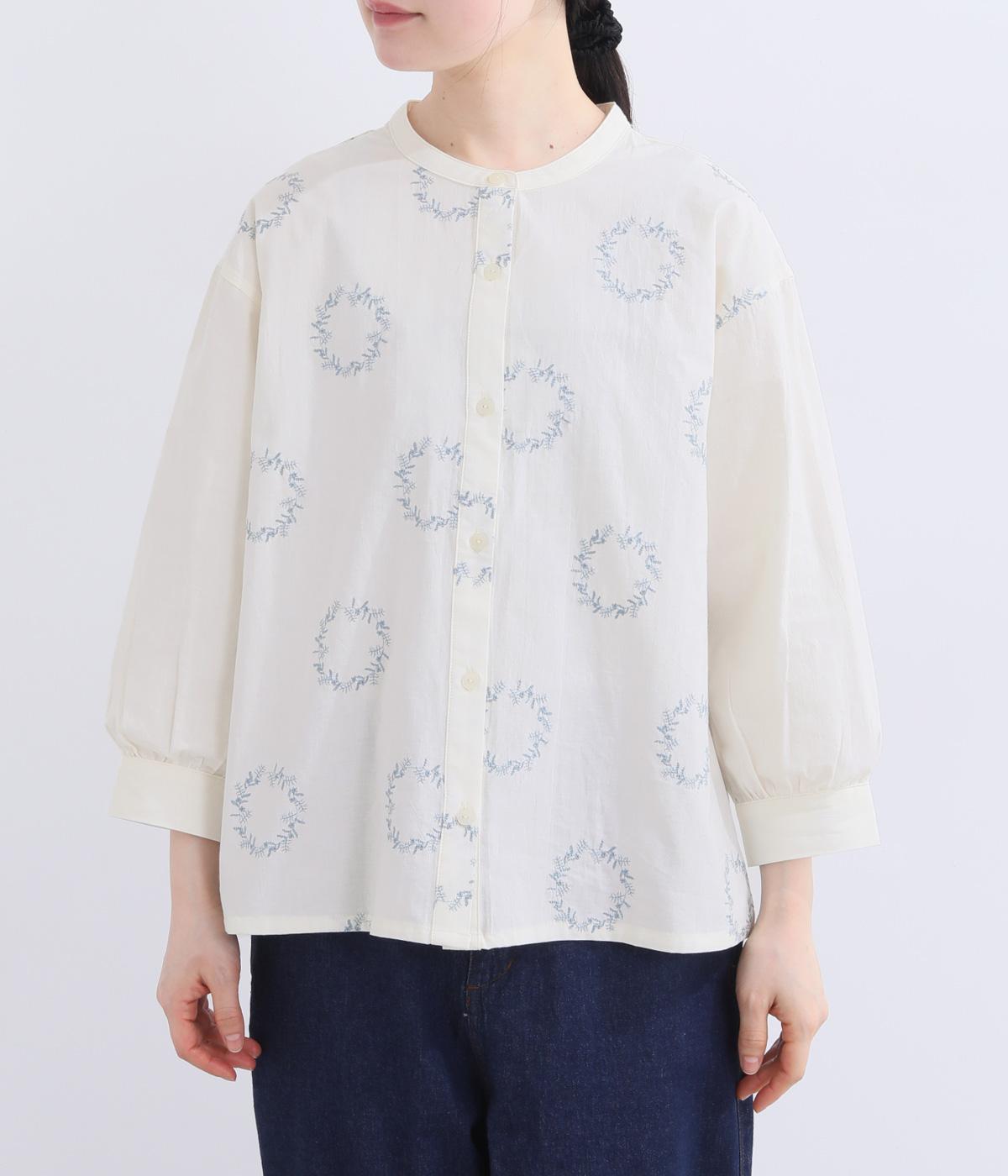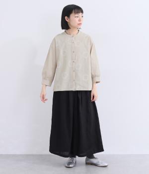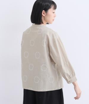 庭に植えたローズマリーをモチーフにした刺しゅうがやさしい表情を添えるブラウス。植木鉢をかたどった彫り柄ボタンが、さりげないアクセントになっています。装いに自然なやわらかさを添える、穏やかな印象の一枚です。