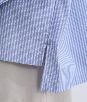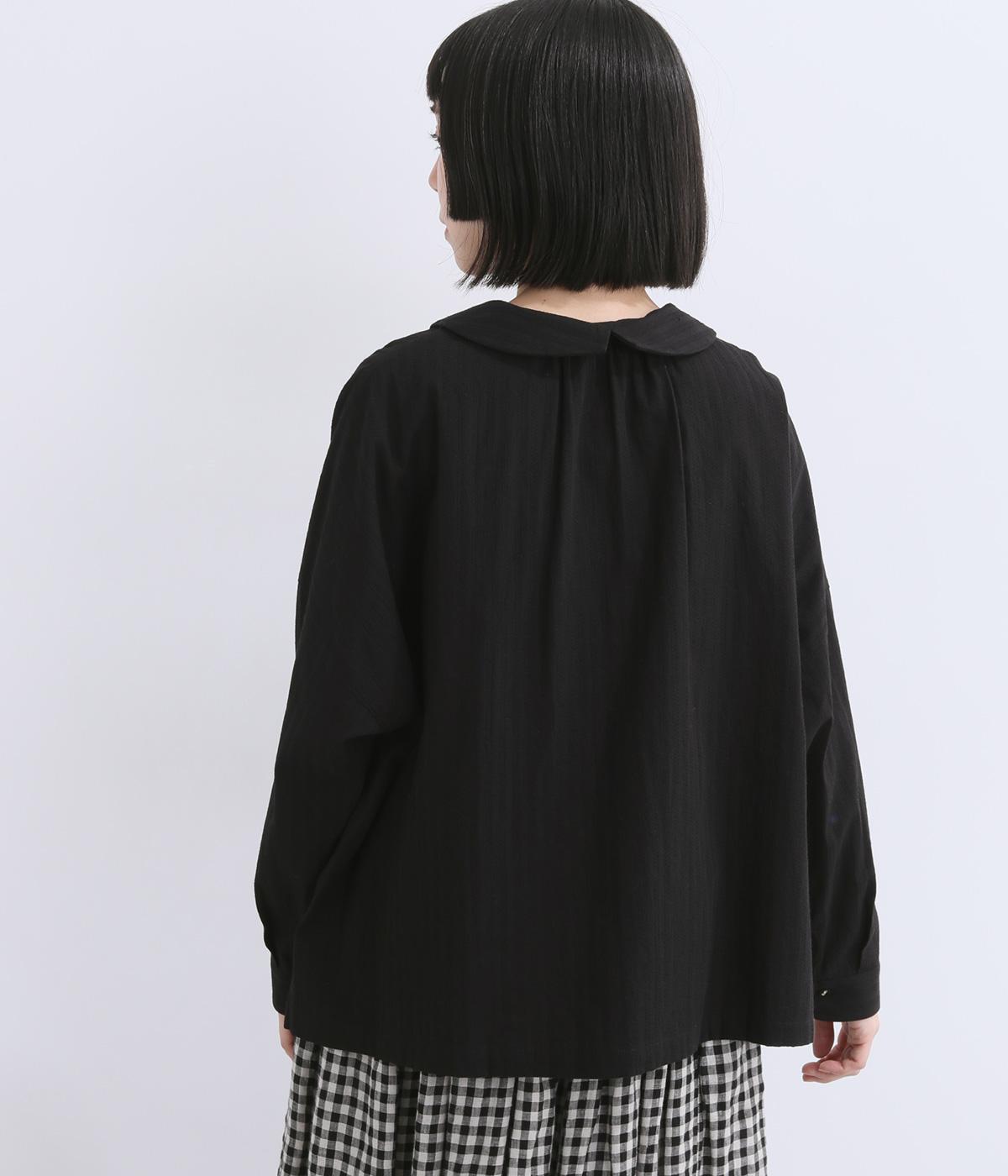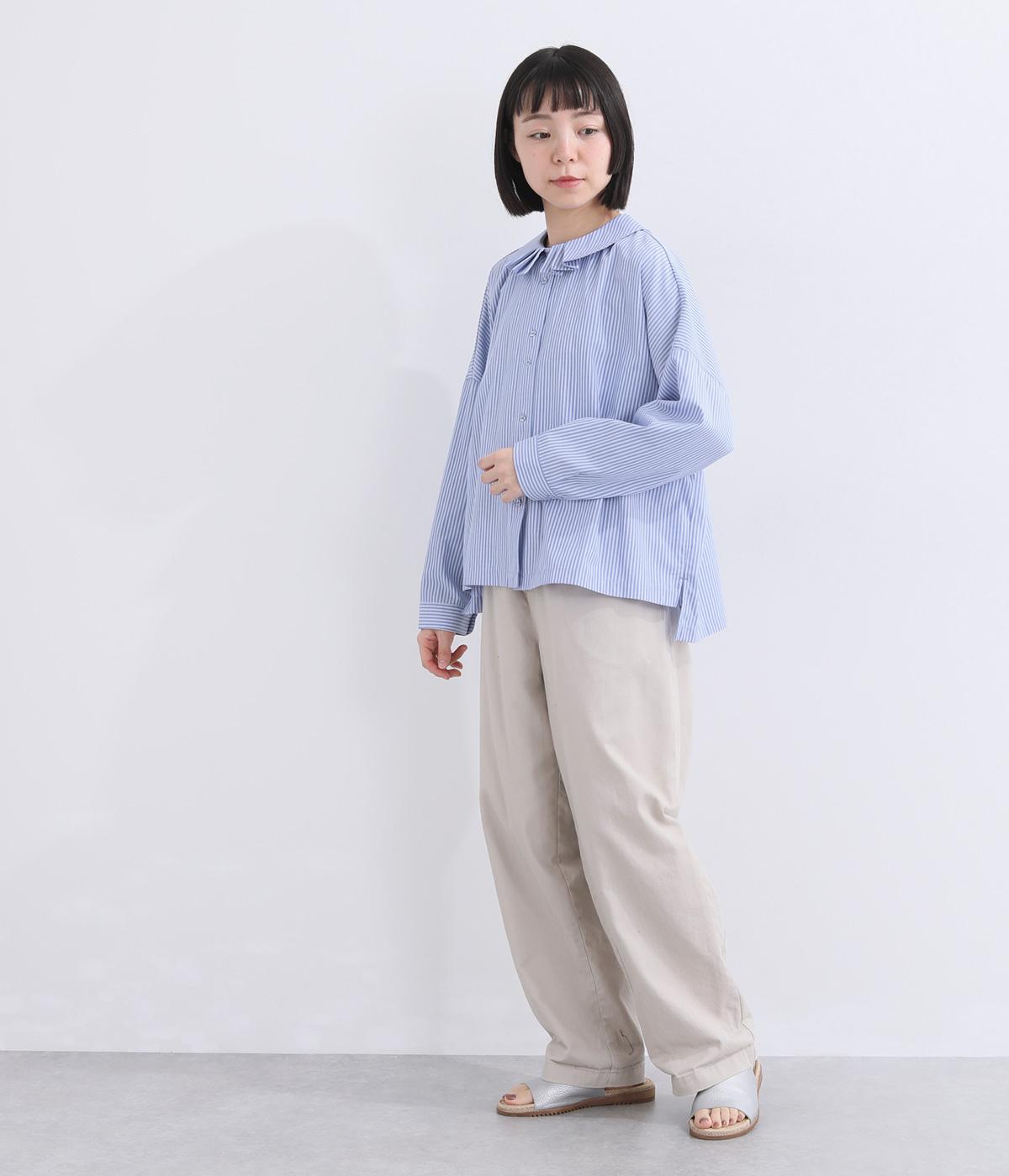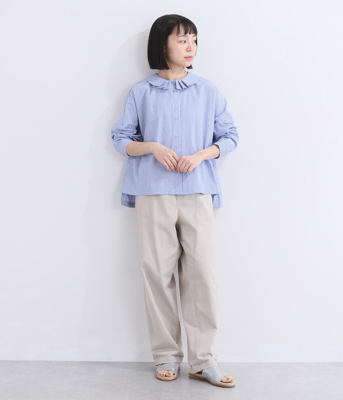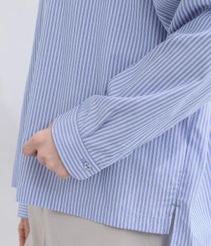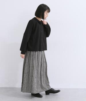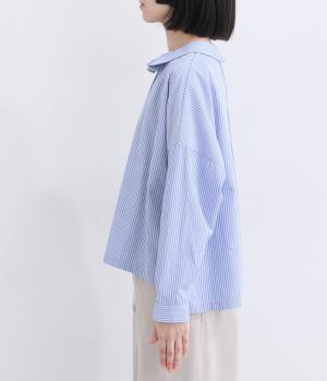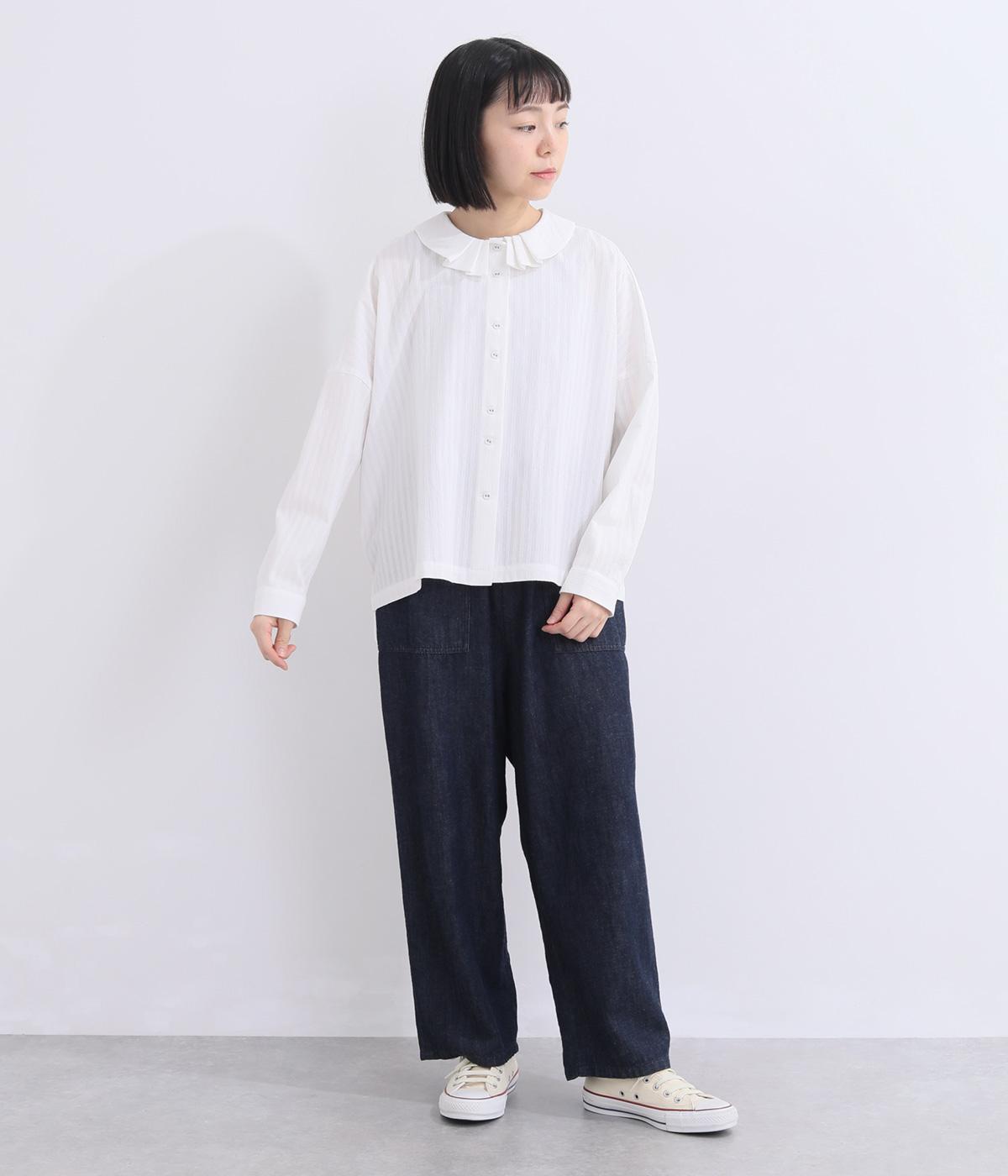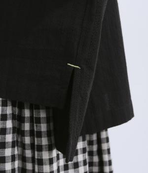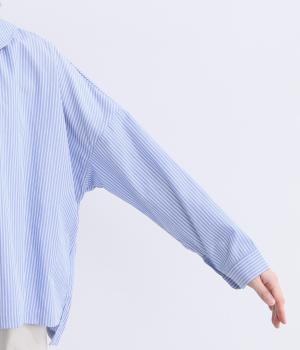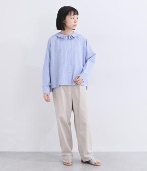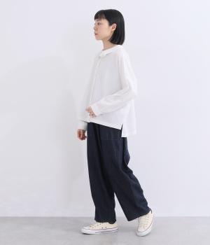 肩を落としたボックスシルエットにデザイン性のあるプリーツ襟をあしらいました。ほどよい甘さで、大人かわいい雰囲気を叶えます。前後差のある着丈とサイドスリットが動きに自然な表情を生み、こなれた印象に仕上げています。