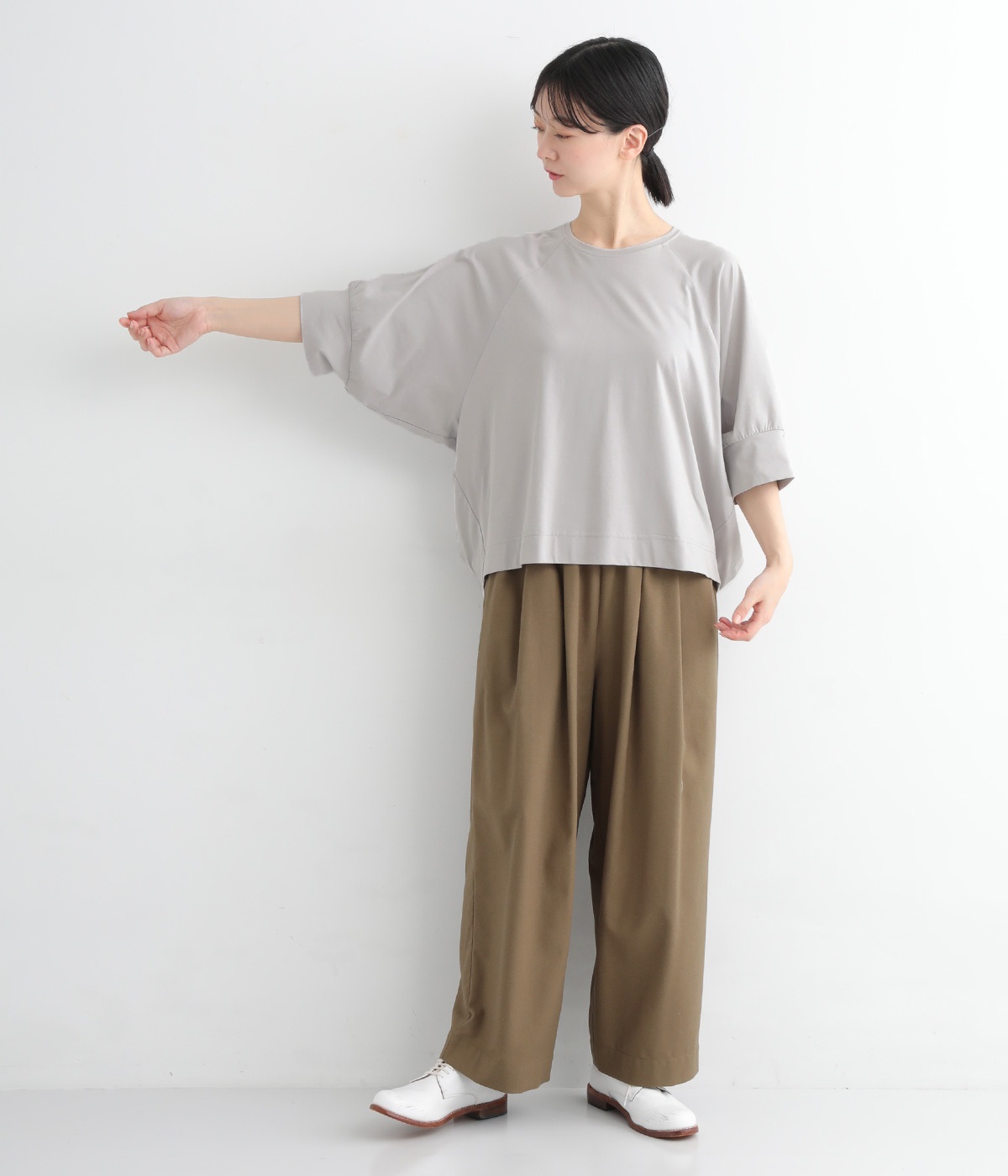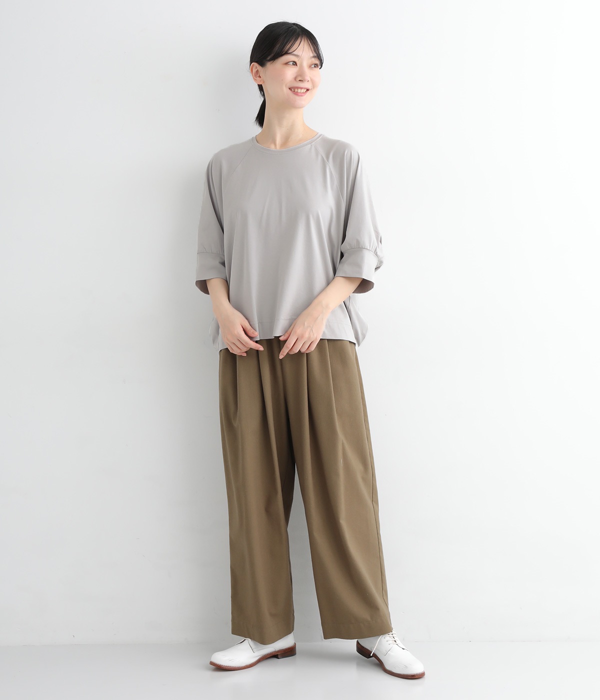>は、存在感のある柄バッグやカラーパンツとも好相性。上品さを残しながらも、軽やかに着こなせる一着です。