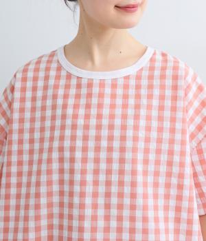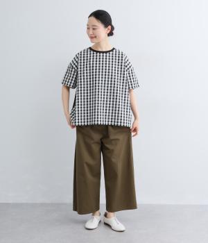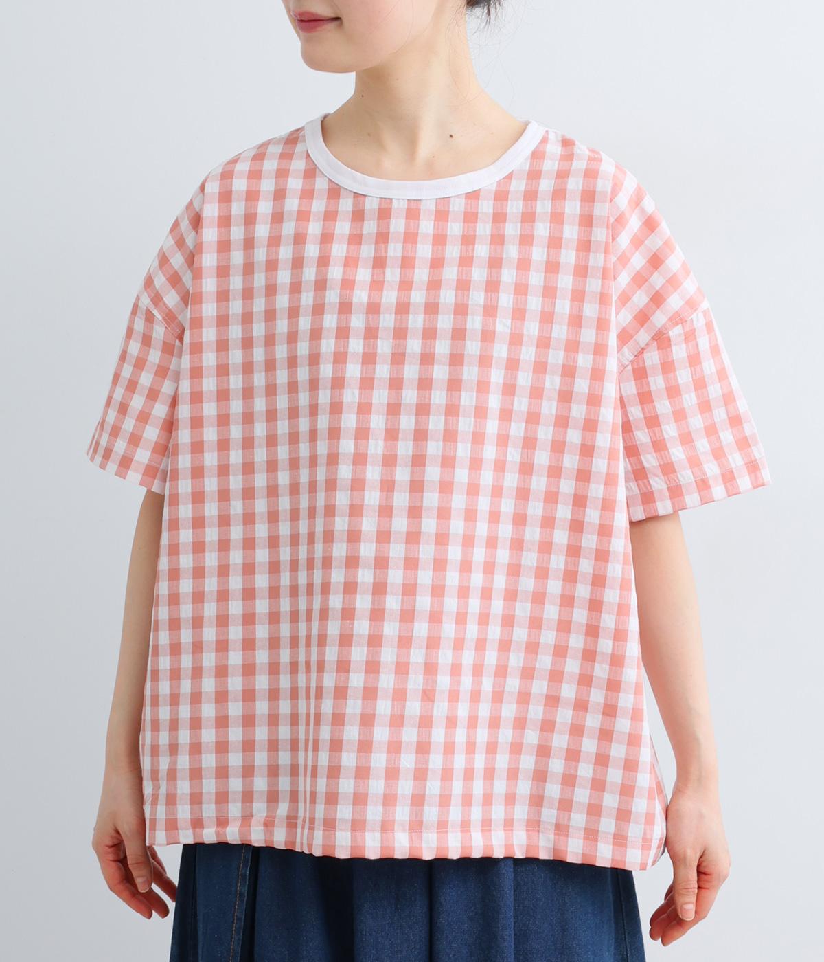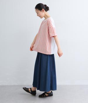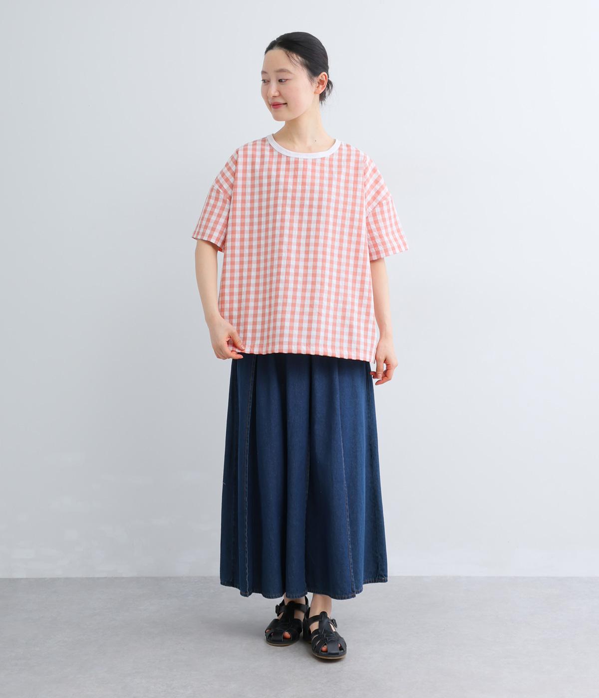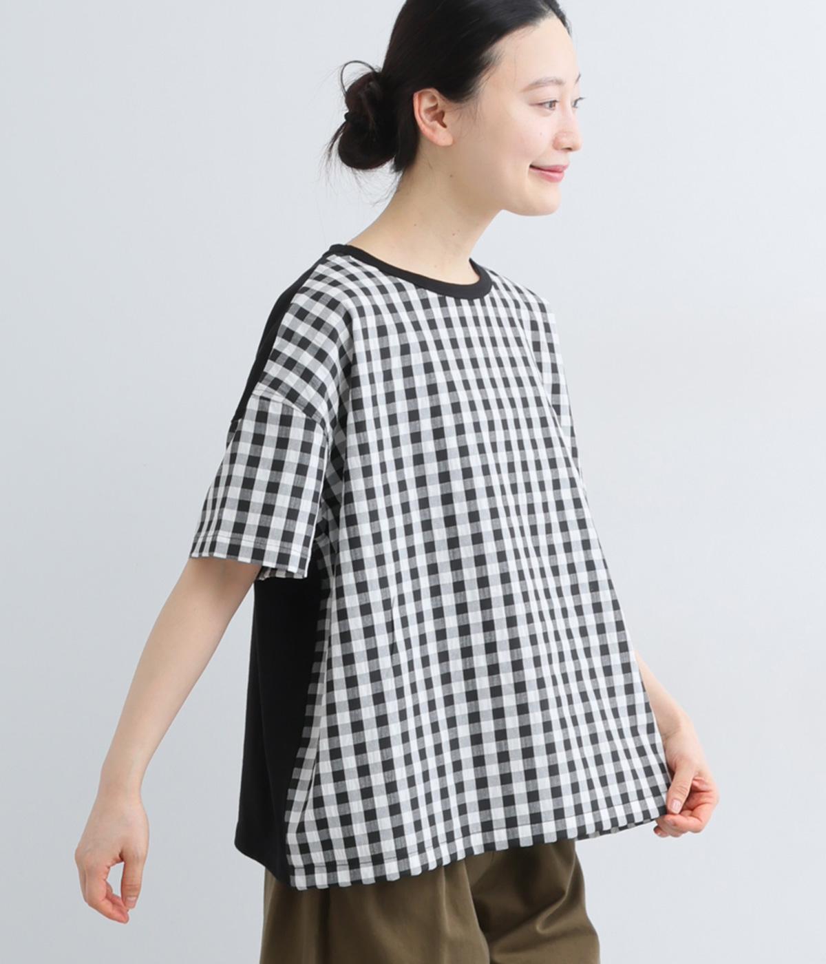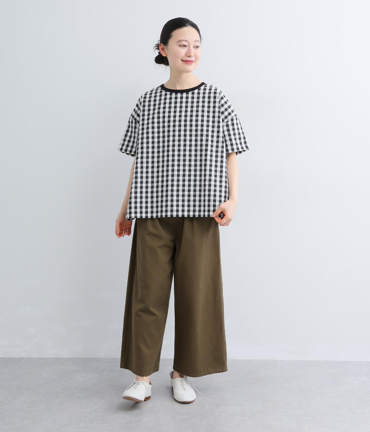 フロントルックはギンガムチェックでさわやかに。後ろはシンプルな無地に切り替えているので、総柄が苦手な方にもトライしやすくまとめました。ゆとりのあるボックスシルエットでカジュアルさを出しています。