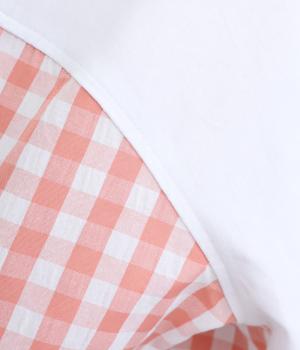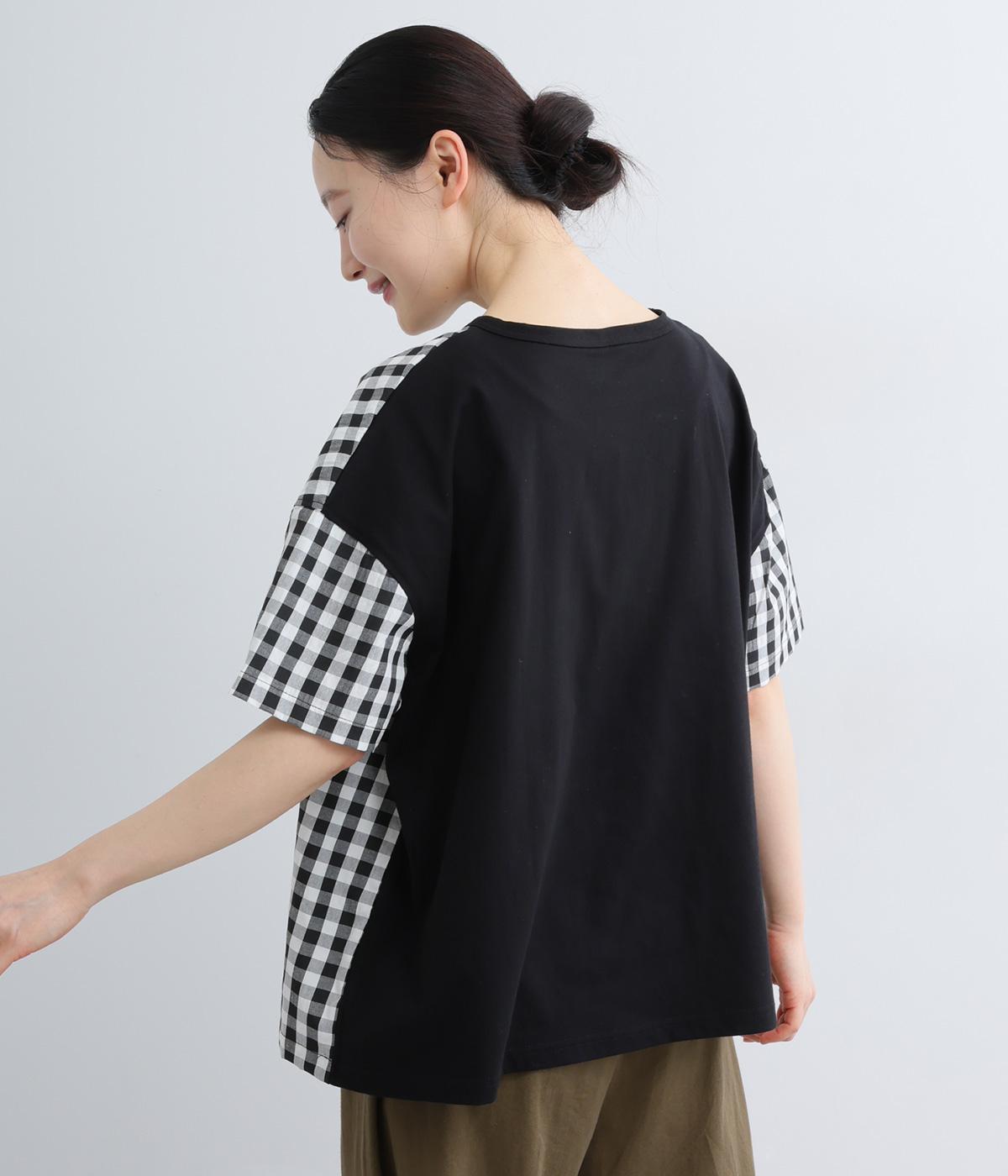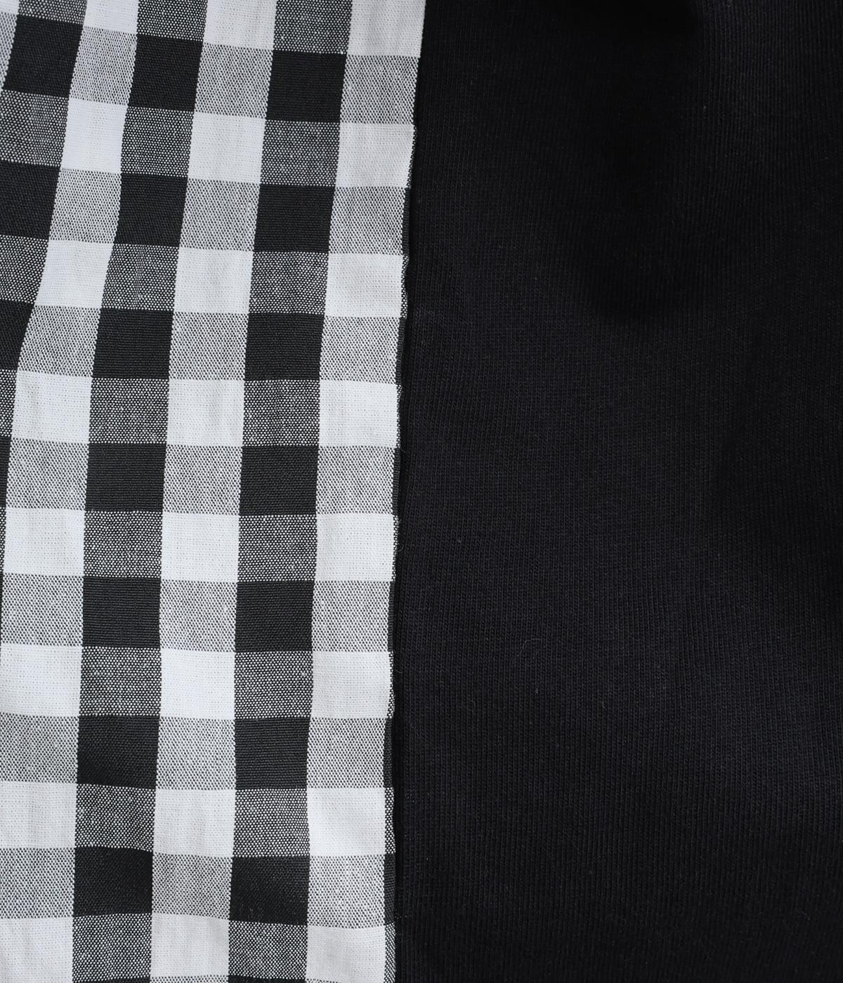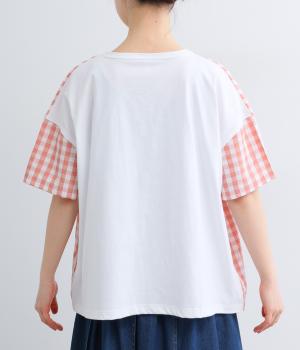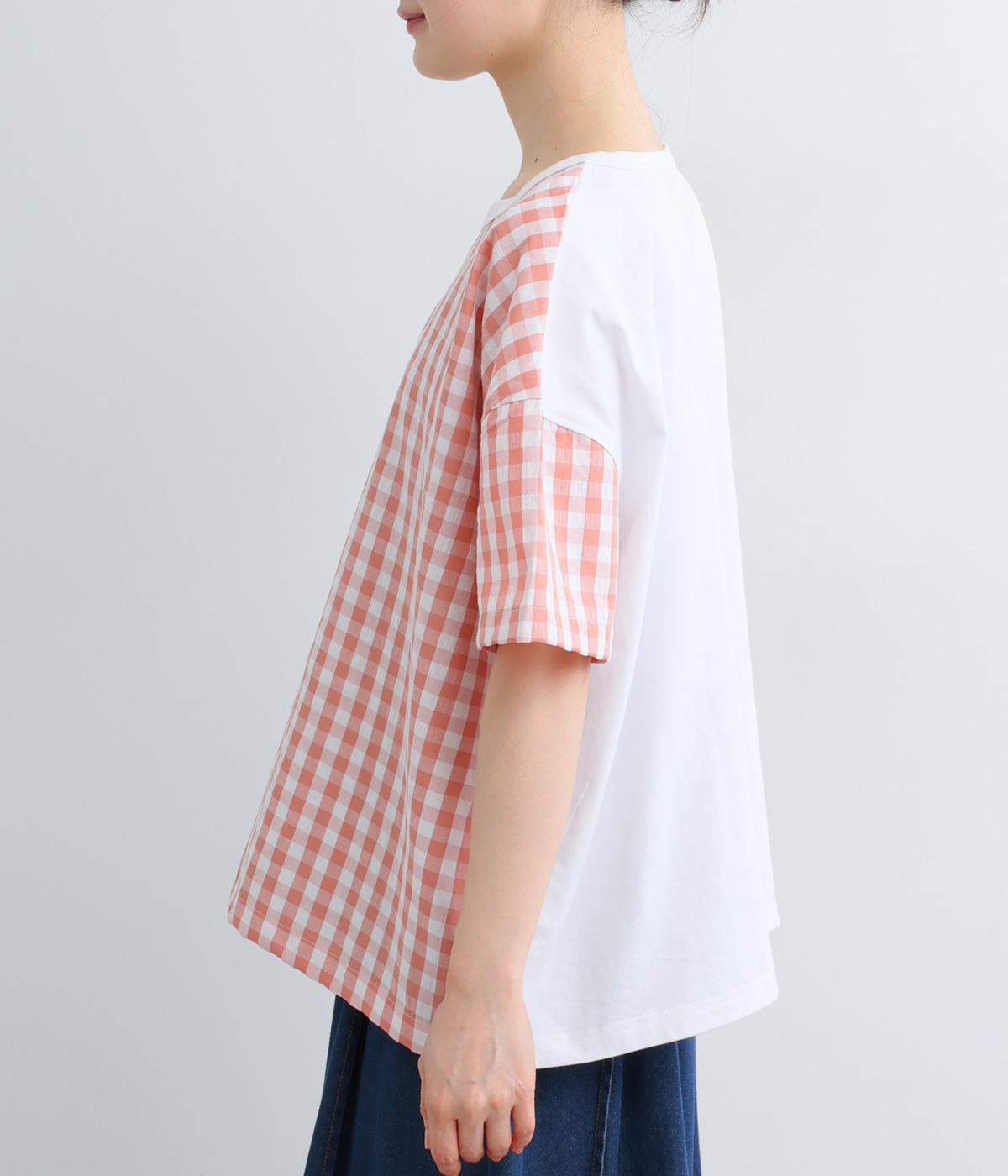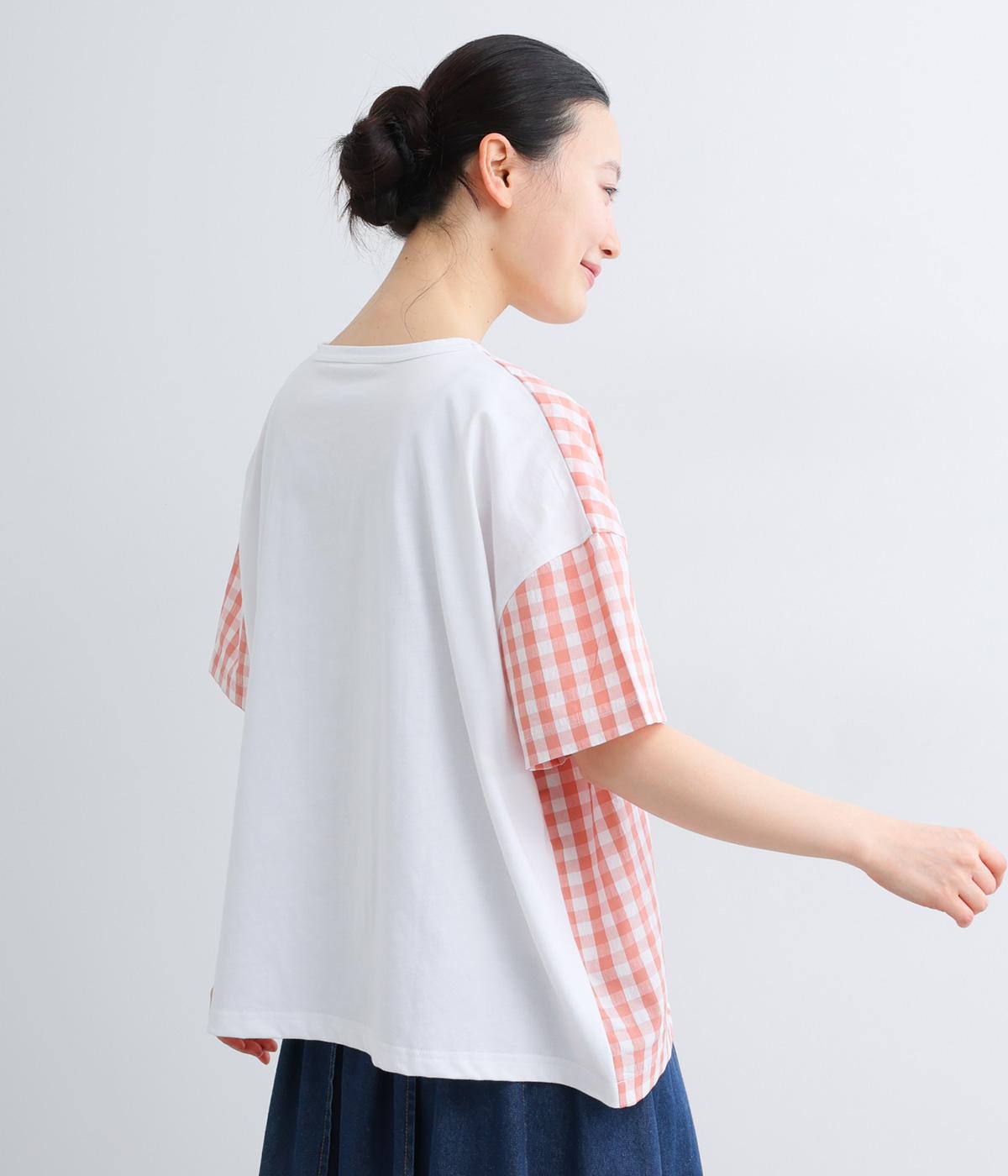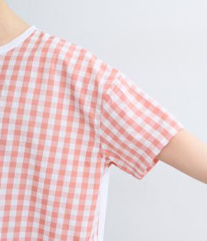 フロントルックはギンガムチェックでさわやかに。後ろはシンプルな無地に切り替えているので、総柄が苦手な方にもトライしやすくまとめました。ゆとりのあるボックスシルエットでカジュアルさを出しています。