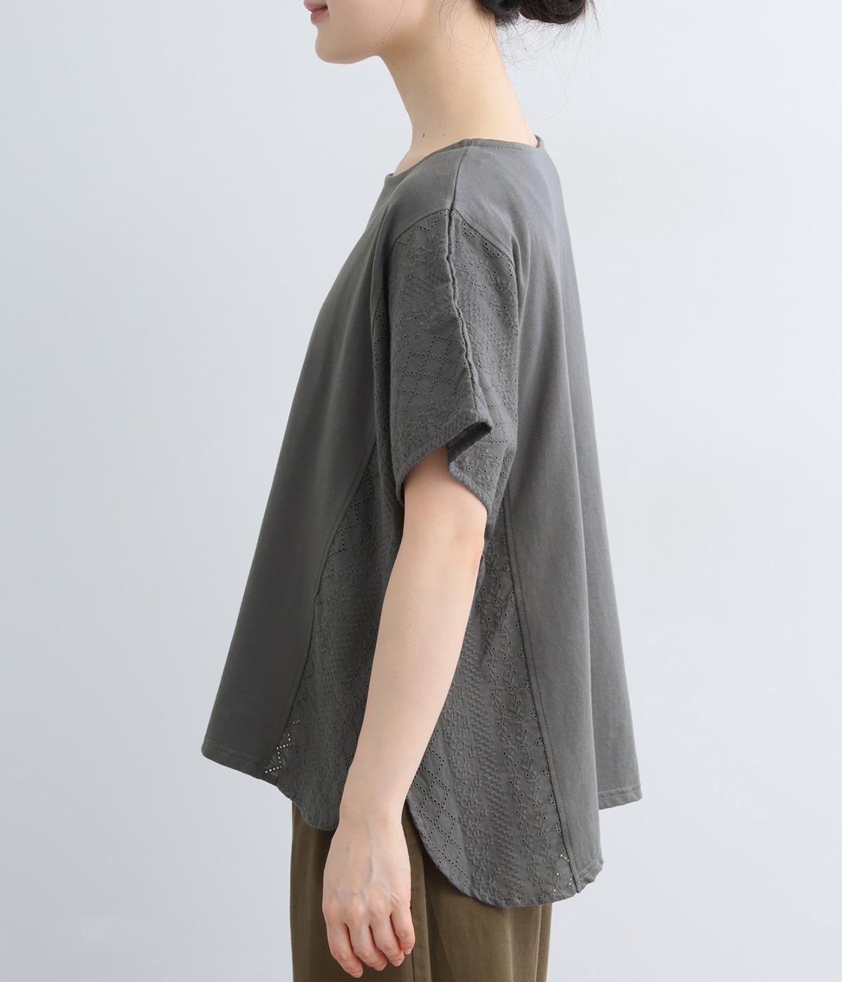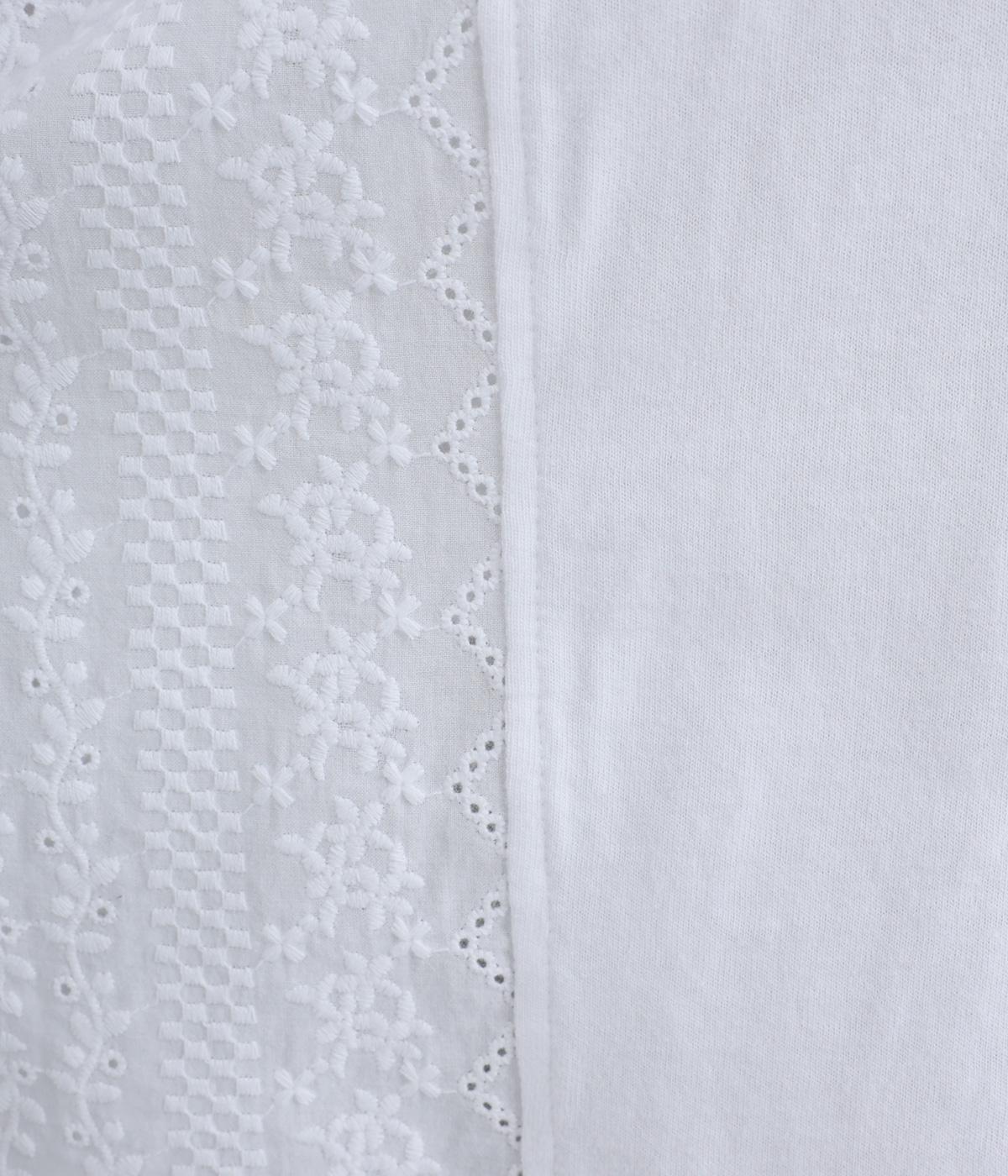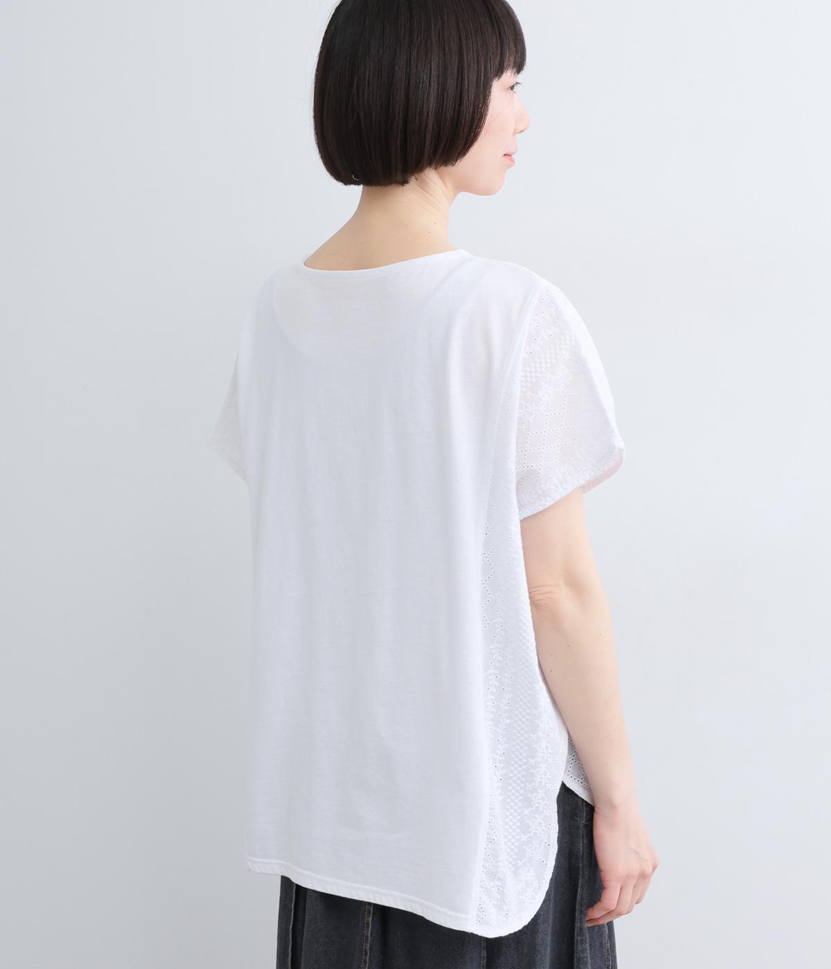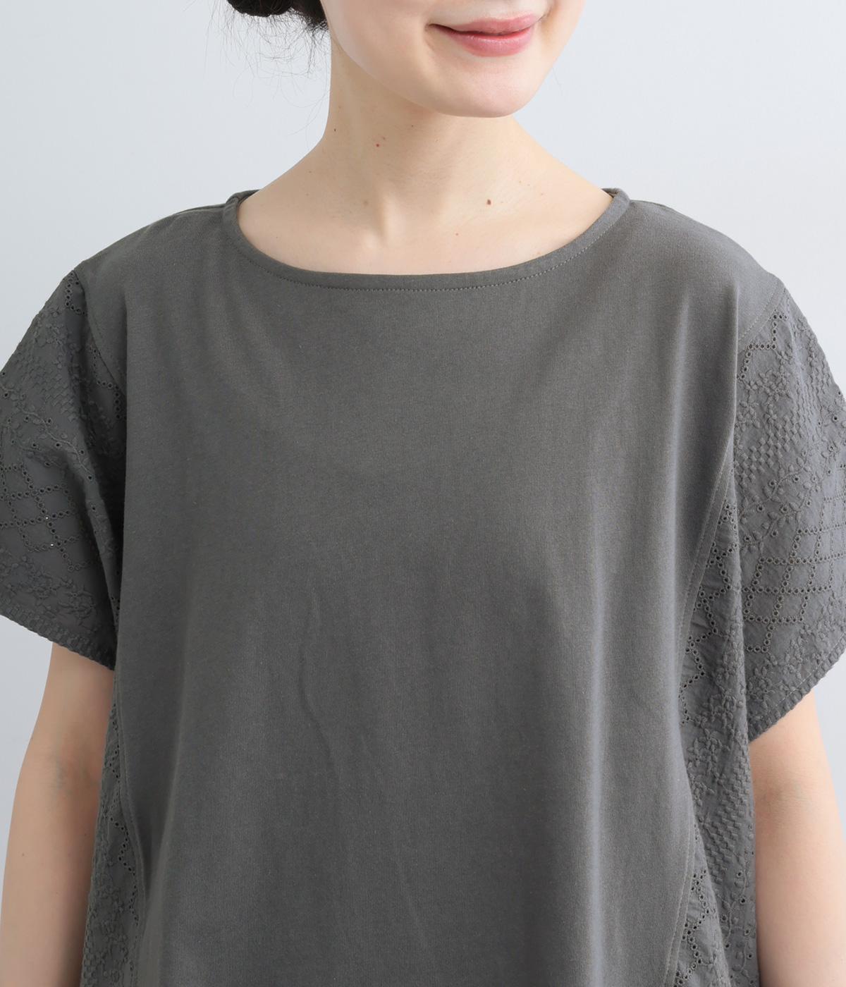 ベースの身頃はやわらかな天竺で着心地よく。袖まわりのサイドはさらりとしたレース生地に切り替えた異素材コンビ。どちらもコットン生地で快適に着用できます。