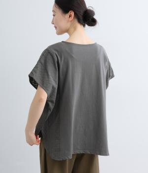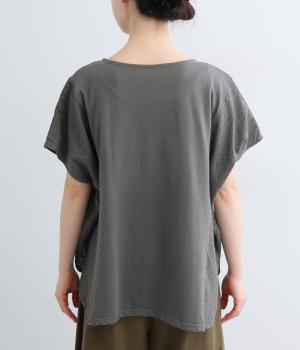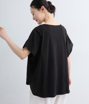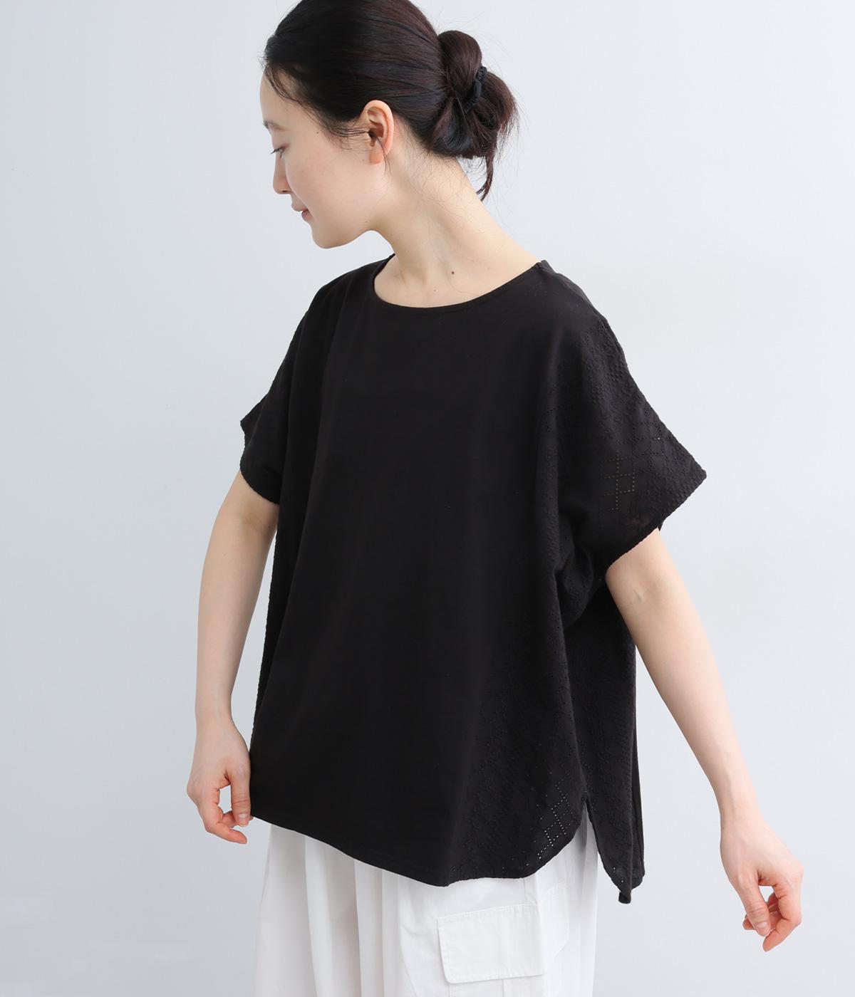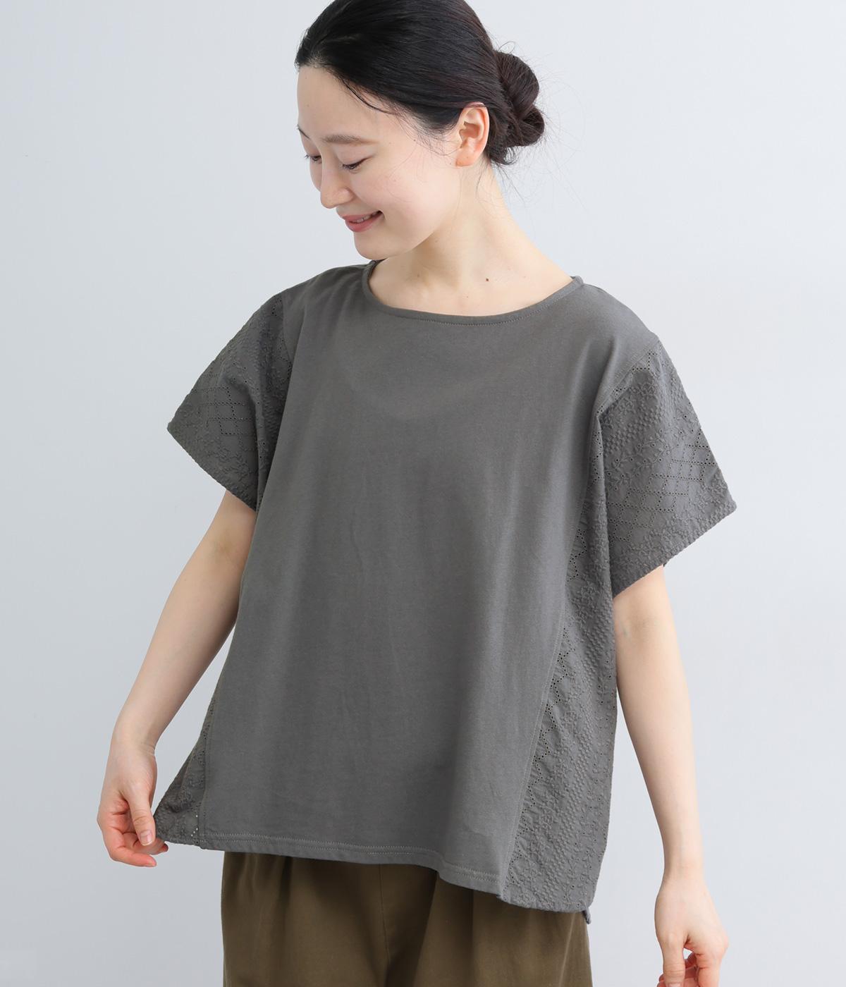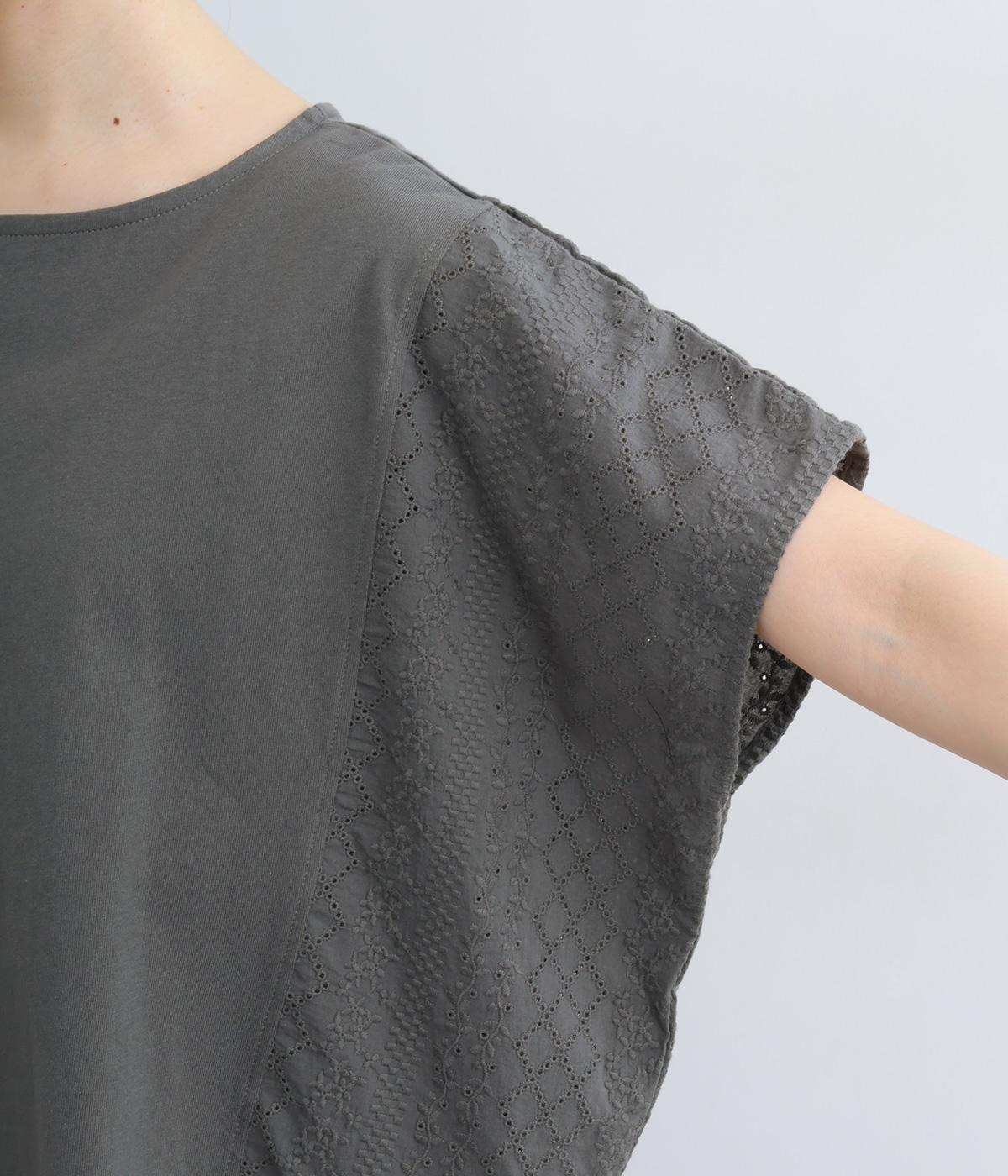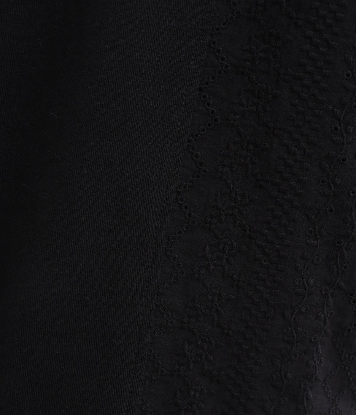 ベースの身頃はやわらかな天竺で着心地よく。袖まわりのサイドはさらりとしたレース生地に切り替えた異素材コンビ。どちらもコットン生地で快適に着用できます。