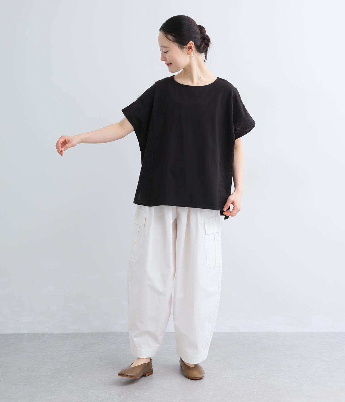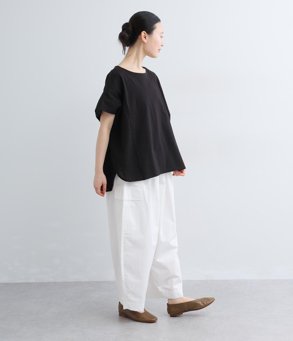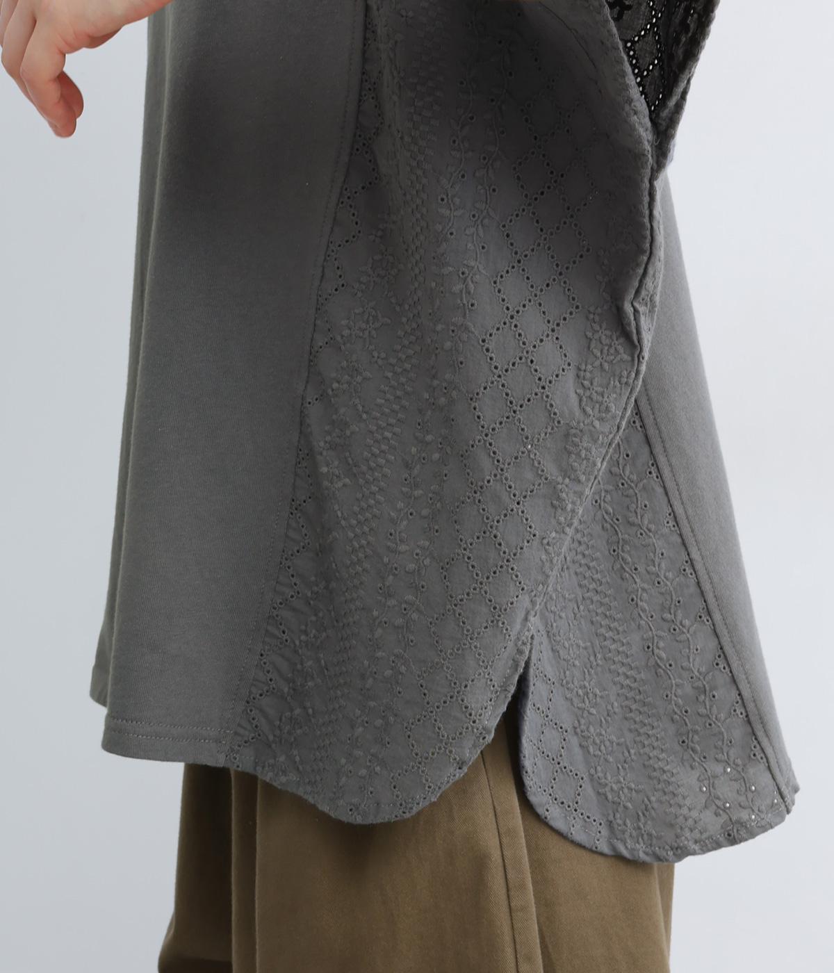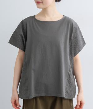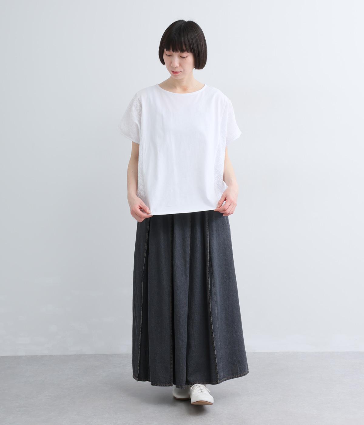 ベースの身頃はやわらかな天竺で着心地よく。袖まわりのサイドはさらりとしたレース生地に切り替えた異素材コンビ。どちらもコットン生地で快適に着用できます。