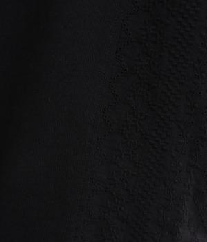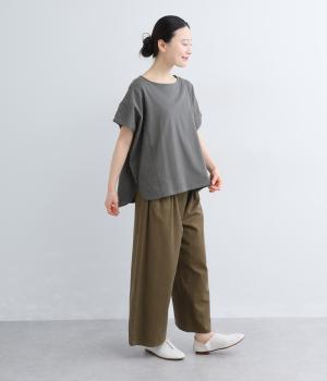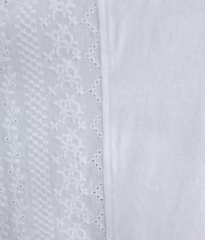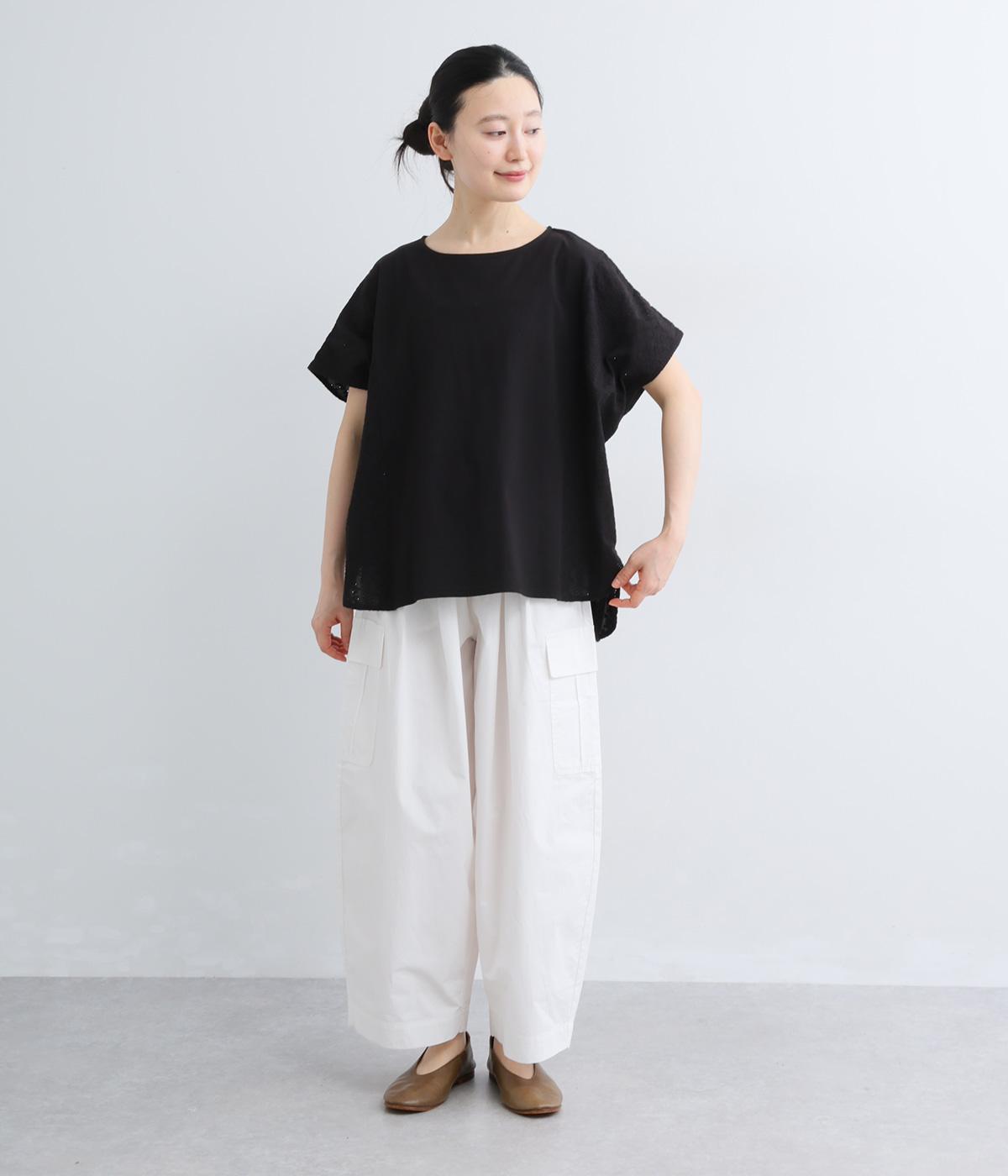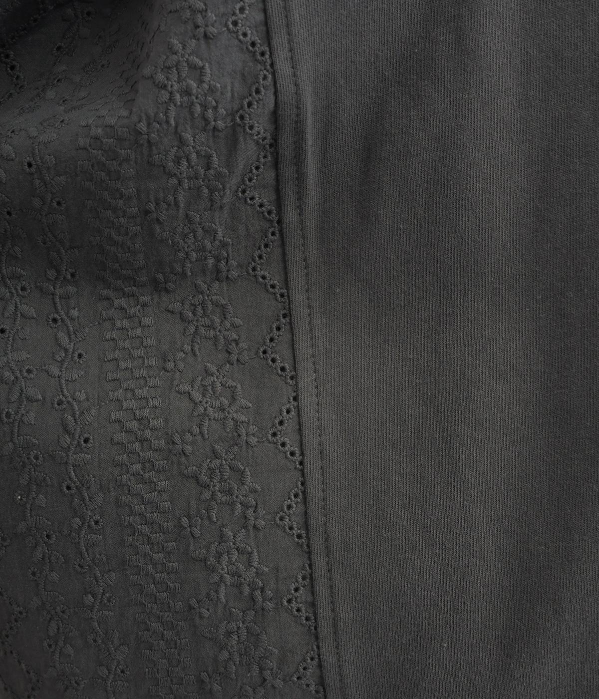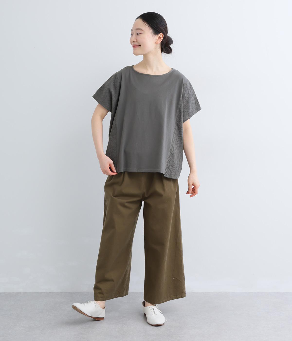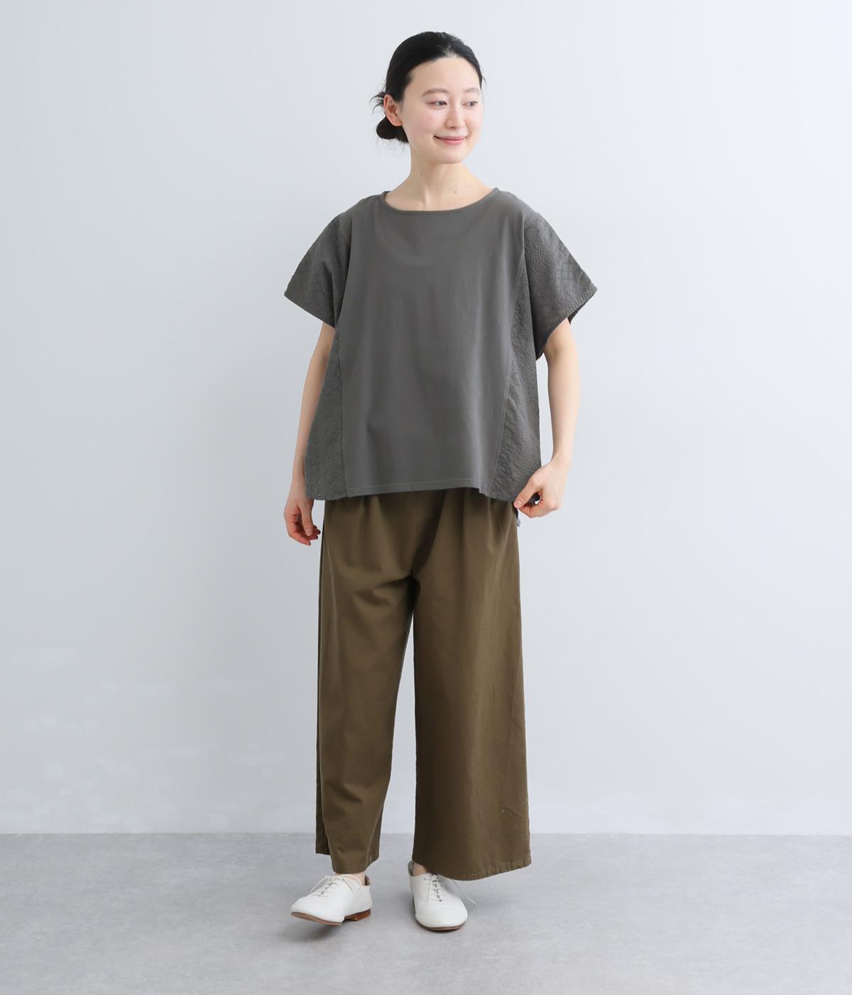 ベースの身頃はやわらかな天竺で着心地よく。袖まわりのサイドはさらりとしたレース生地に切り替えた異素材コンビ。どちらもコットン生地で快適に着用できます。