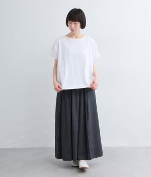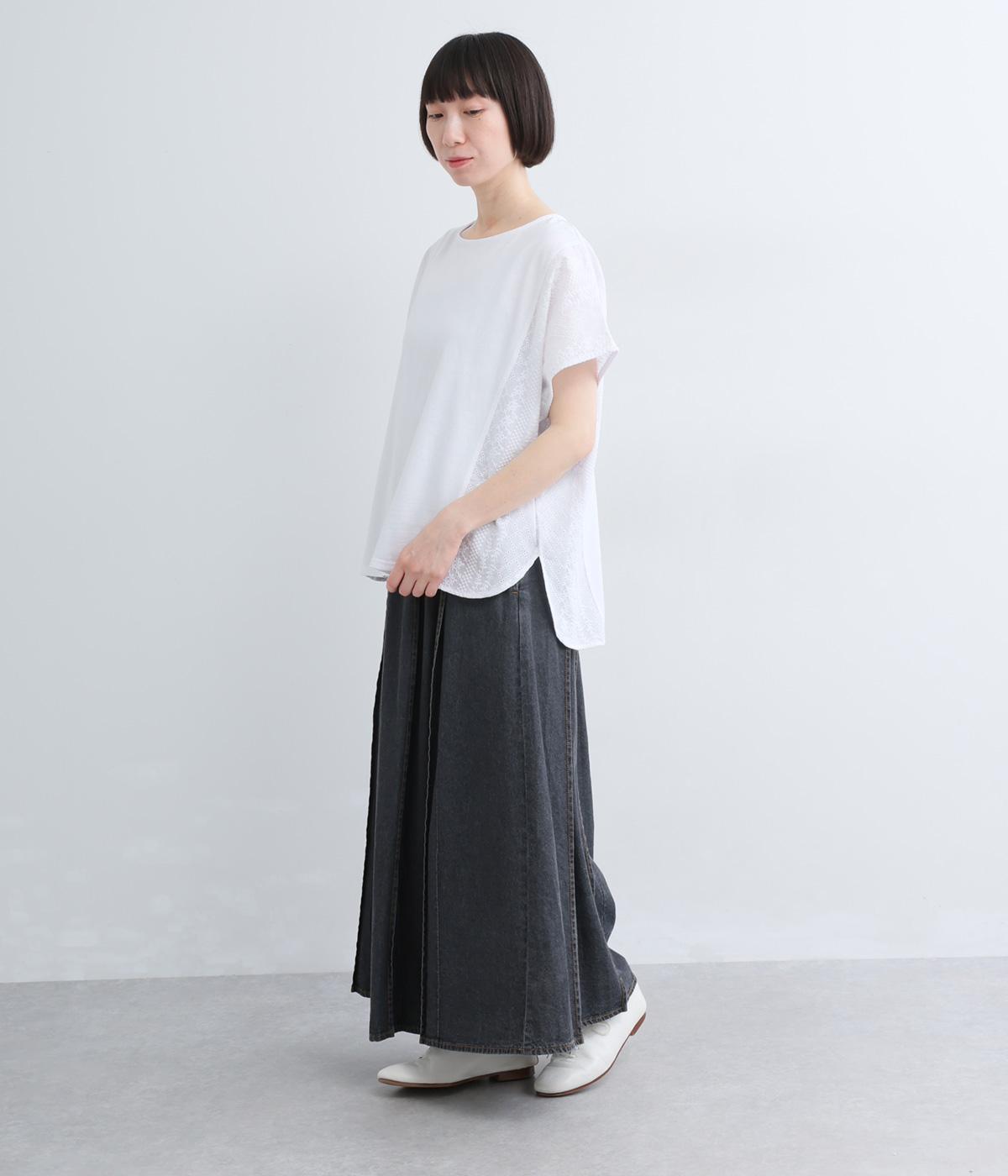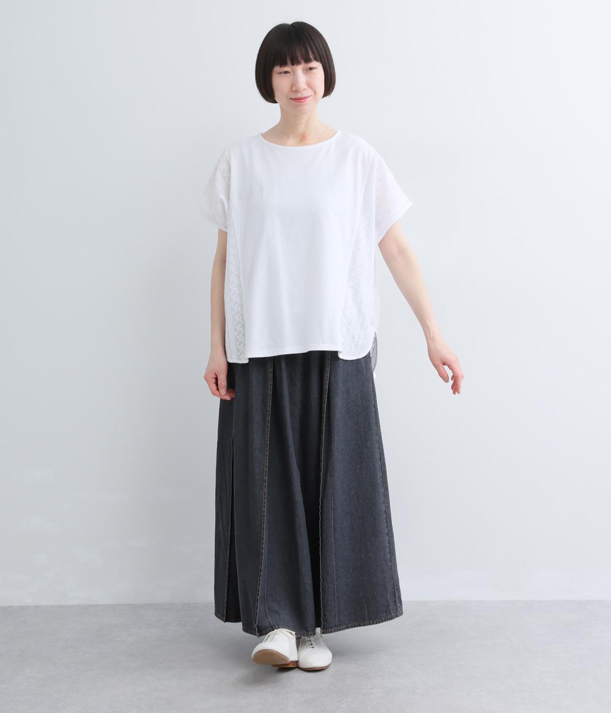 天竺Tシャツのサイドをレース生地に切り替えてフェミニンな要素をプラスしました。ストライプ柄の透けレースがちょうどいい抜け感に。着丈に前後差をつけたラウンドヘムで、トップスアウトもきれいにきまります。