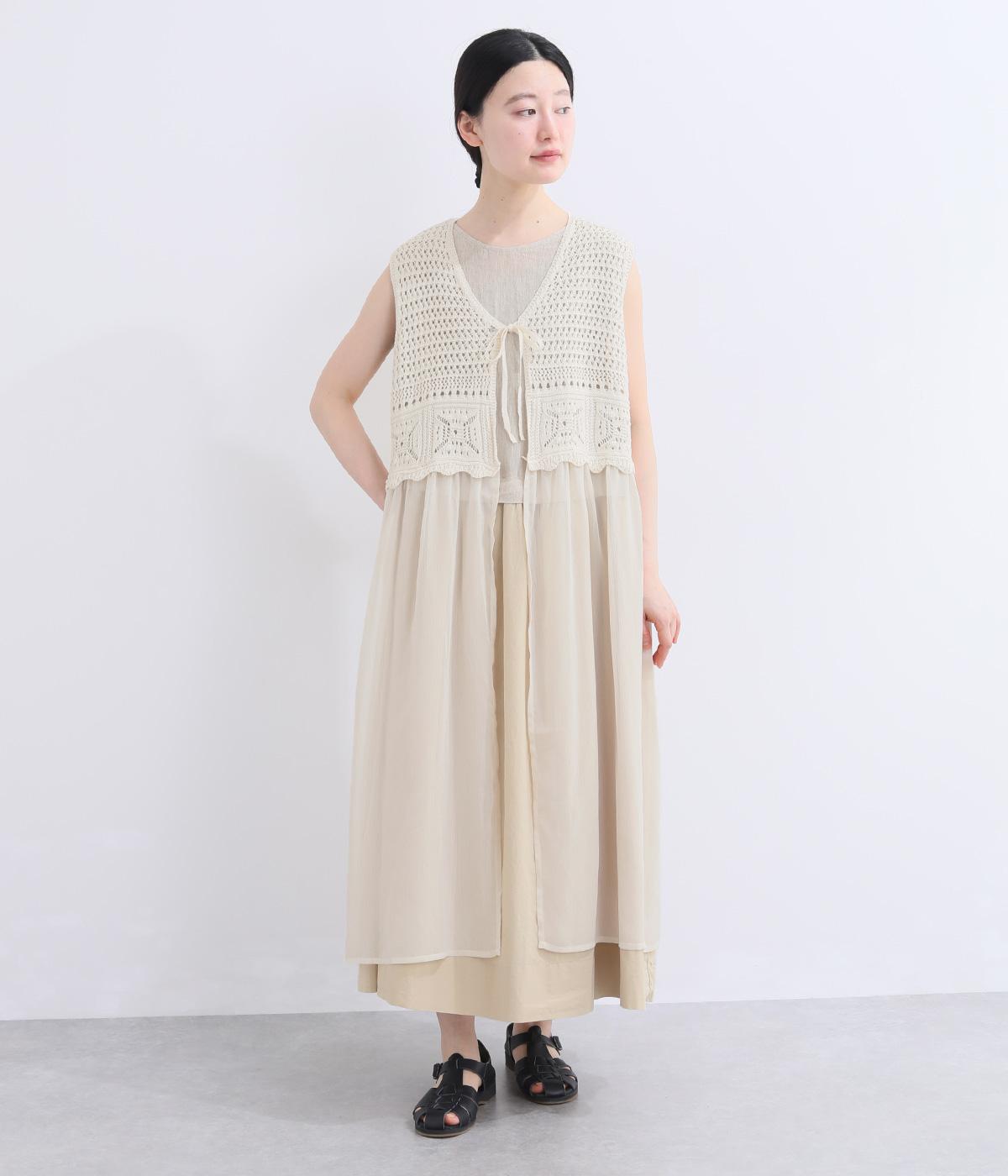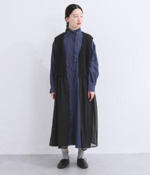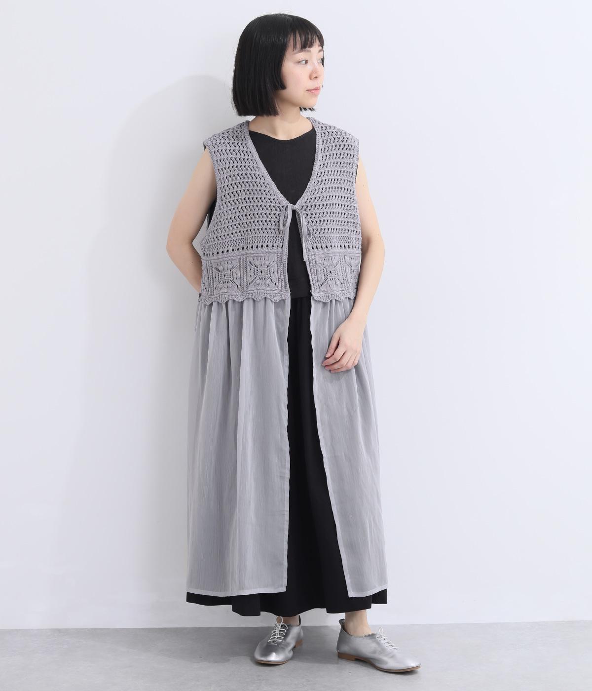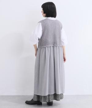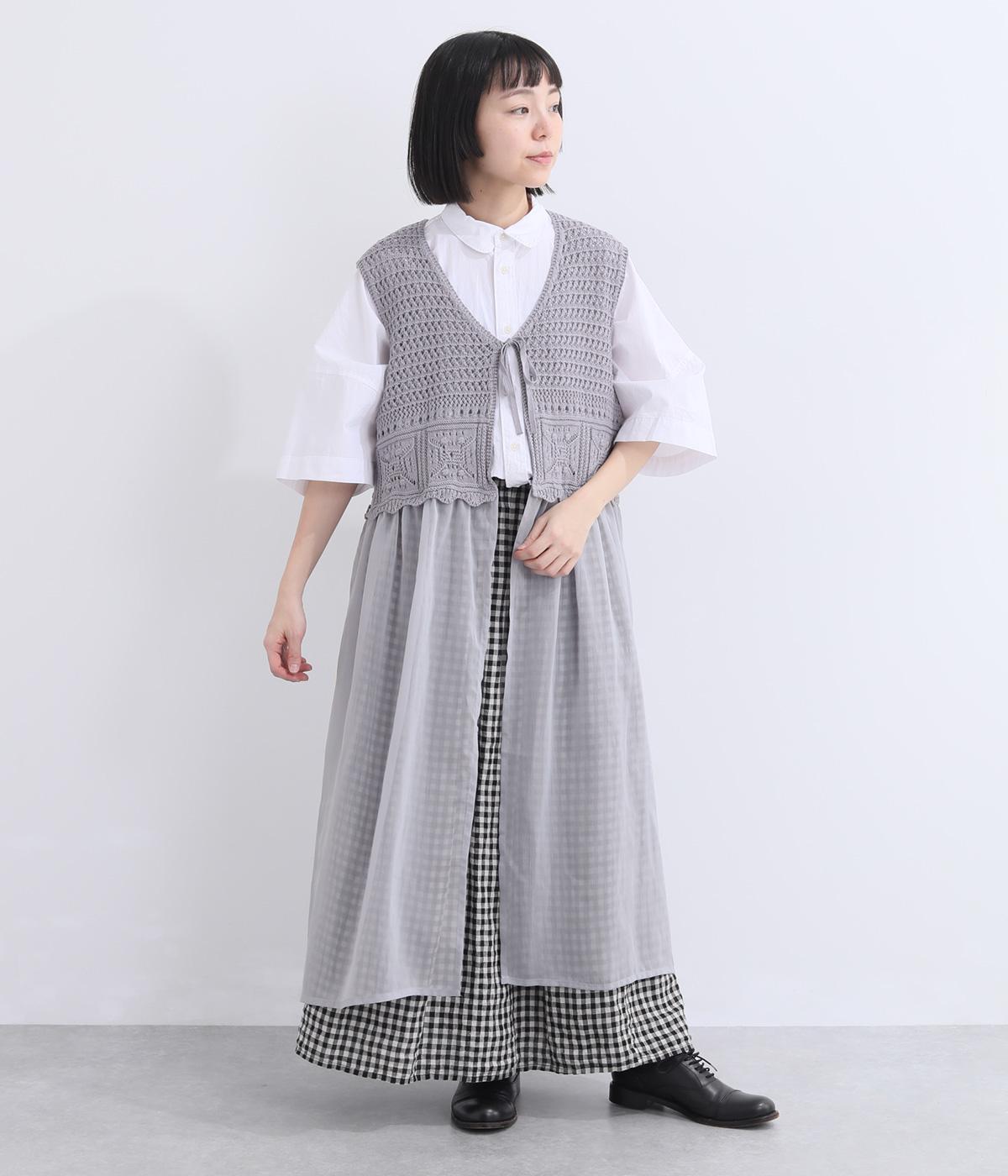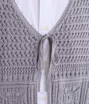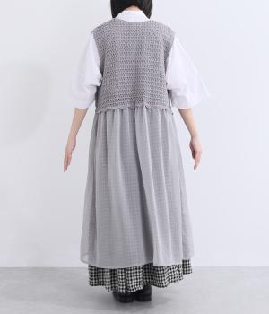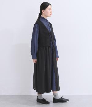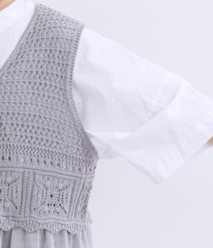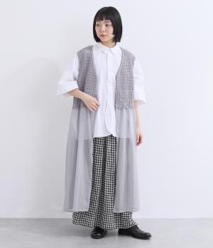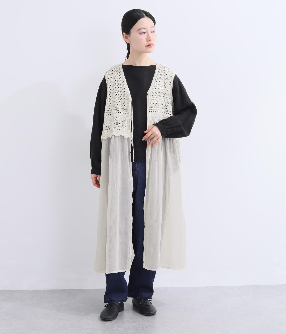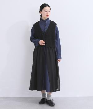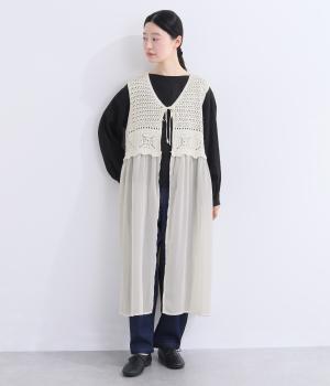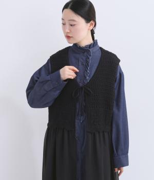 異素材のコントラストが奥行きのある表情を添えるジレです。太陽をモチーフにした編み柄がやさしい印象を添えます。ニワトリをデザインしたピスネームがワンポイント。レイヤードしたときにバランスよく決まる丈感にもこだわりました。