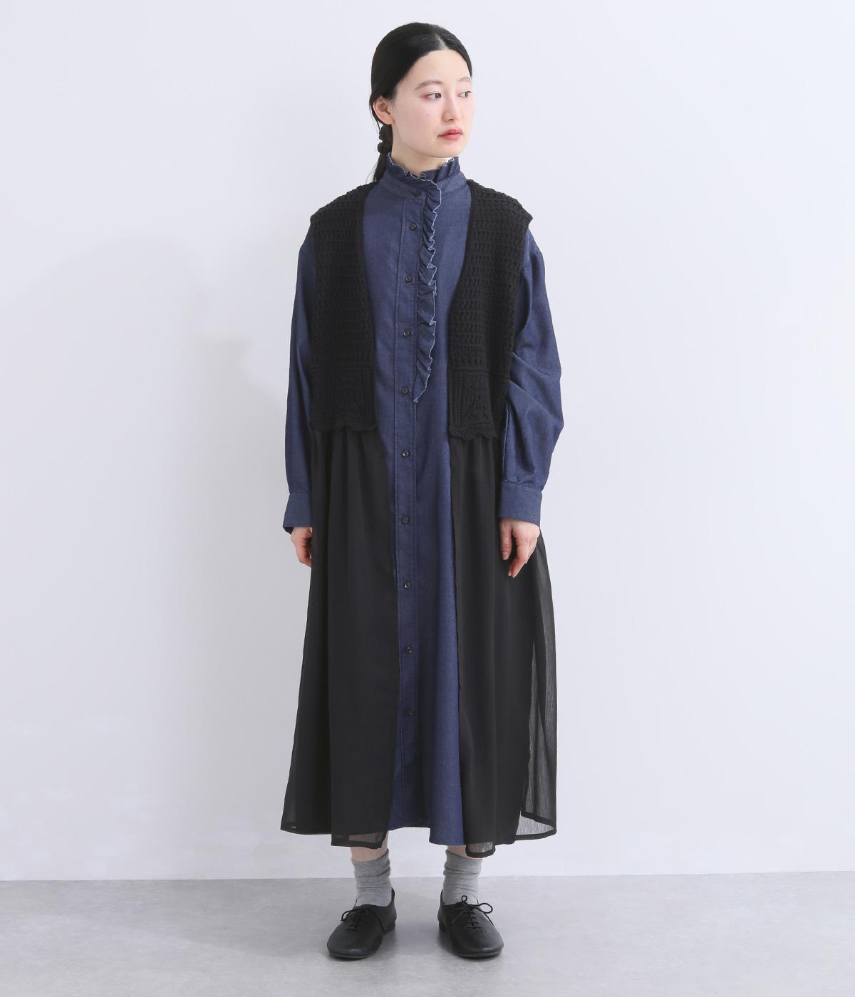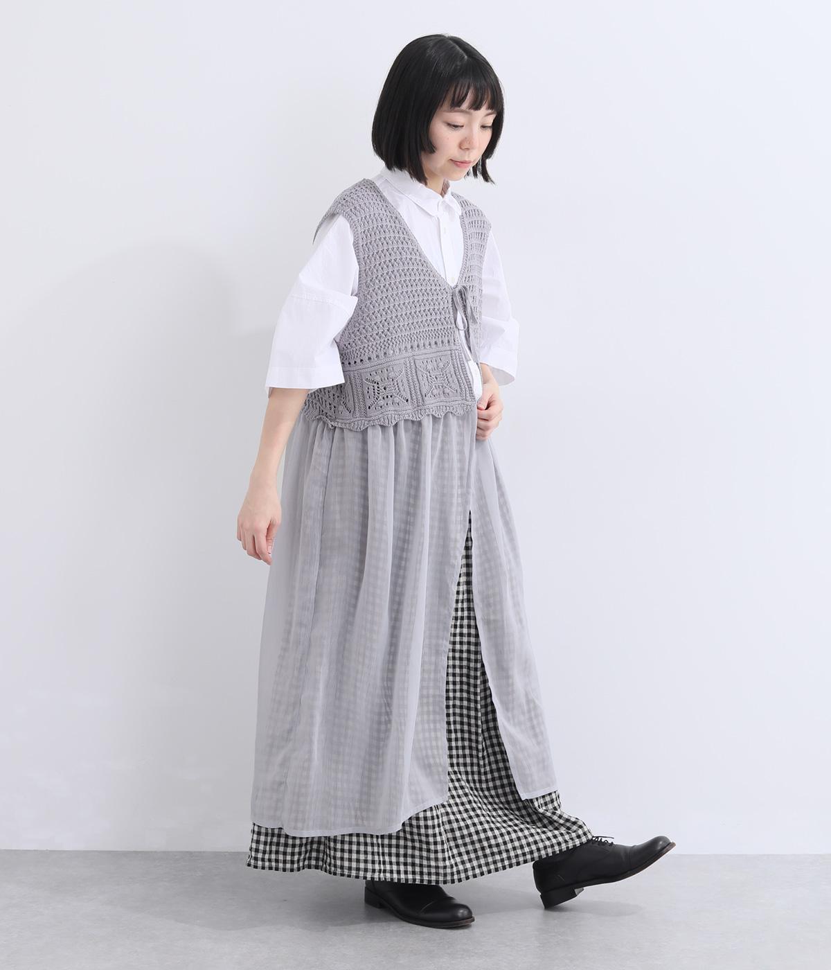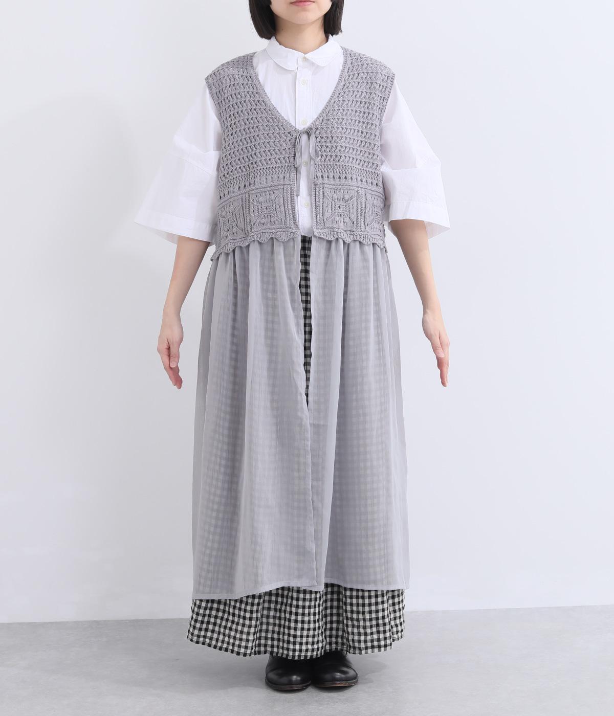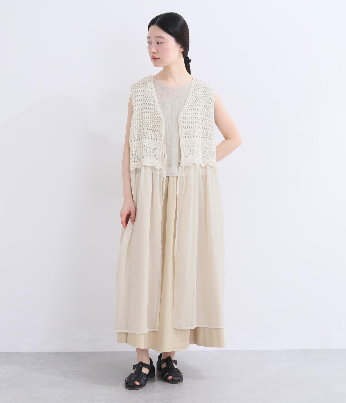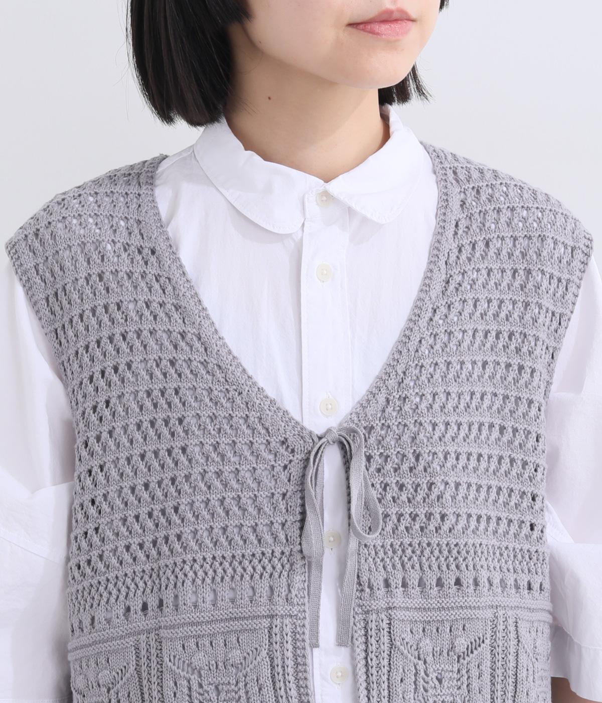 異素材のコントラストが奥行きのある表情を添えるジレです。太陽をモチーフにした編み柄がやさしい印象を添えます。ニワトリをデザインしたピスネームがワンポイント。レイヤードしたときにバランスよく決まる丈感にもこだわりました。