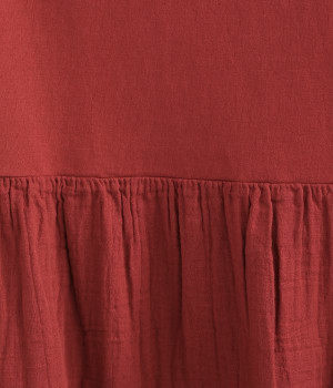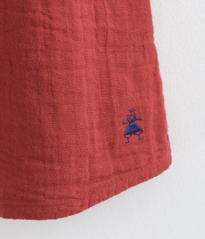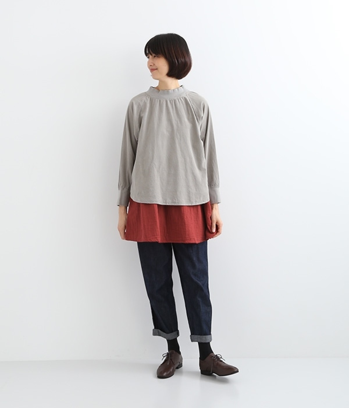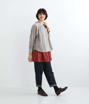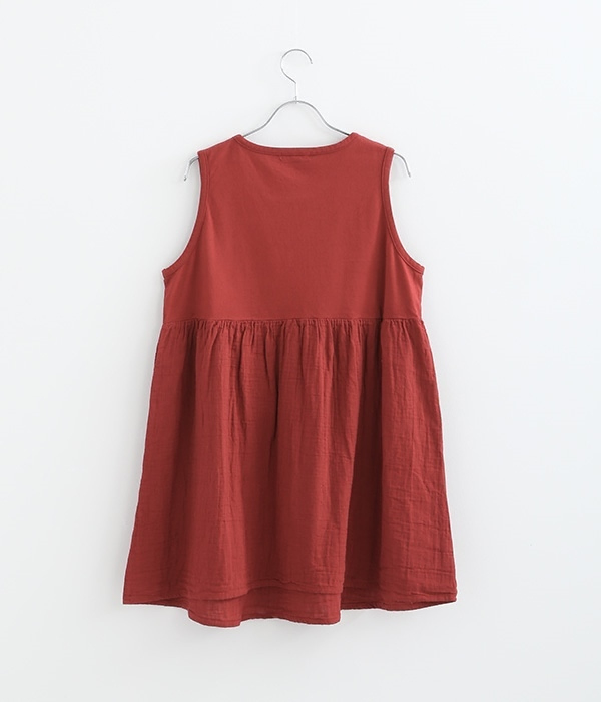 天竺とダブルガーゼの異素材を組み合わせた、切り替えデザインのチュニックです。上身頃部分の天竺は伸縮性があるので着心地よく、ダブルガーゼもやさしい表情を持ちあわせています。ショート丈のプルオーバーを合わせてガーゼ部分をのぞかせたりと、レイヤードを楽しめるインナーアイテムです。裾にちょこんと描かれた刺しゅうが可愛らしいワンポイントです。