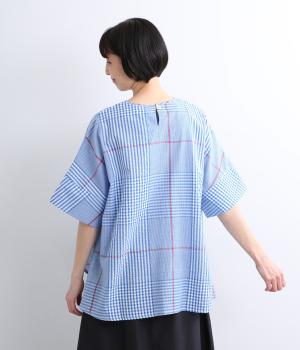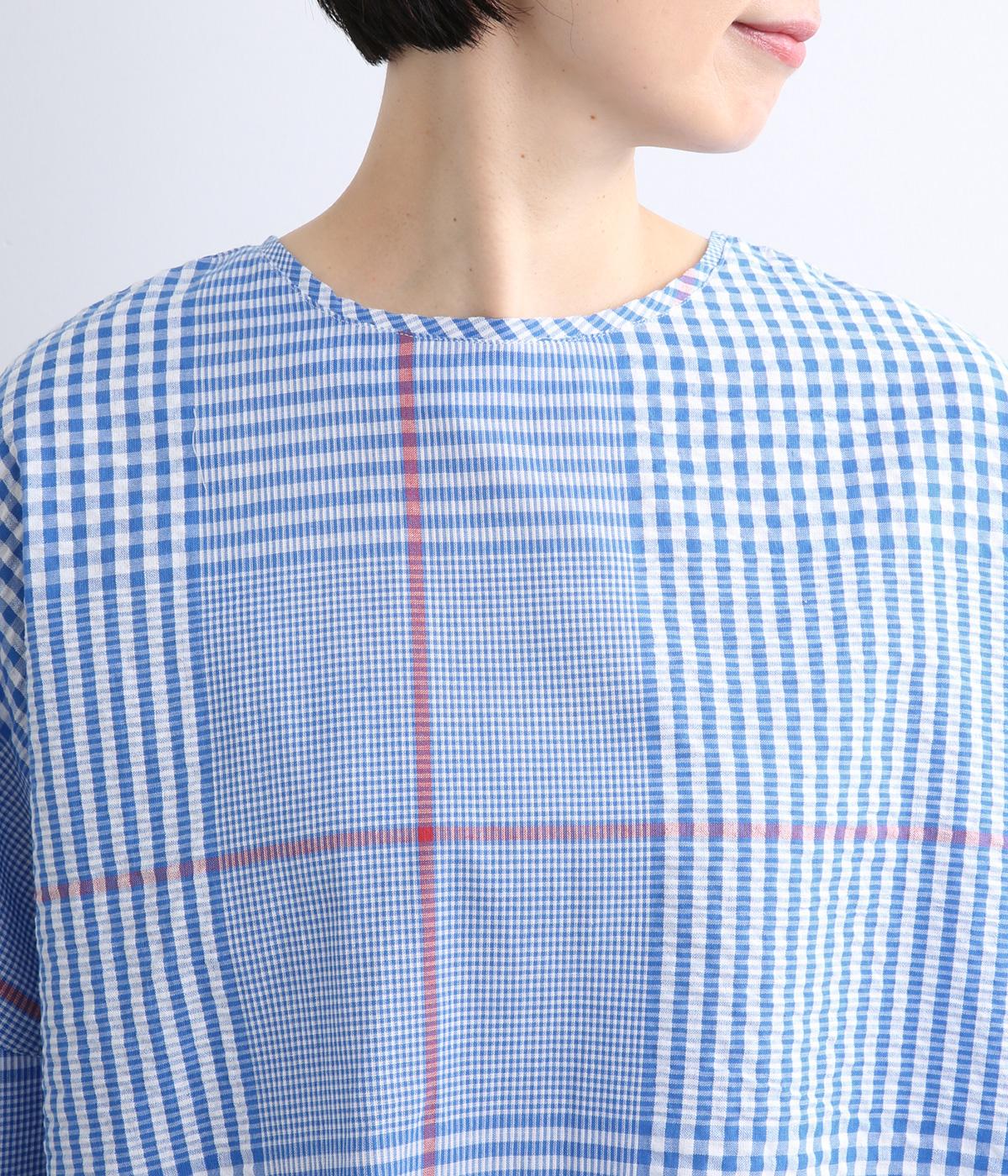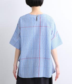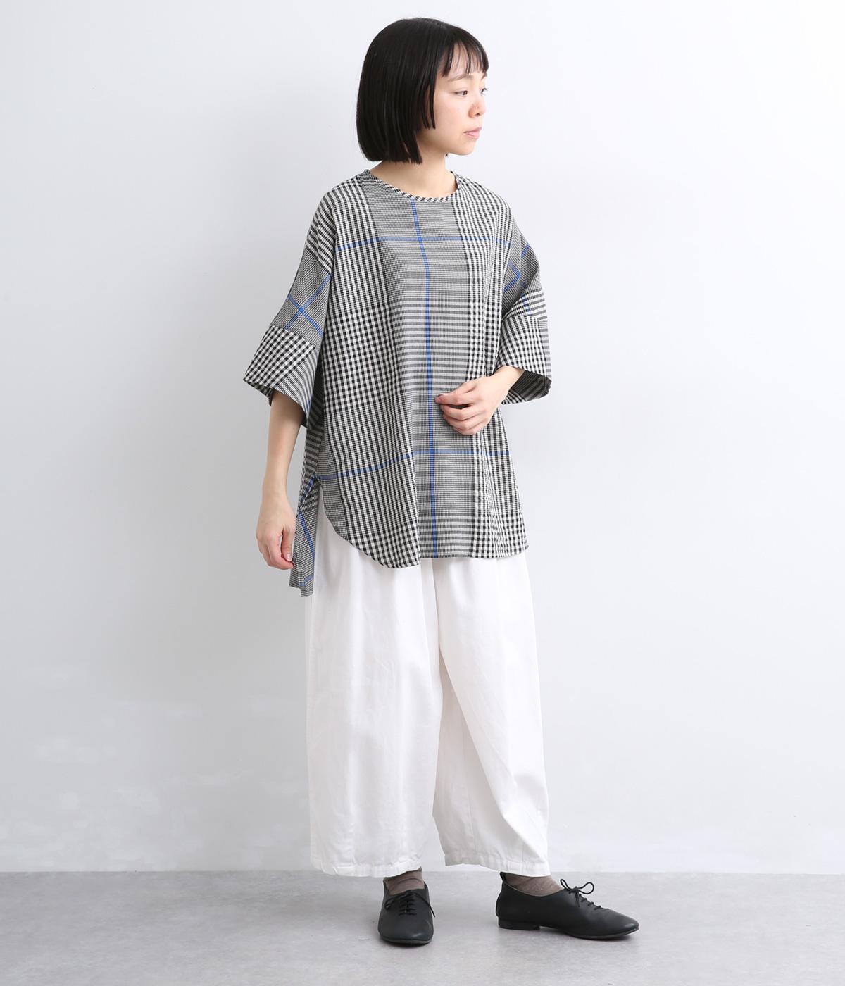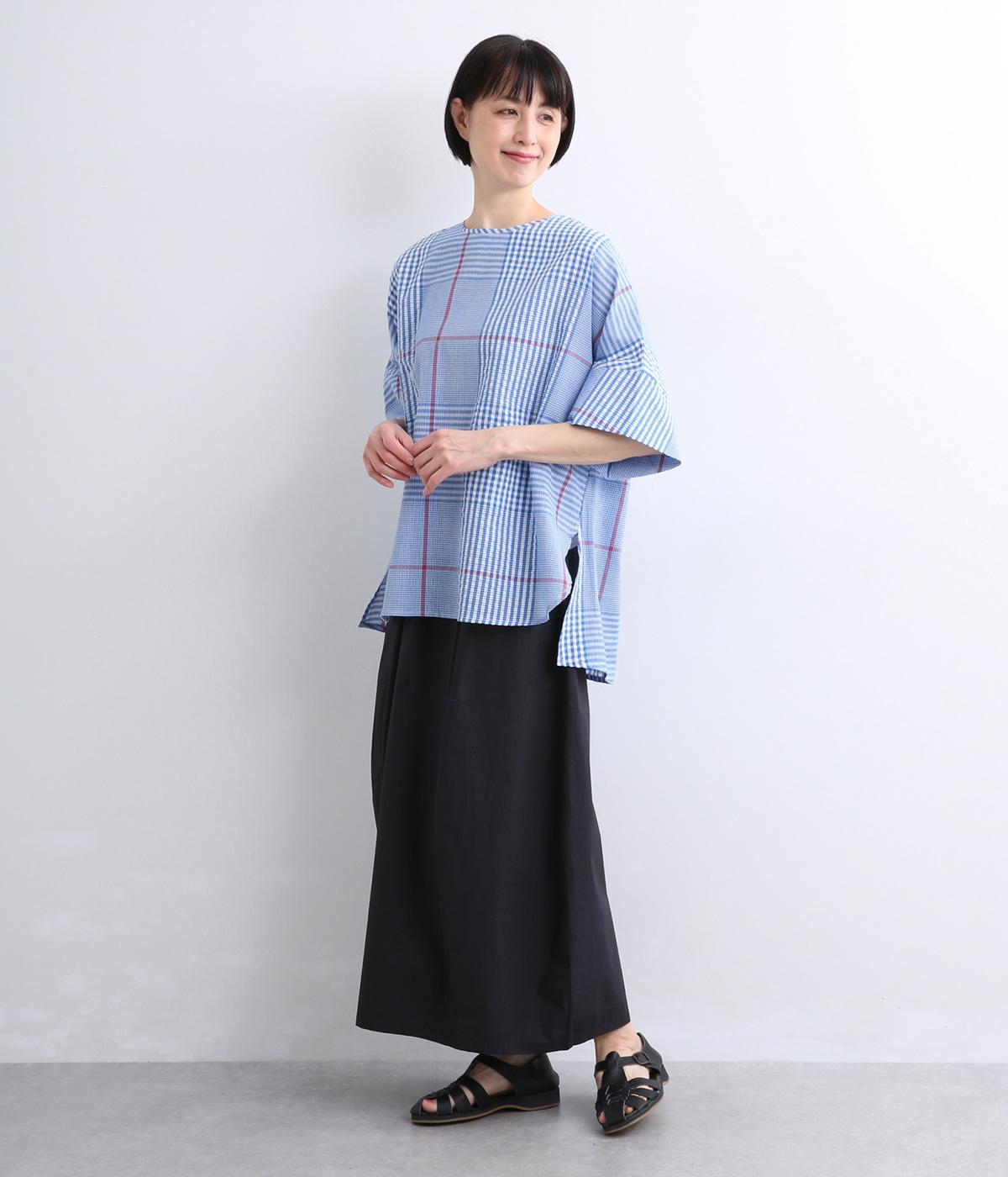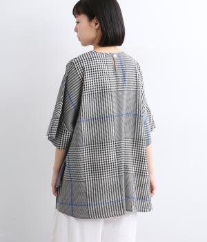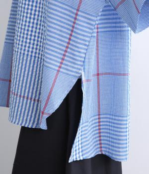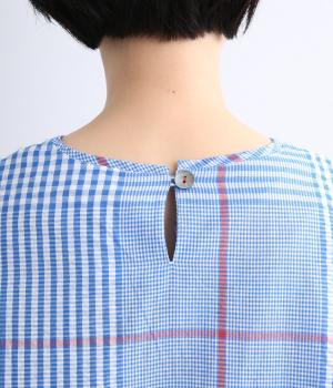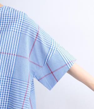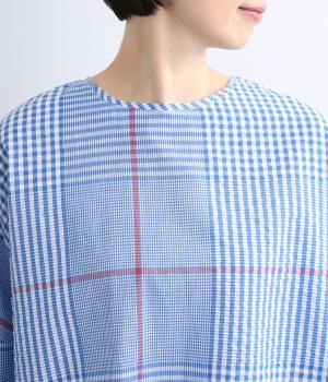 やわらかなベースカラーに配色ラインを効かせ、アクセントのあるチェック柄に仕立てました。裾のラインとヒップまでかかる着丈で体型をカバーしつつ、風をまとうような軽やかなシルエットに。一枚でさらっとコーディネートが決まるチュニックです。