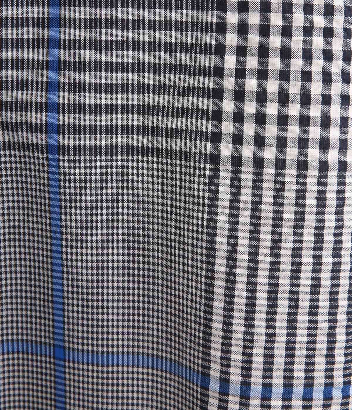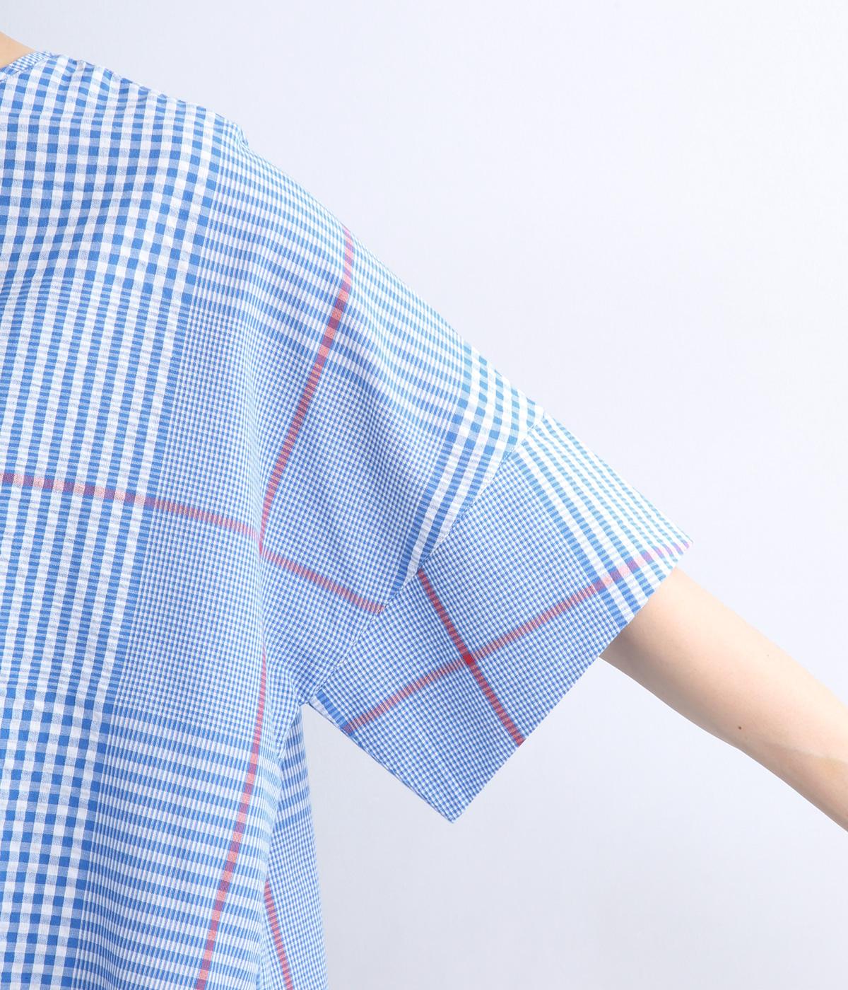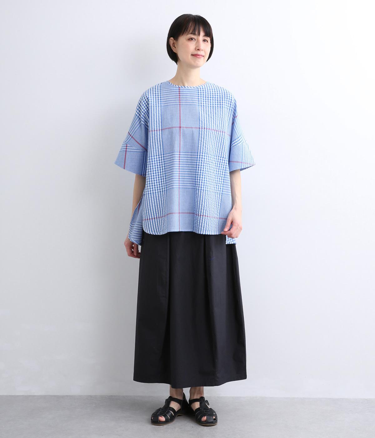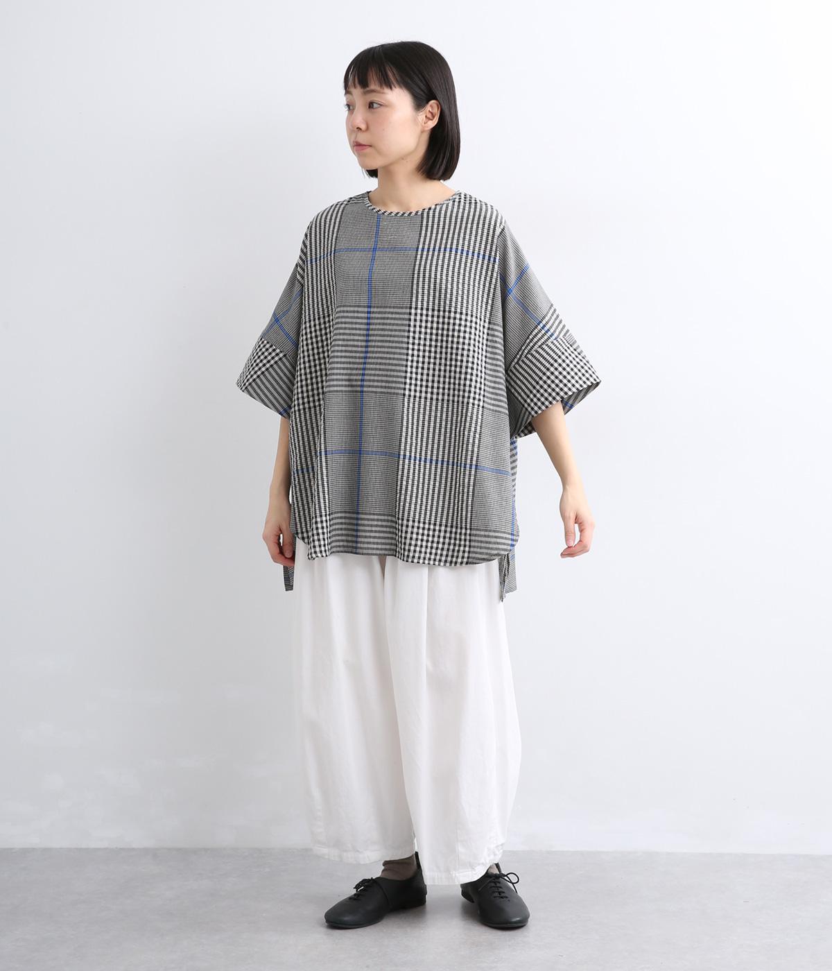 やわらかなベースカラーに配色ラインを効かせ、アクセントのあるチェック柄に仕立てました。裾のラインとヒップまでかかる着丈で体型をカバーしつつ、風をまとうような軽やかなシルエットに。一枚でさらっとコーディネートが決まるチュニックです。