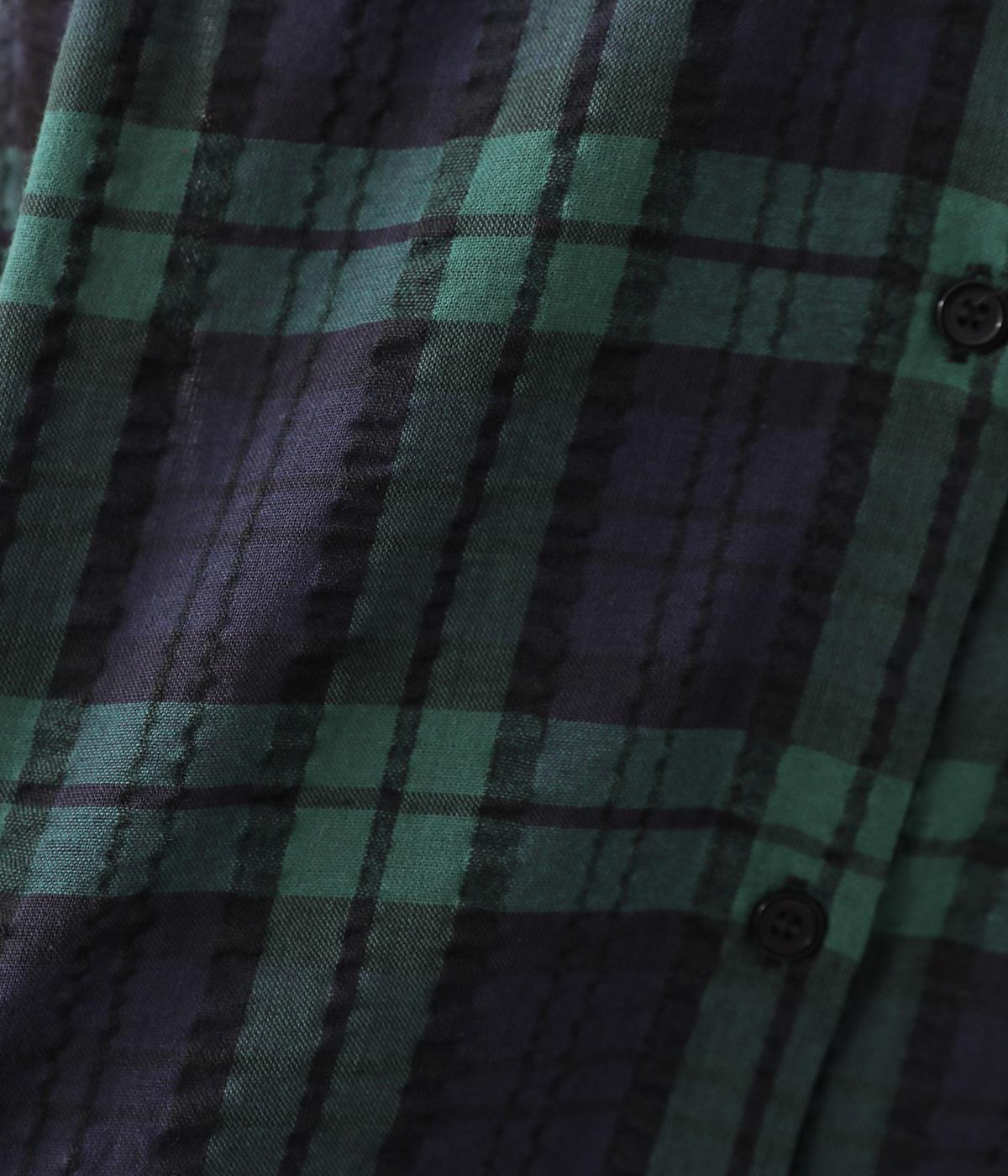 ぽこぽことした凹凸感のある、チェック柄のサッカー生地を使用しています。薄手で軽く、通気性が良いので汗ばむ時期にもぴったり。ご自宅で手洗い可能なのも嬉しいポイントです。