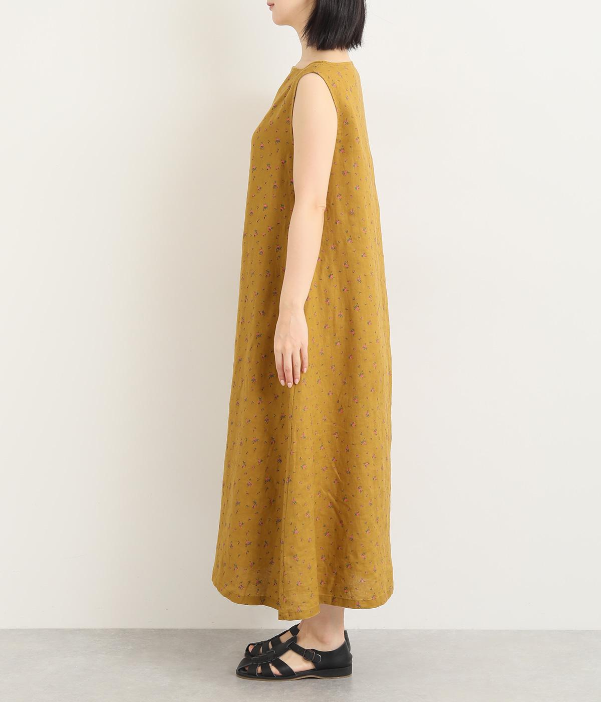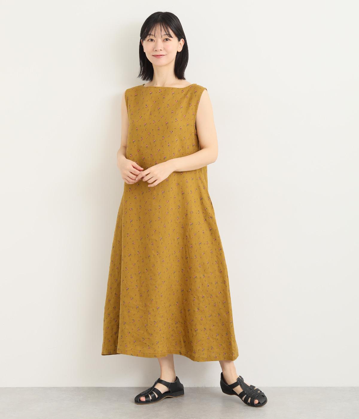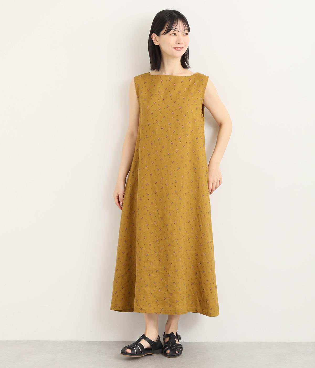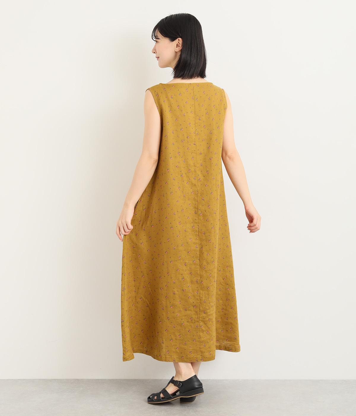 リネン小花プリントノースリーブワンピース(マスタード-M)