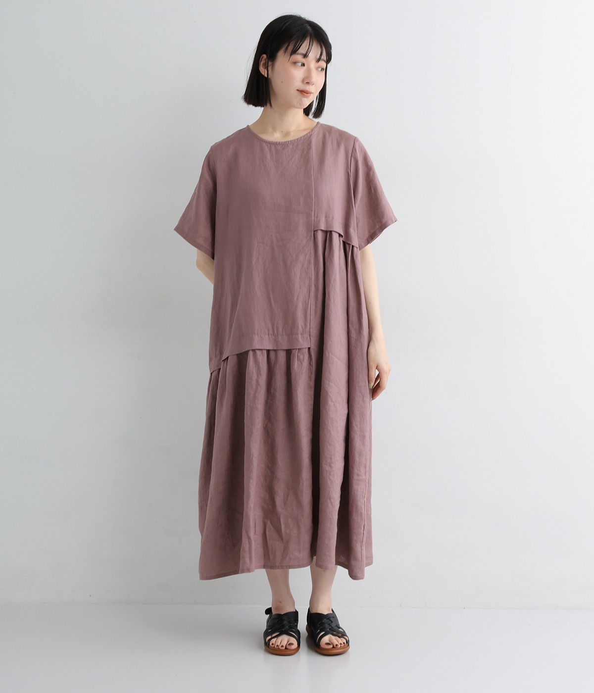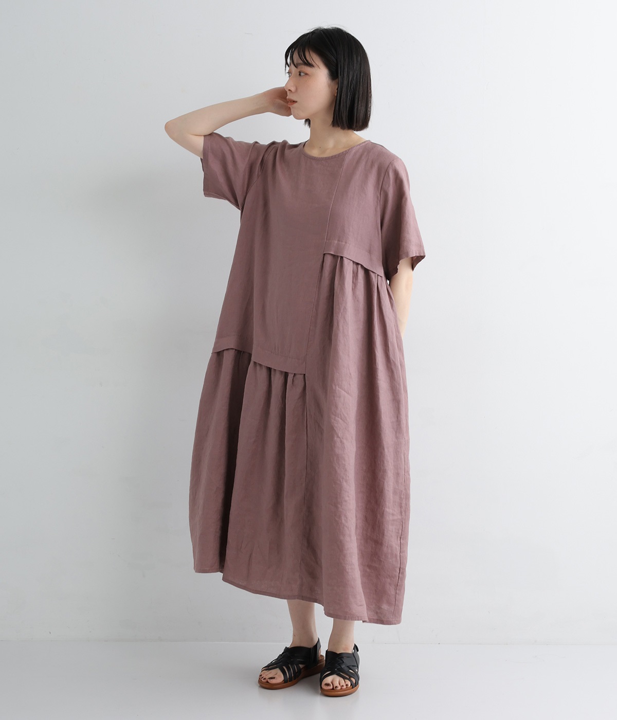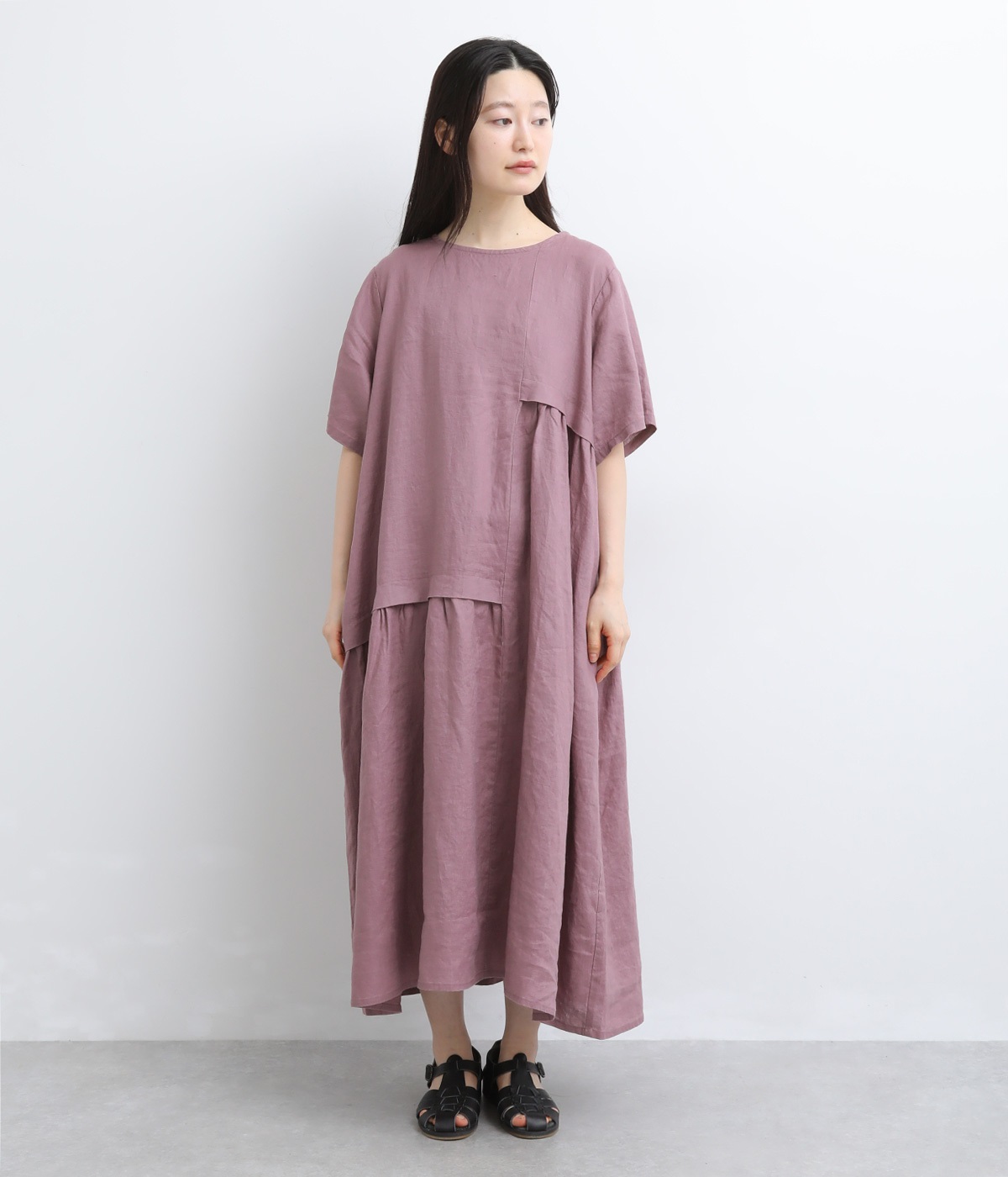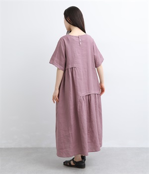 左右非対称のアシンメトリーデザインが目を惹くギャザーワンピース。立体感のある豊かな表情が、夏の装いを華やかに彩ります。
