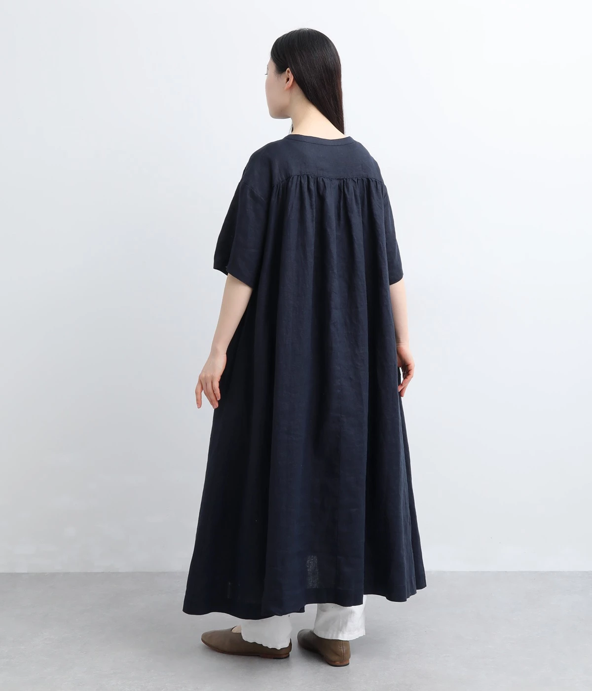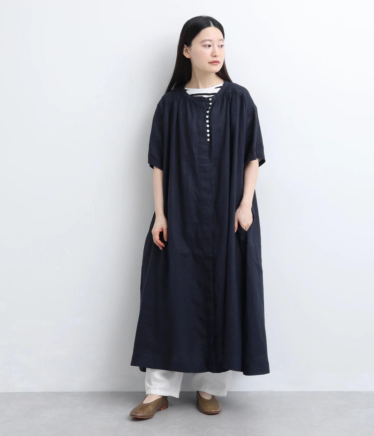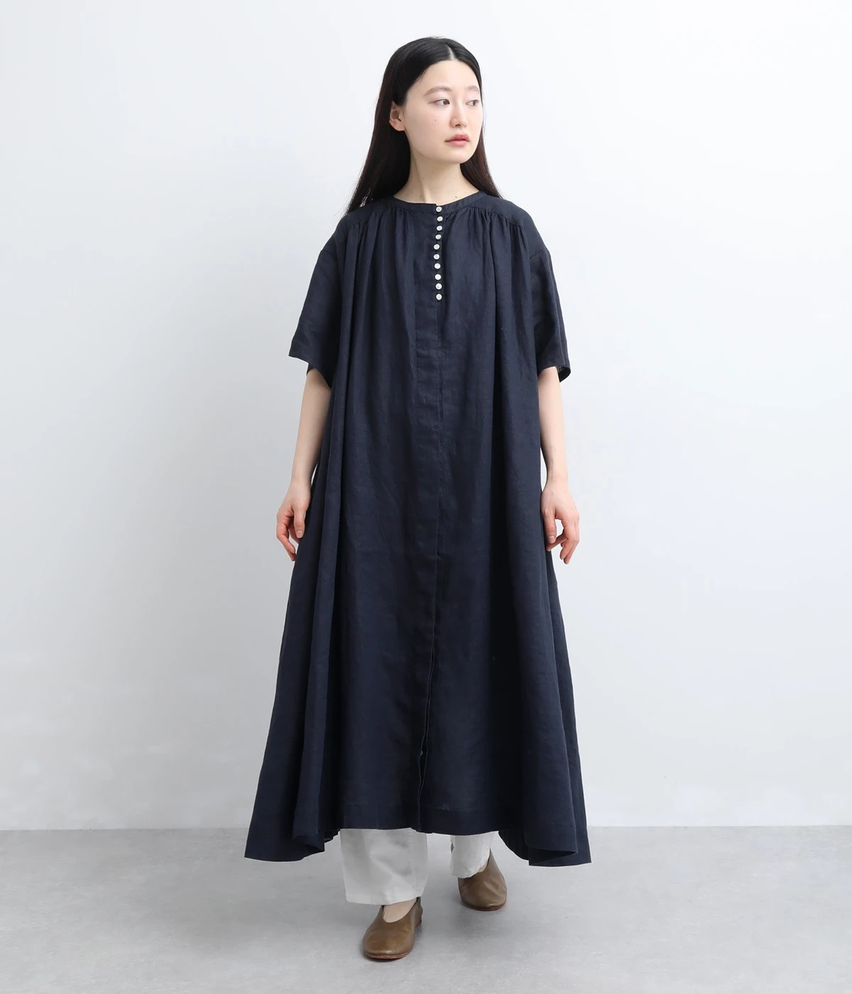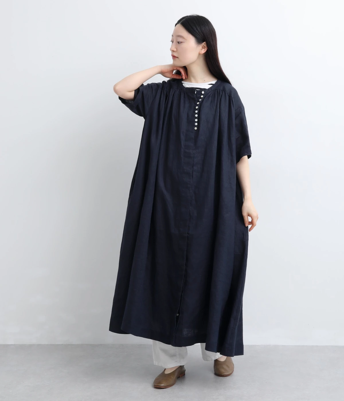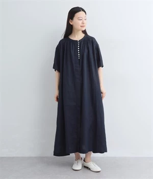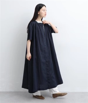 14番手リネン多ボタンギャザーワンピース