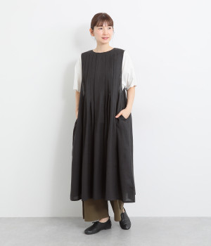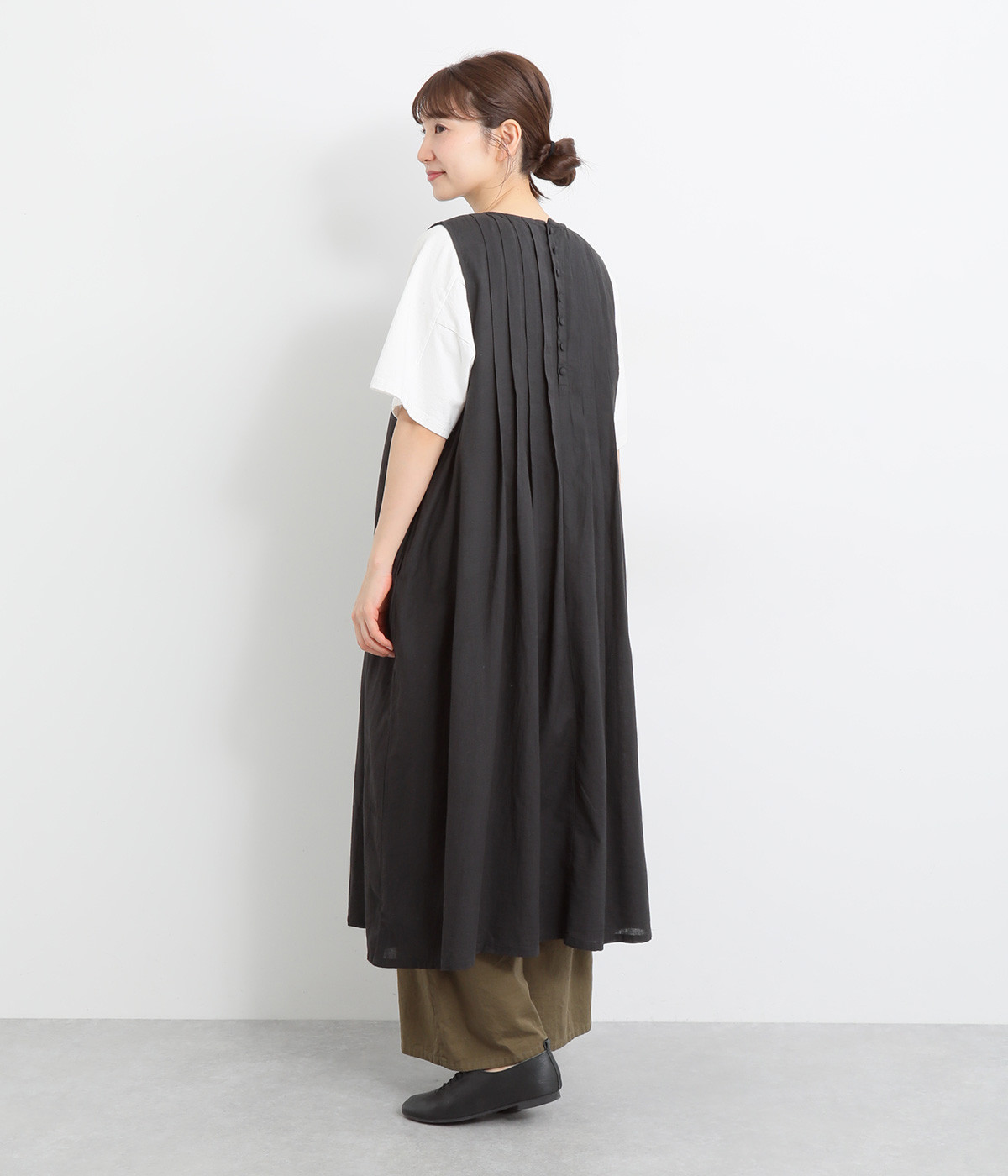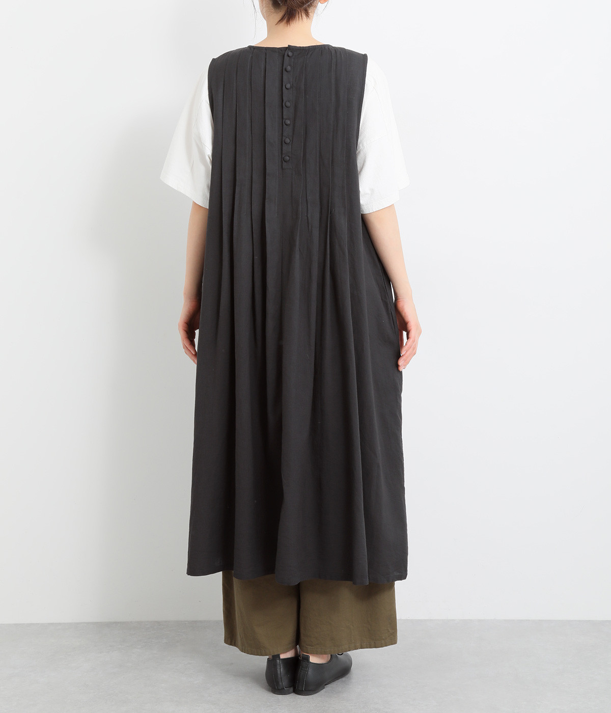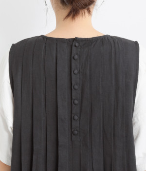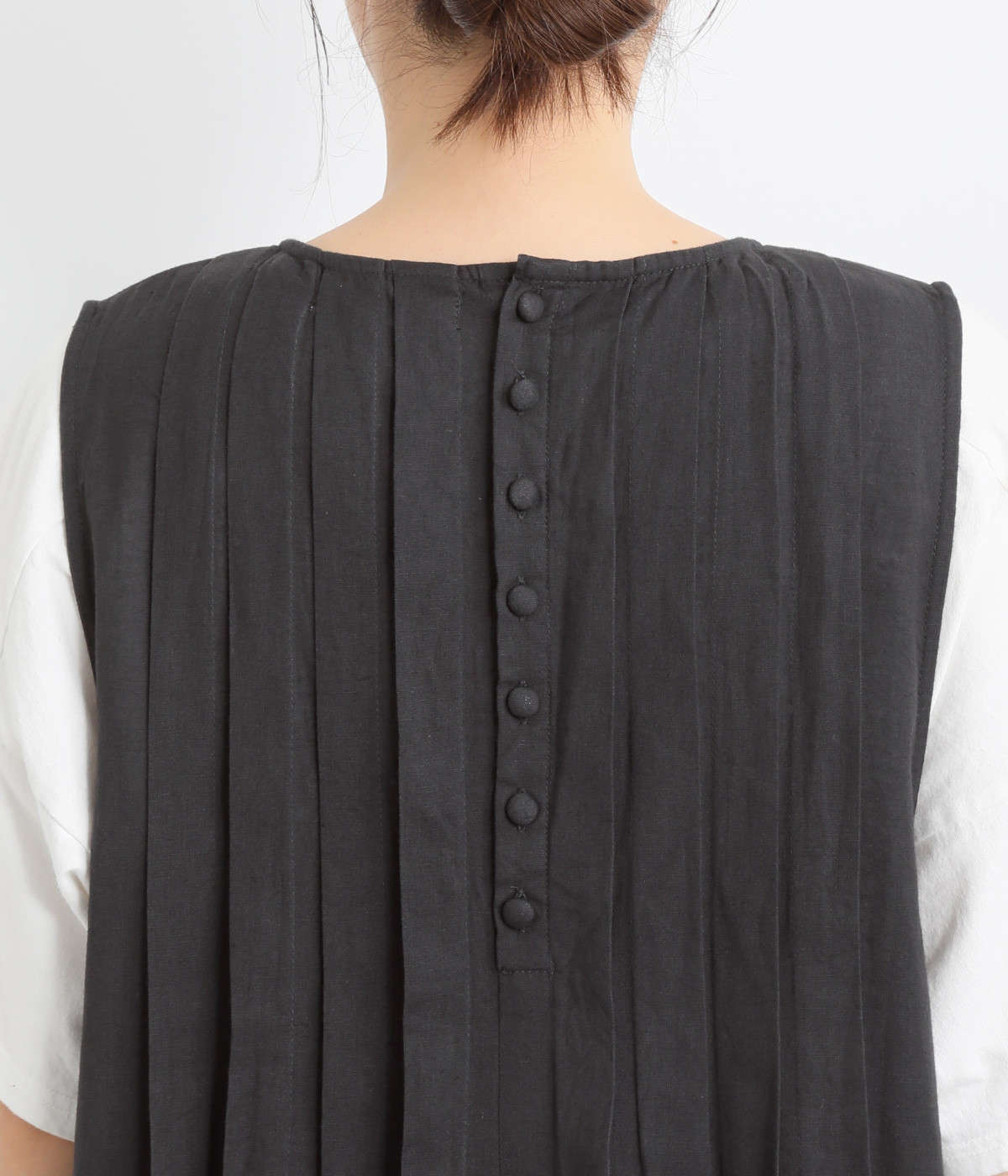 前身頃に大きく入ったタックで上品な印象に。ウエストあたりからタックを開放してふんわりとしたシルエットを作ります。アームホールが広いので合わせるインナーを選ばないのが優秀。背中にくるみボタンをあしらって後ろ姿にアクセントをプラスしました。