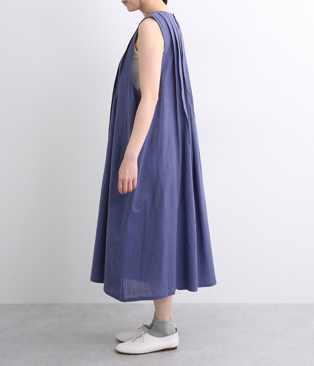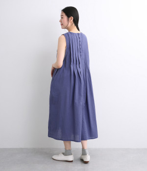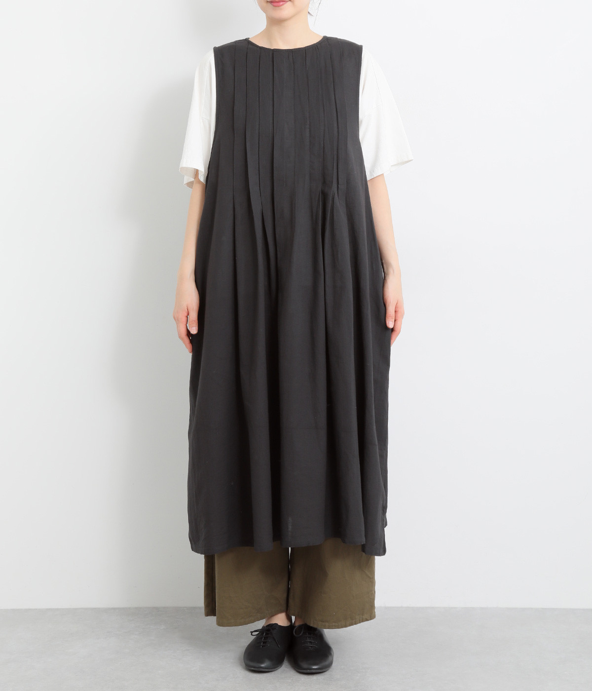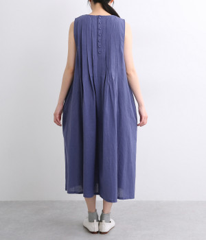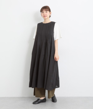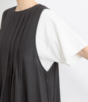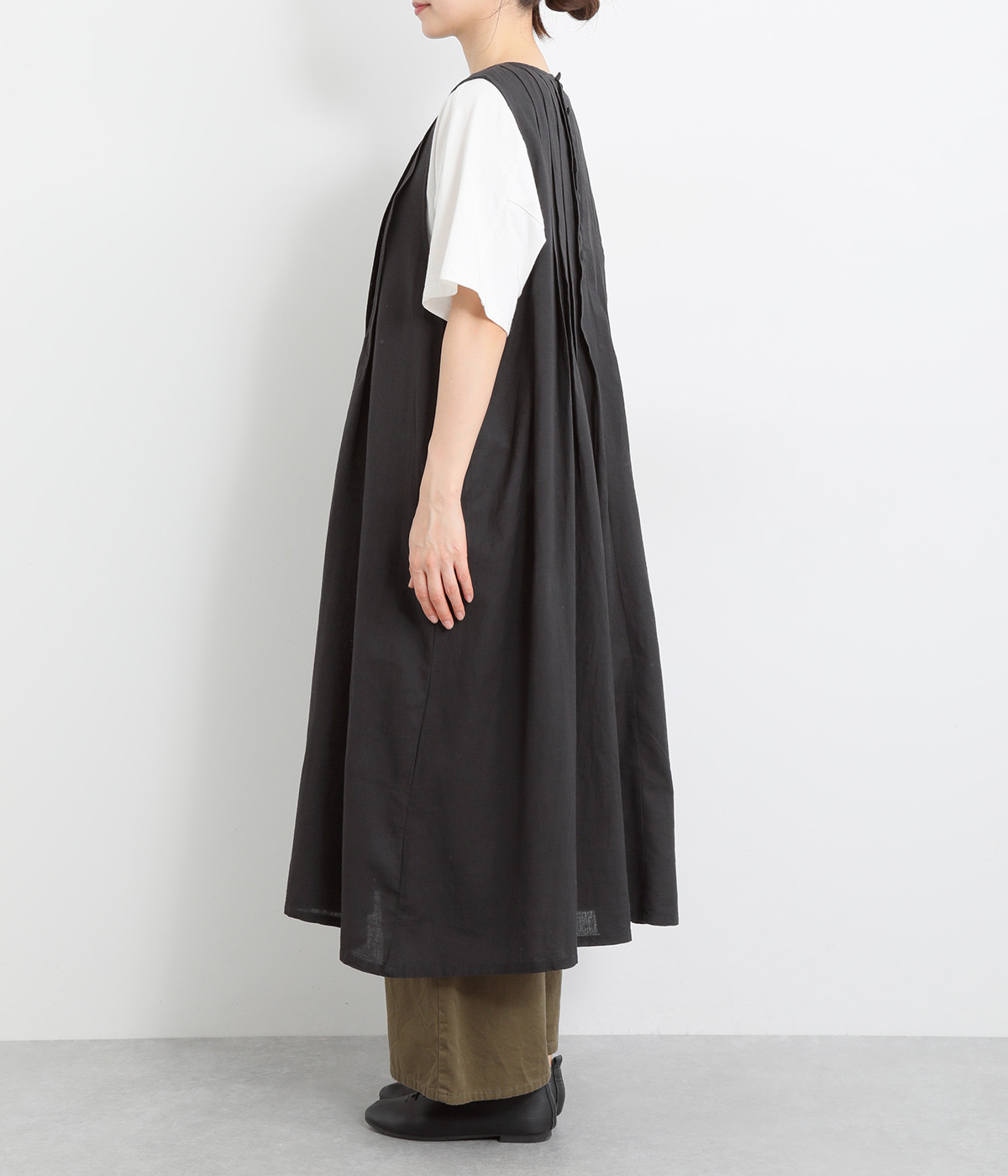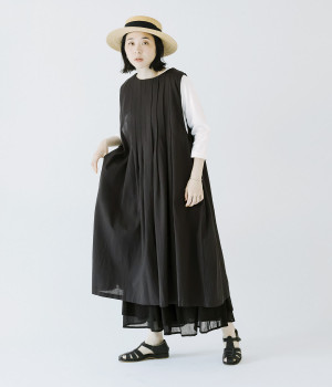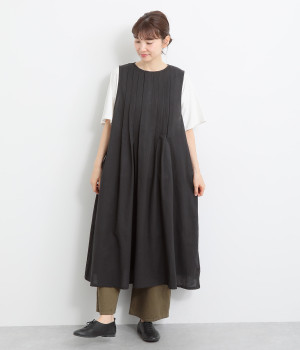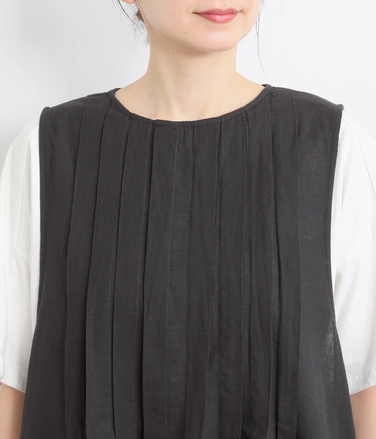 前身頃に大きく入ったタックで上品な印象に。ウエストあたりからタックを開放してふんわりとしたシルエットを作ります。アームホールが広いので合わせるインナーを選ばないのが優秀。背中にくるみボタンをあしらって後ろ姿にアクセントをプラスしました。
