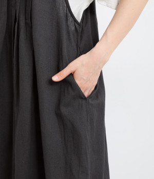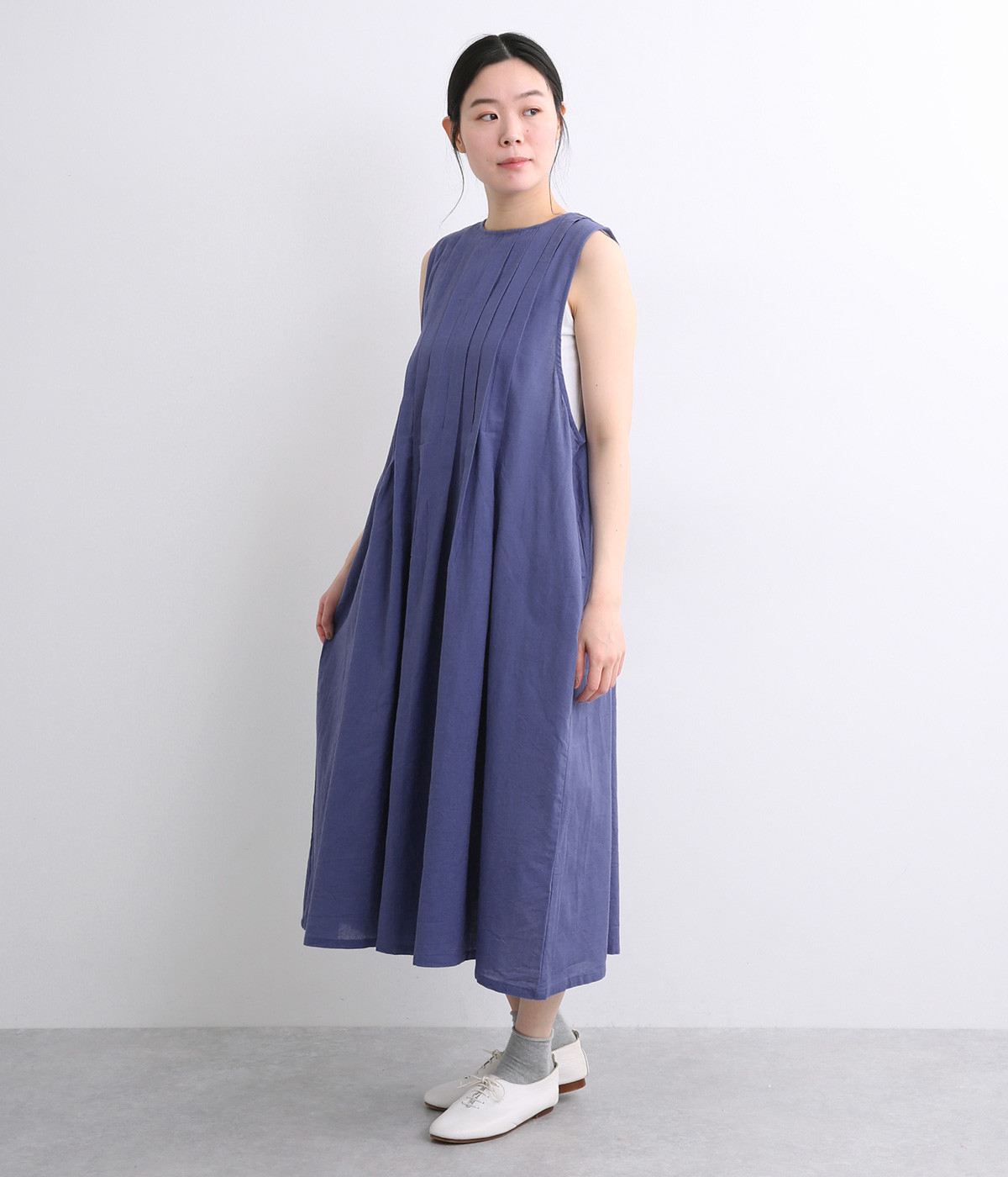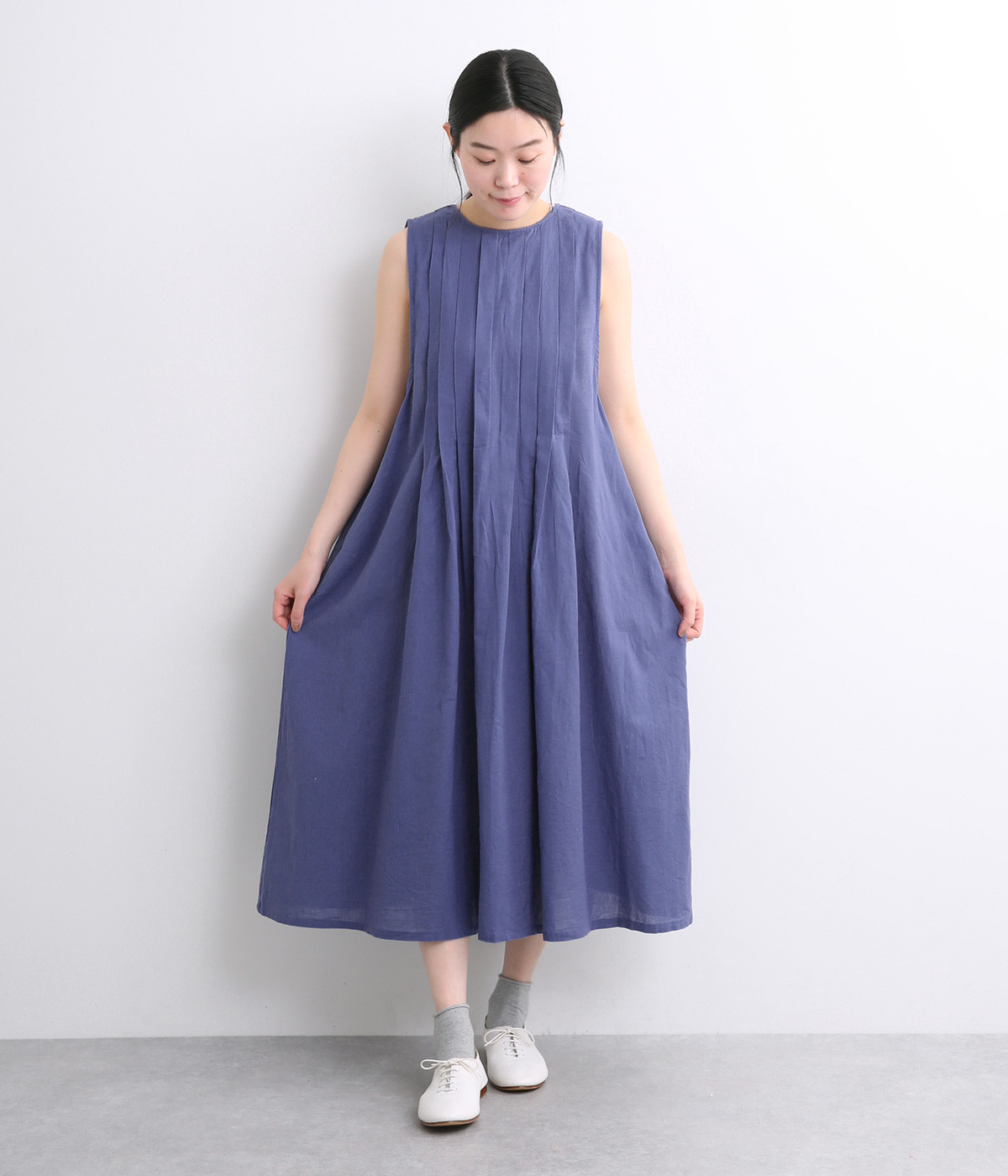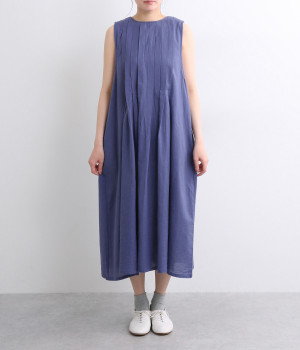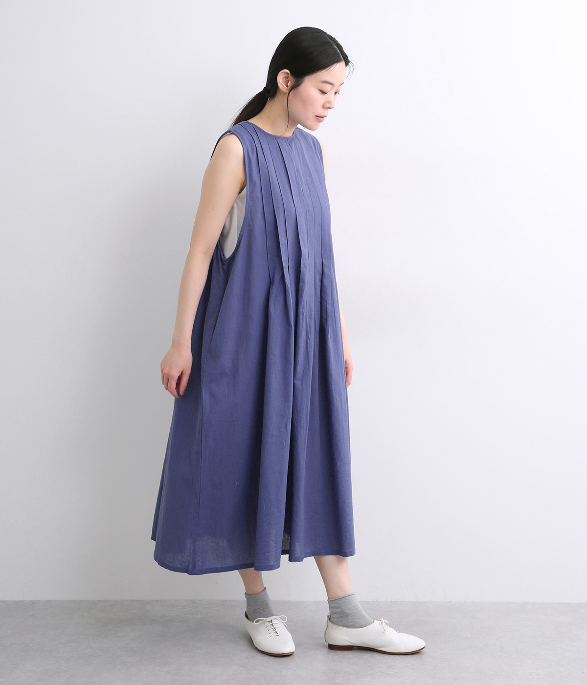 前身頃に大きく入ったタックで上品な印象に。ウエストあたりからタックを開放してふんわりとしたシルエットを作ります。アームホールが広いので合わせるインナーを選ばないのが優秀。背中にくるみボタンをあしらって後ろ姿にアクセントをプラスしました。