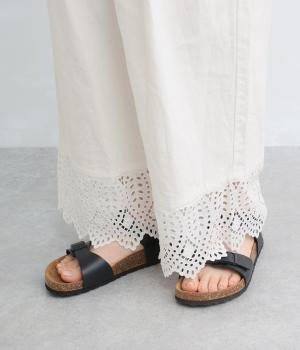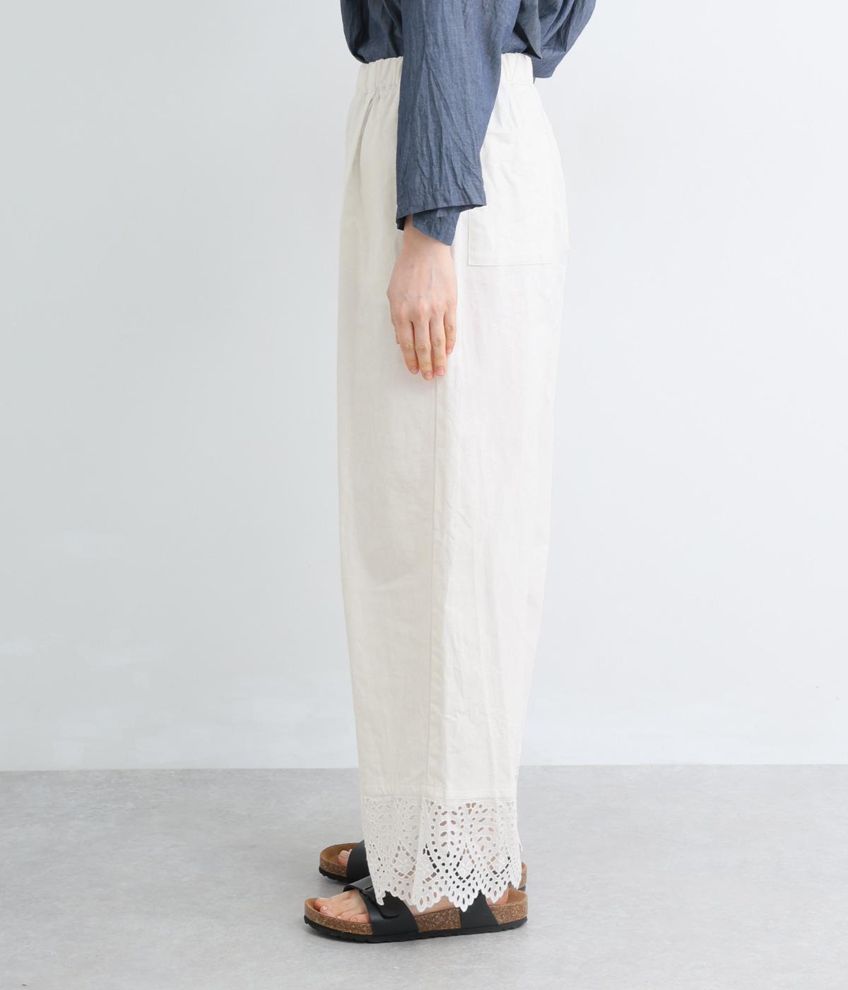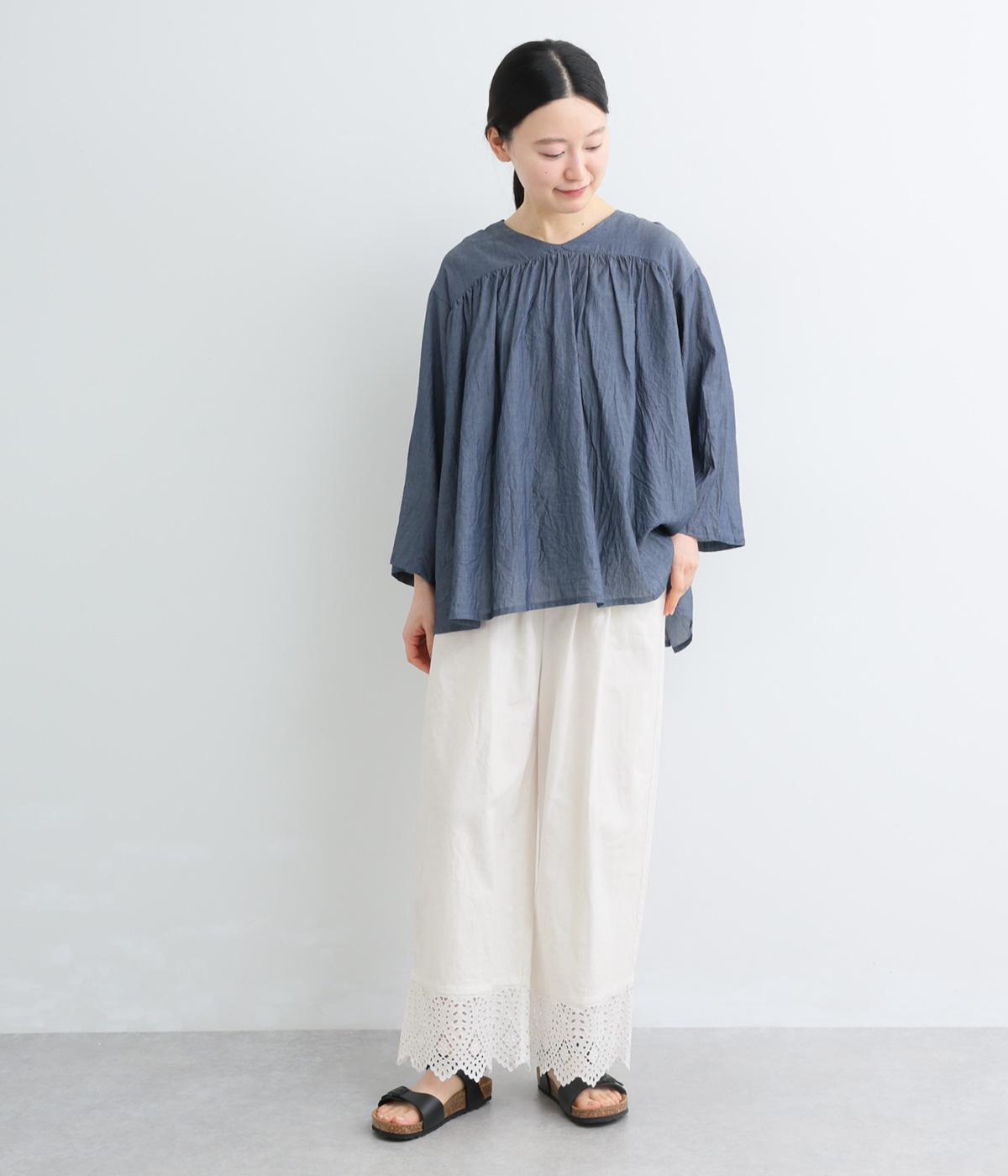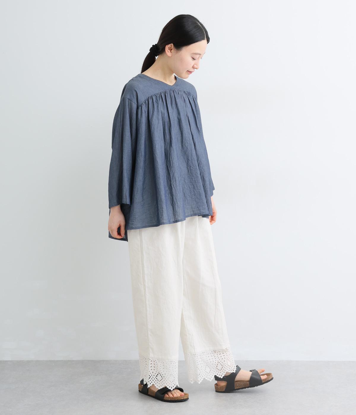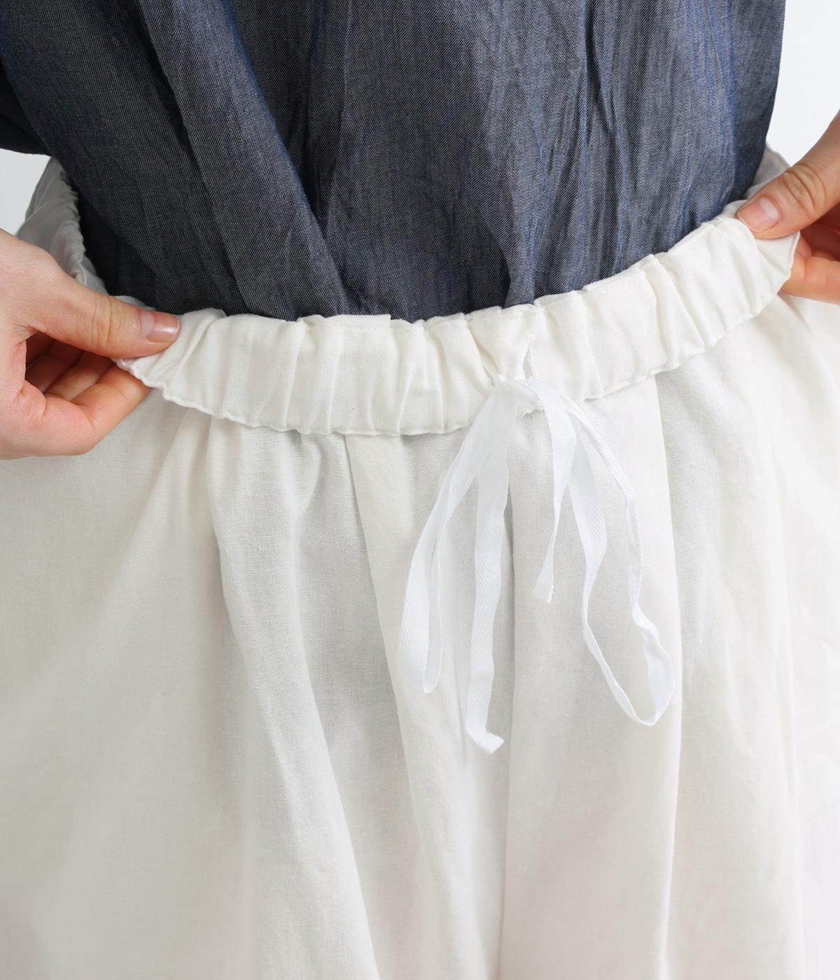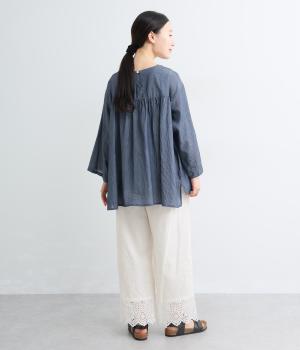 ややハリのある、さらりとした肌ざわりのリネンコットンをベースに仕立てました。裾は爽やかな透け感の出るレースで切り替えてます。
