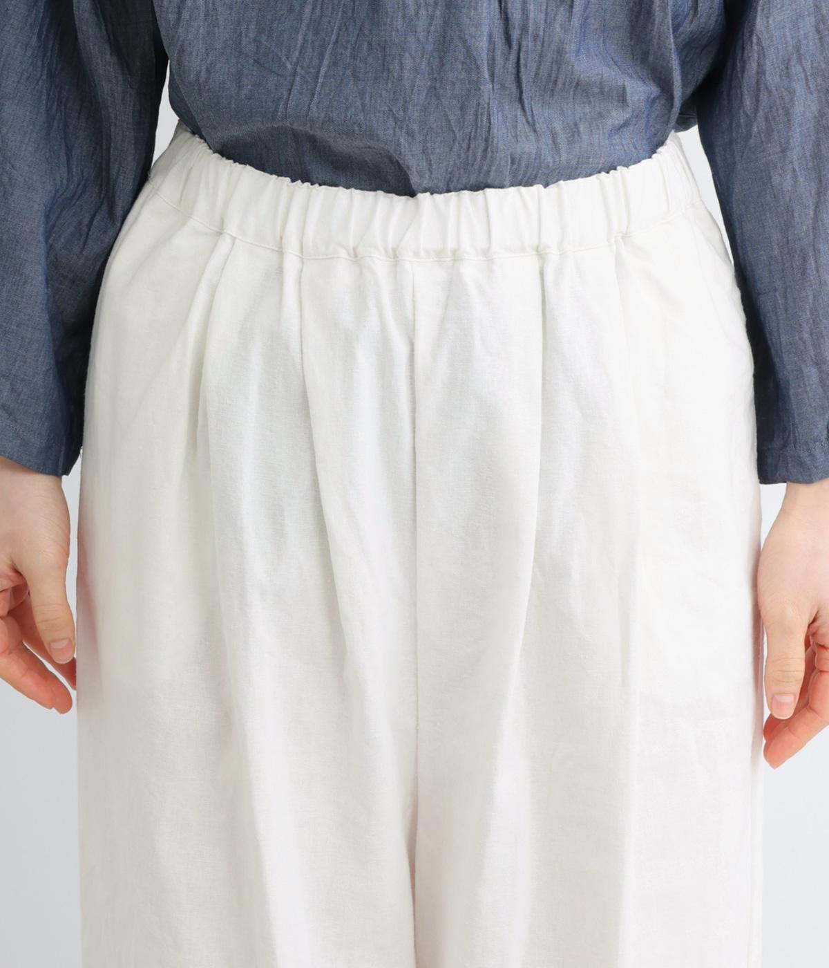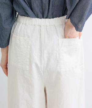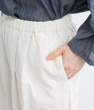 足のラインを拾いにくい、ゆったりとしたシルエットのパンツです。ワンピースやロングシャツとのレイヤードがおすすめ。ウエストは着脱が楽な総ゴム仕様で、内側の紐で楽に調節が可能です。