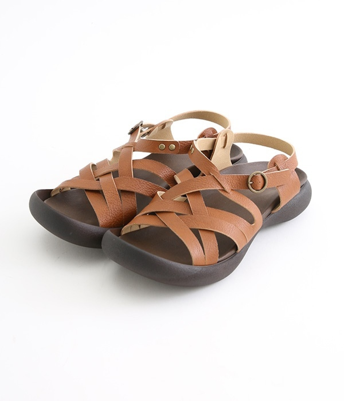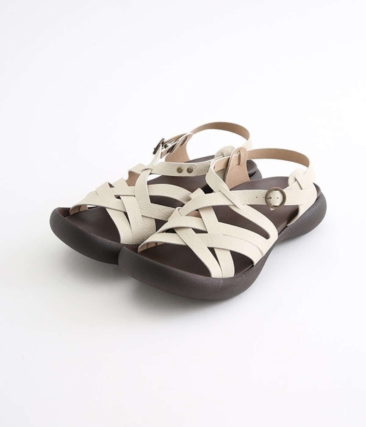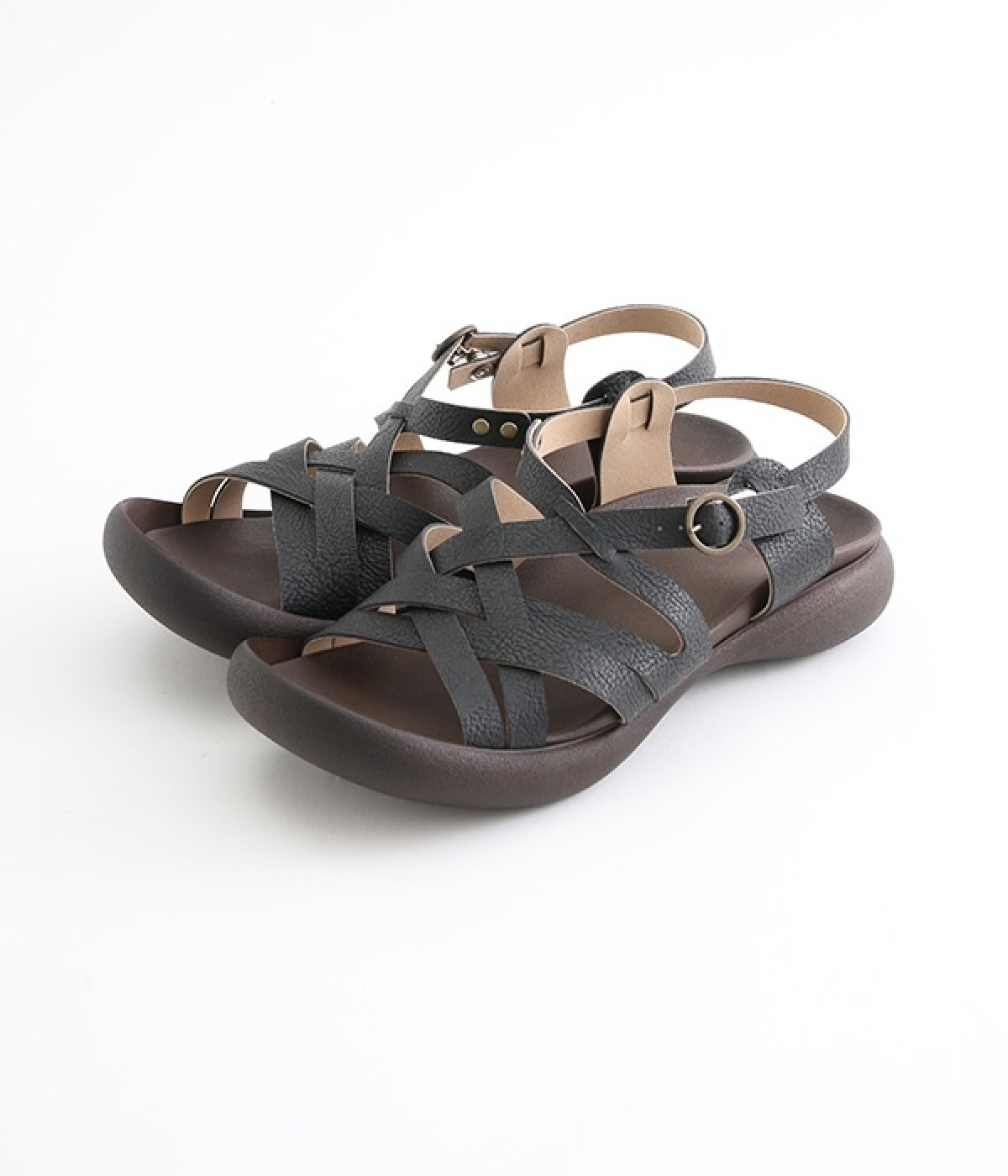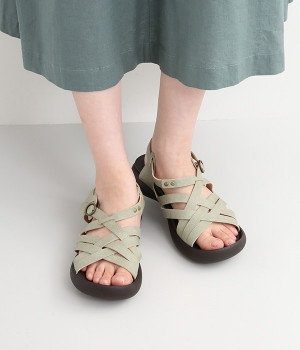 編み込み風のクロスベルトが涼し気なサンダルです。足の甲をしっかりホールドしているため歩きやすく、抜け感があるデザインがポイント。土踏まずがふくらんだインソールなのでフィット感もよく。柔らかく包み込むようなはき心地です。素足ではくのはもちろん、靴下と合わせたコーディネートも素敵。合成革ならではの扱いやすさと軽さもうれしいポイントです。ストラップ部分はホック開閉。ベルト穴で長さ調節も可能です。