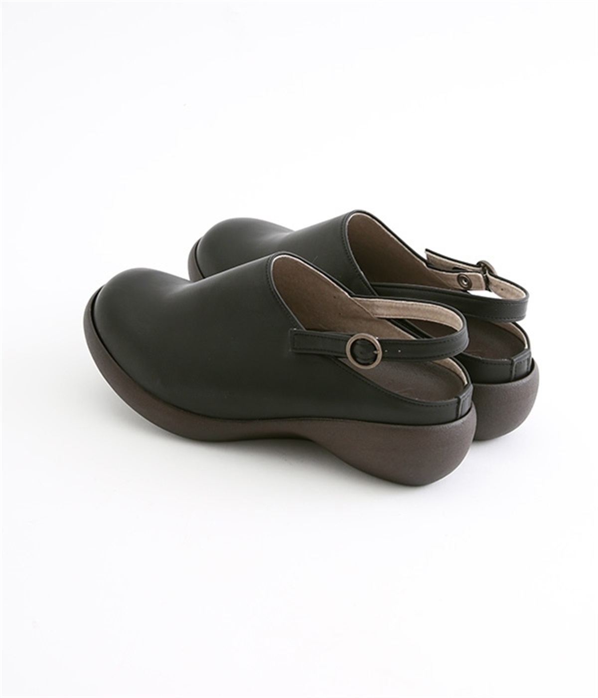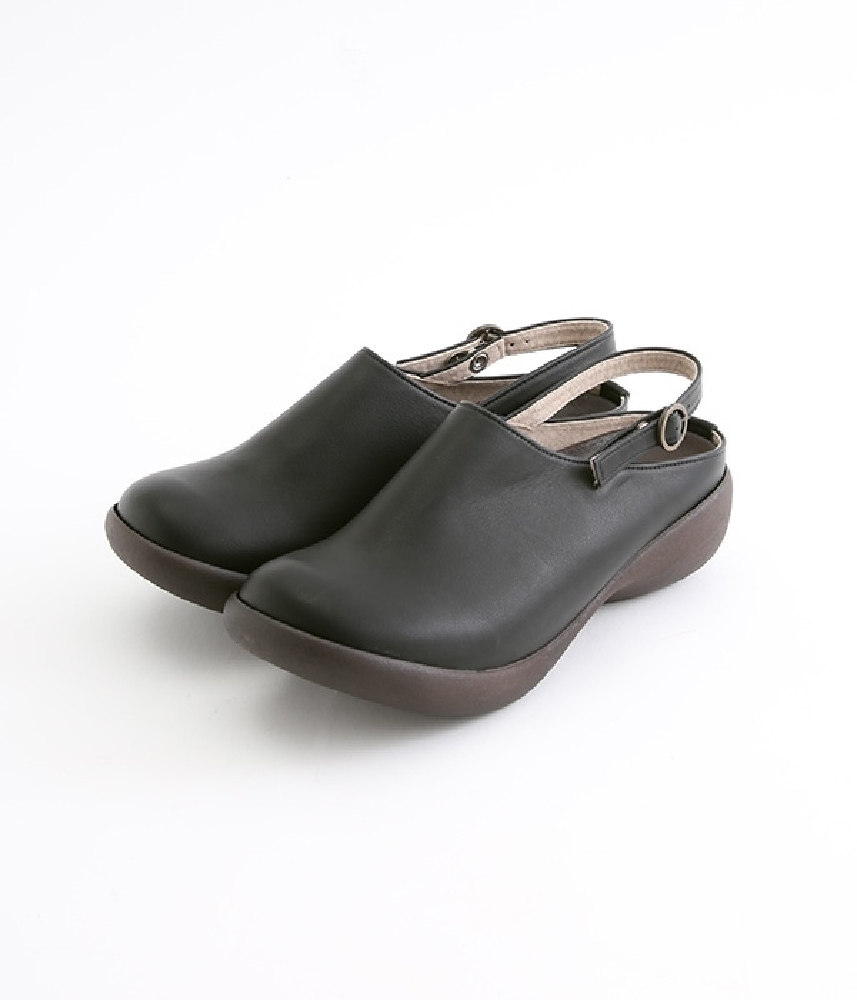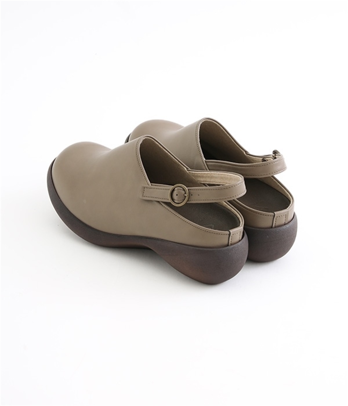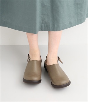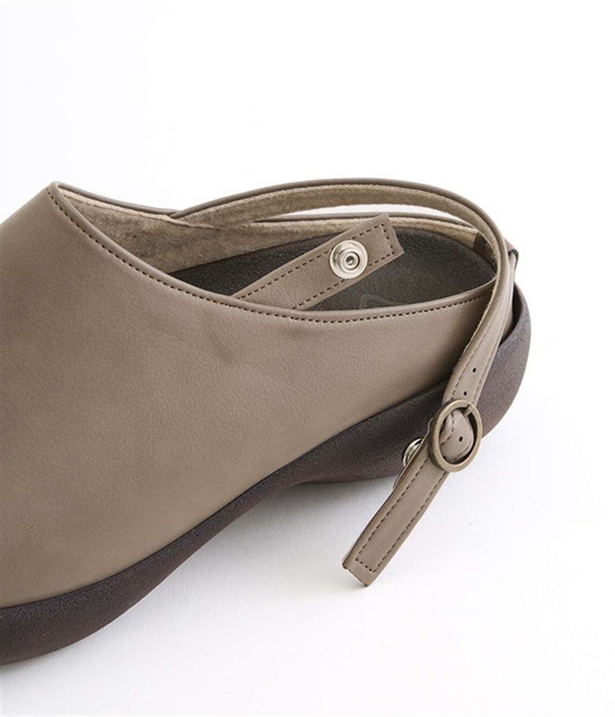 マットな風合いが大人シックな、サボサンダルです。土踏まずがふくらんだインソールはフィット感もよく。柔らかく包み込むようなはき心地。素足ではくのはもちろん、靴下と合わせたコーディネートも素敵。合成革ならではの扱いやすさと軽さもうれしいポイントです。ストラップ部分はホック開閉。ベルト穴で長さ調節も可能です。