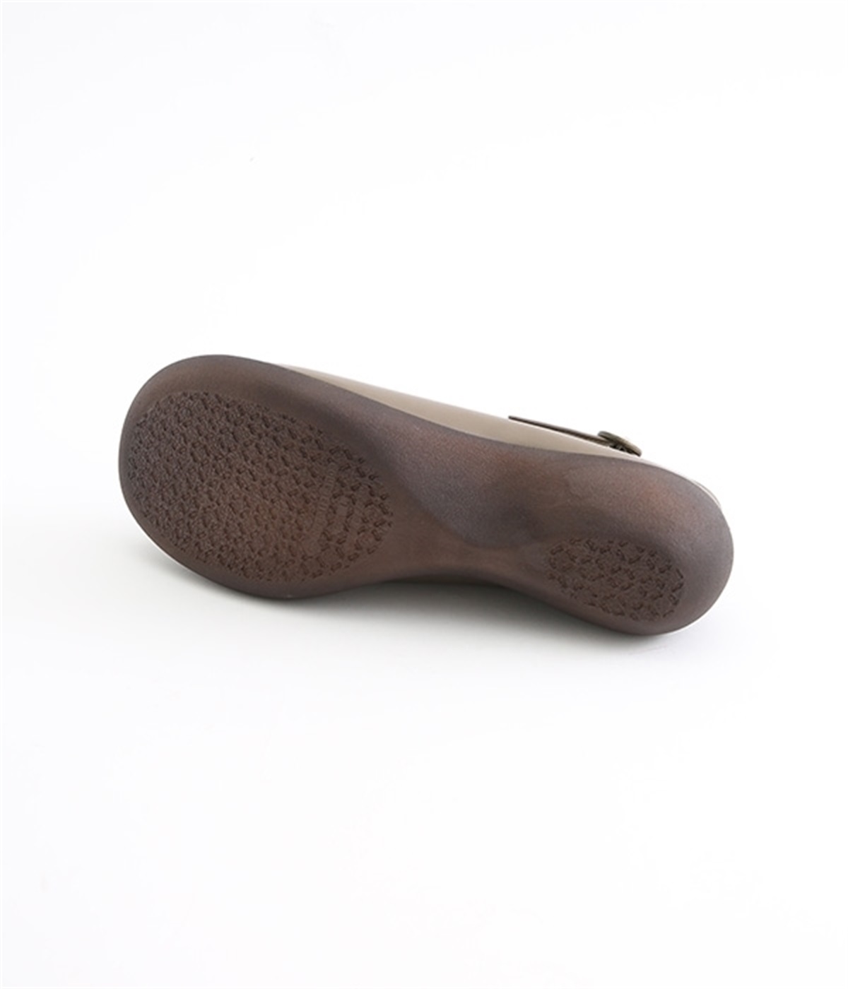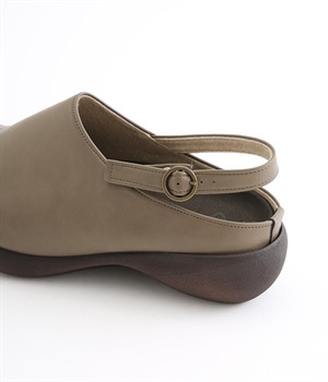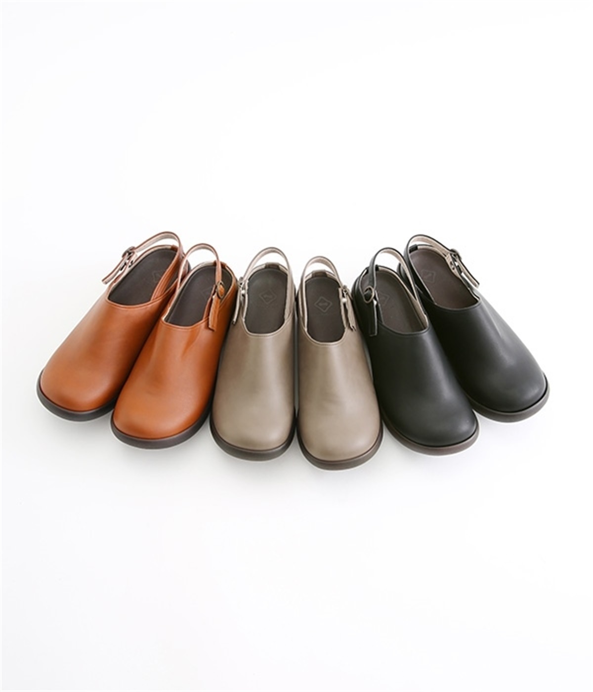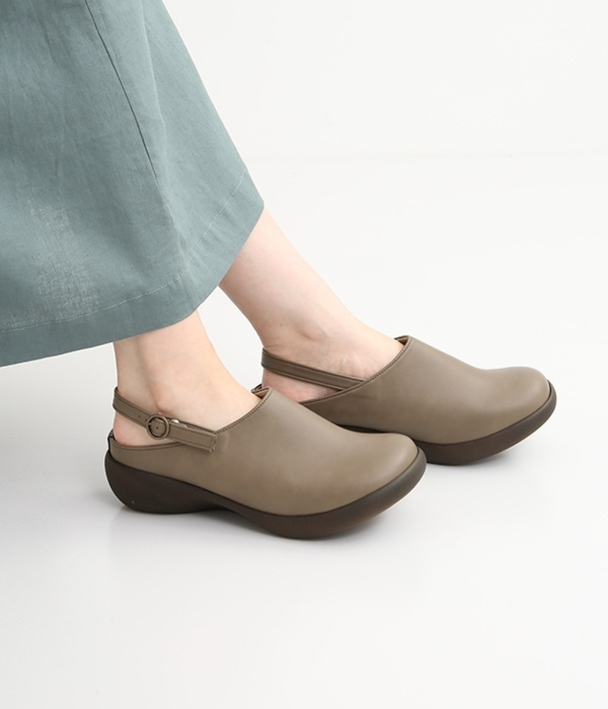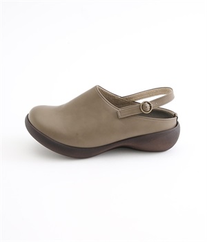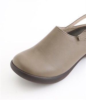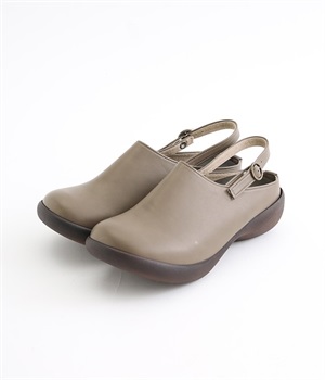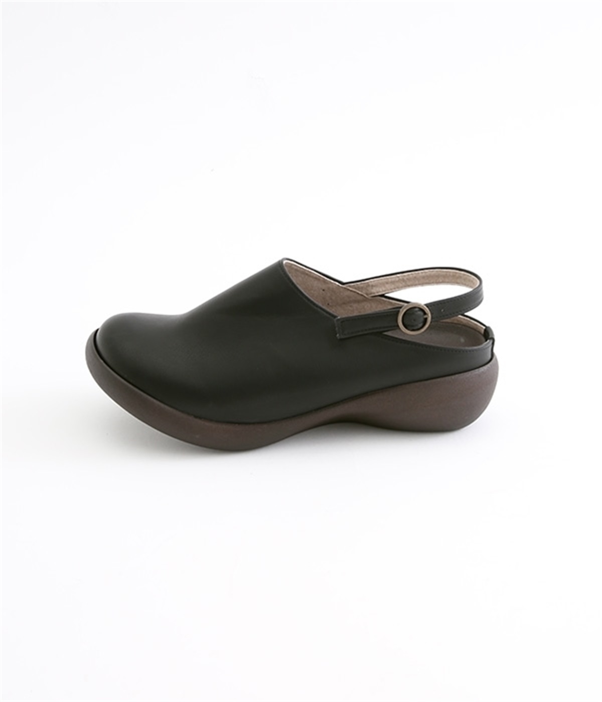 マットな風合いが大人シックな、サボサンダルです。土踏まずがふくらんだインソールはフィット感もよく。柔らかく包み込むようなはき心地。素足ではくのはもちろん、靴下と合わせたコーディネートも素敵。合成革ならではの扱いやすさと軽さもうれしいポイントです。ストラップ部分はホック開閉。ベルト穴で長さ調節も可能です。