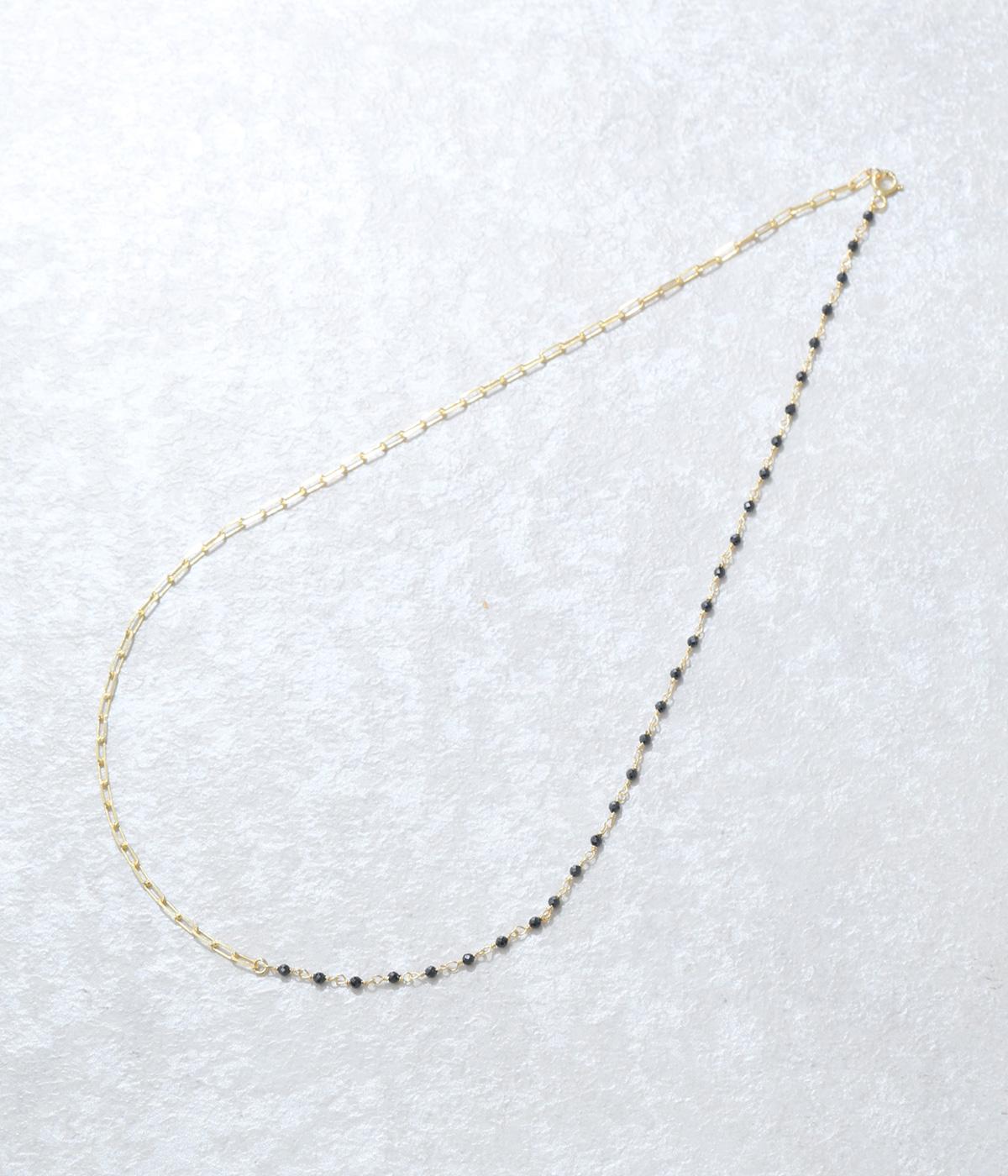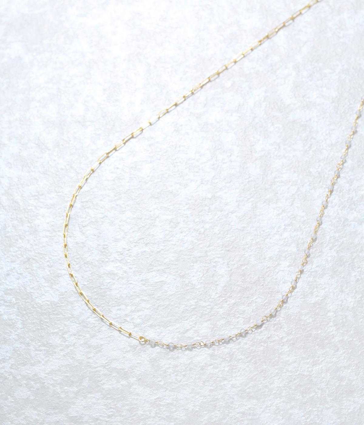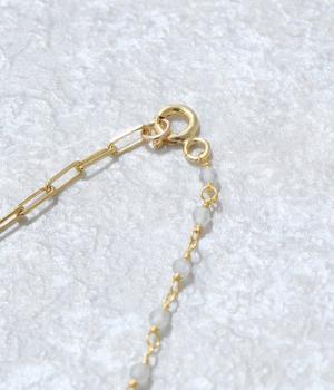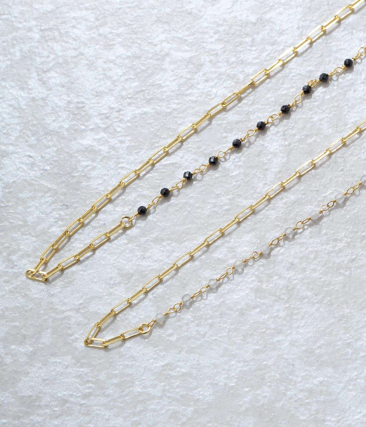 【素材】品の良い光沢が特徴的なブラックオニキスと、半透明で肌なじみのよいムーンストーンを使用しました。【デザイン】小粒のブラックオニキスとムーンストーンを、ゴールドのチェーンと組み合わせたネックレスです。チェーンにも変化を持たせ、胸元のアクセントとしてぴったりのアイテムに。ギフトにもおすすめです。